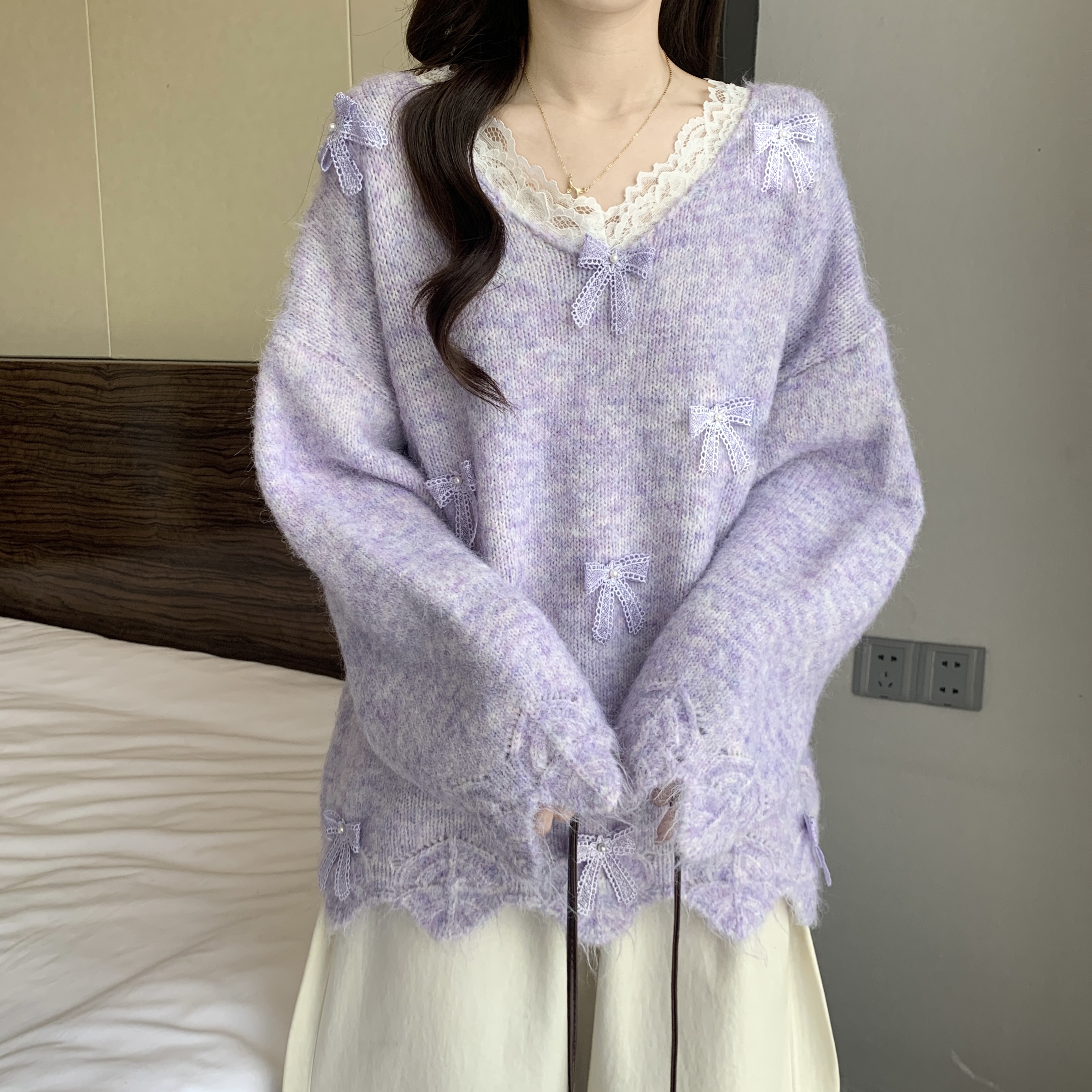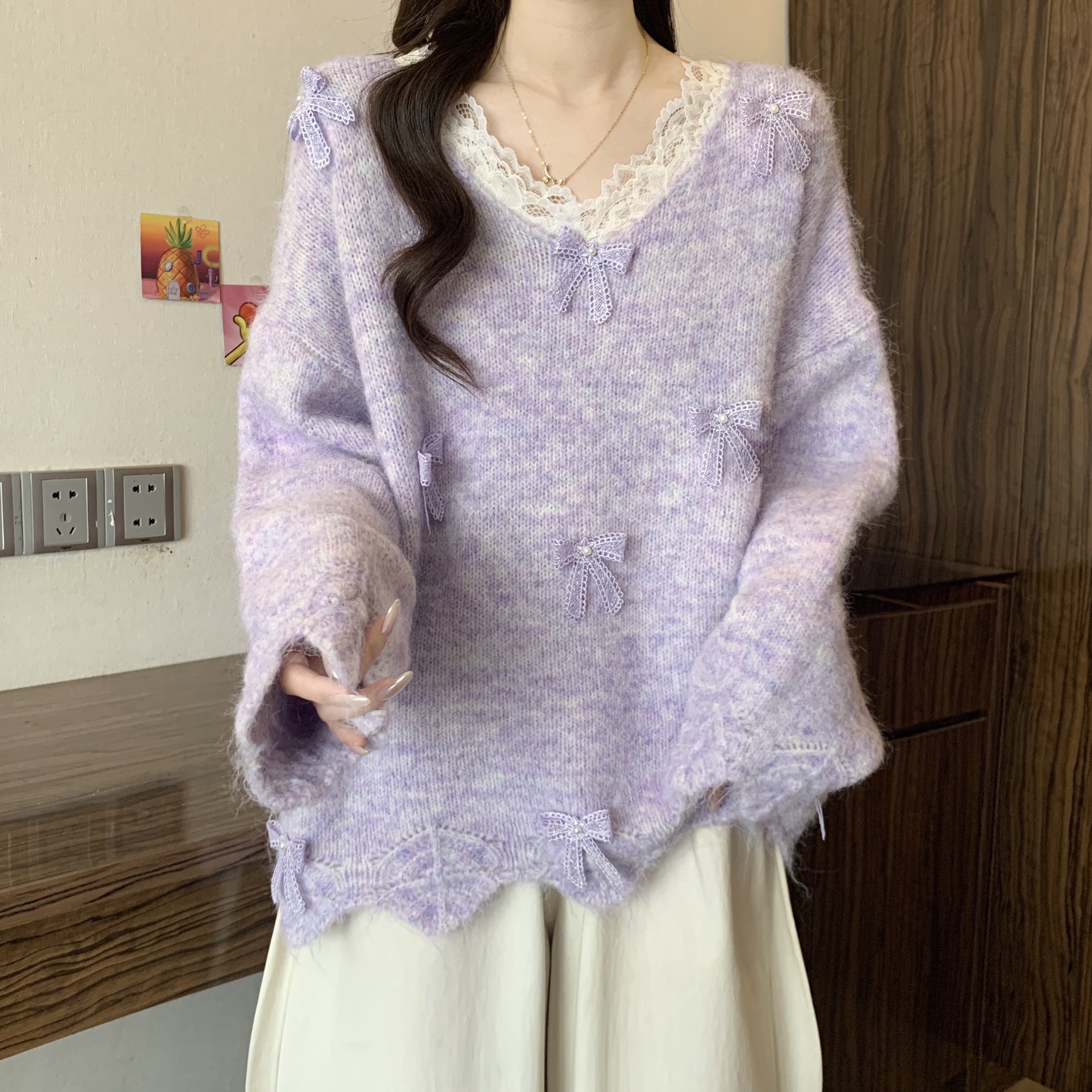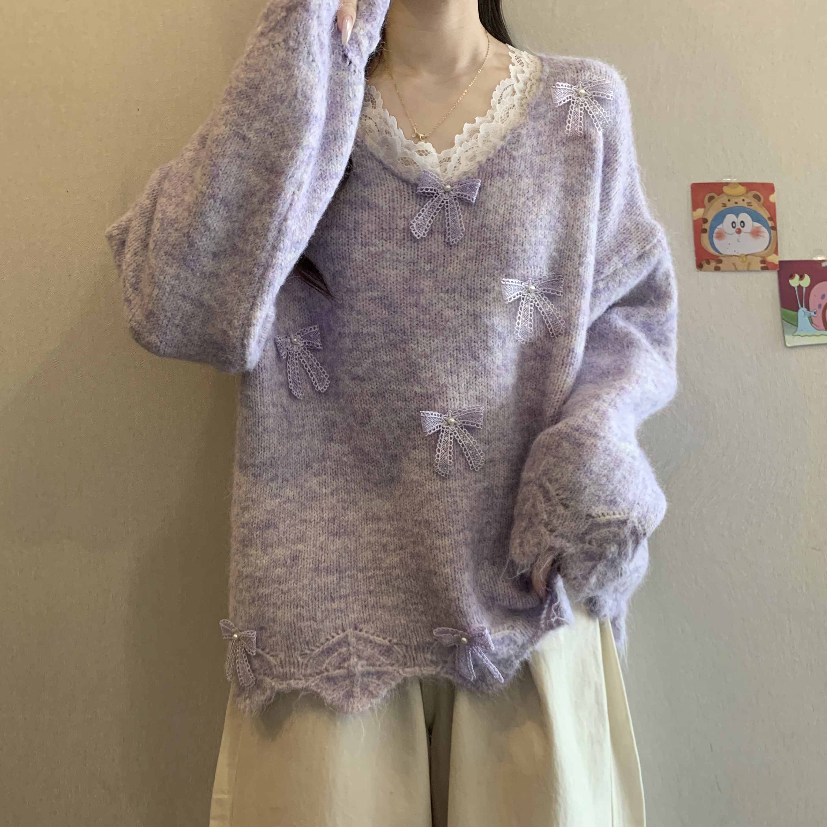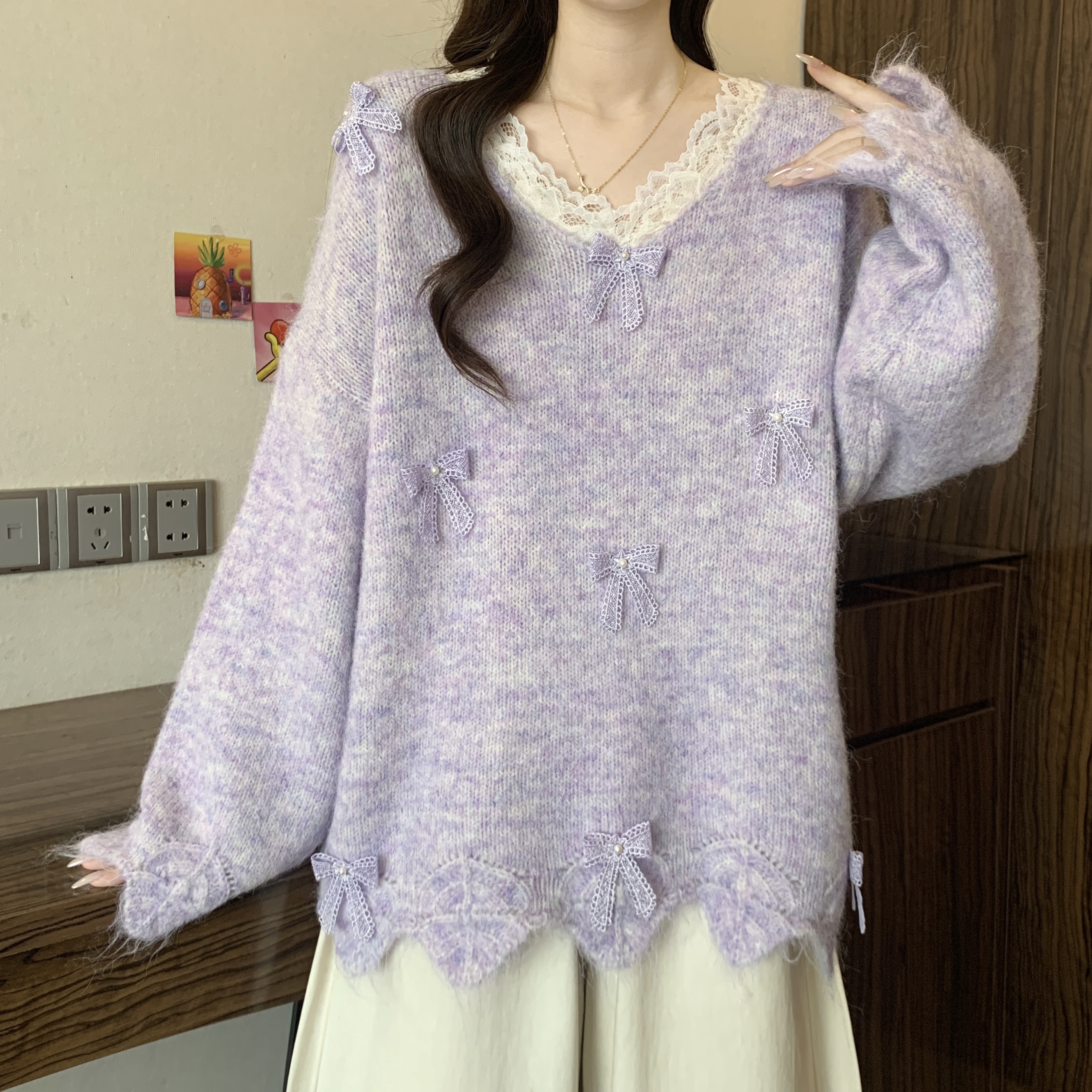 紫色花邊V領蝴蝶結針織衫毛衣女2025新款大碼胖mm軟糯巨好看上衣