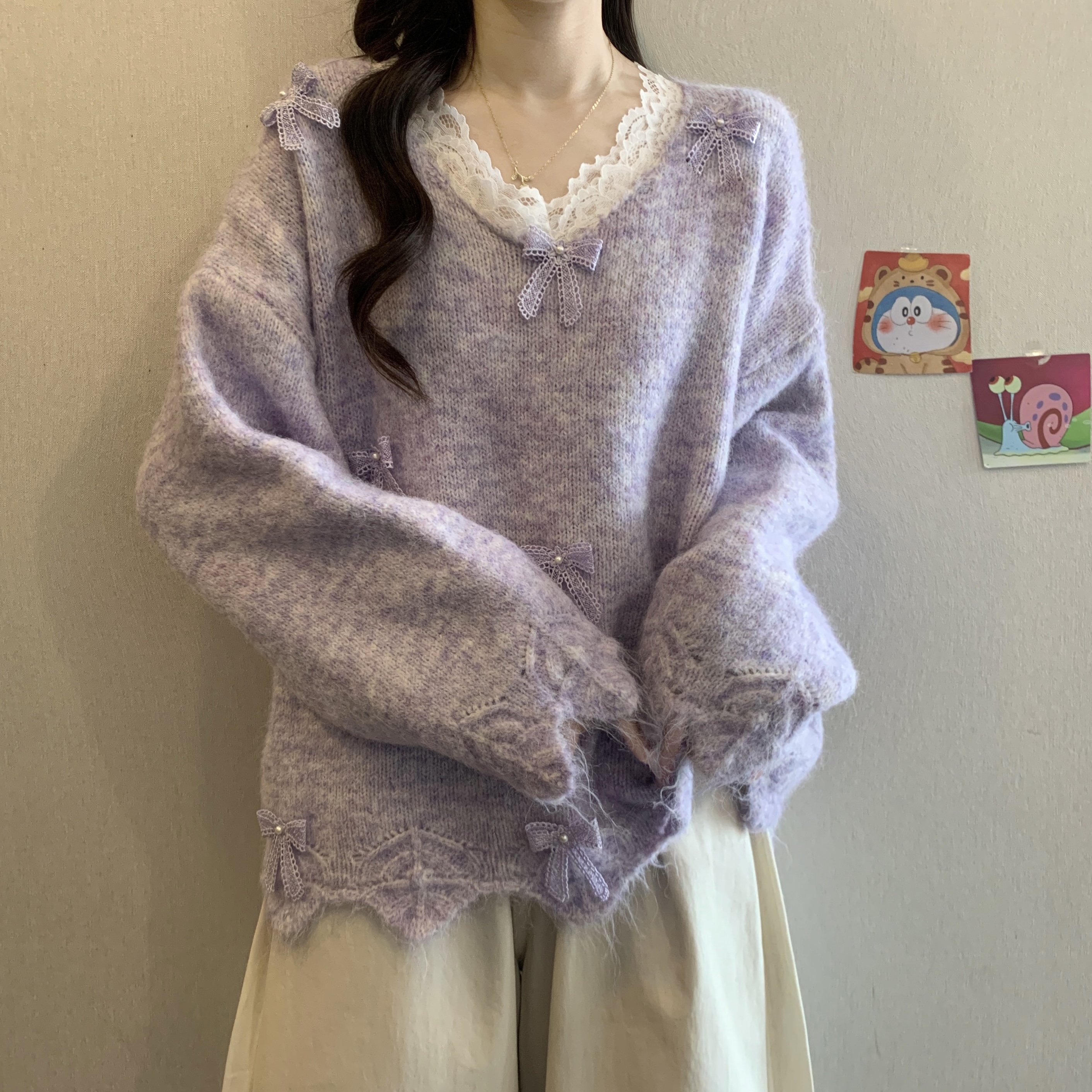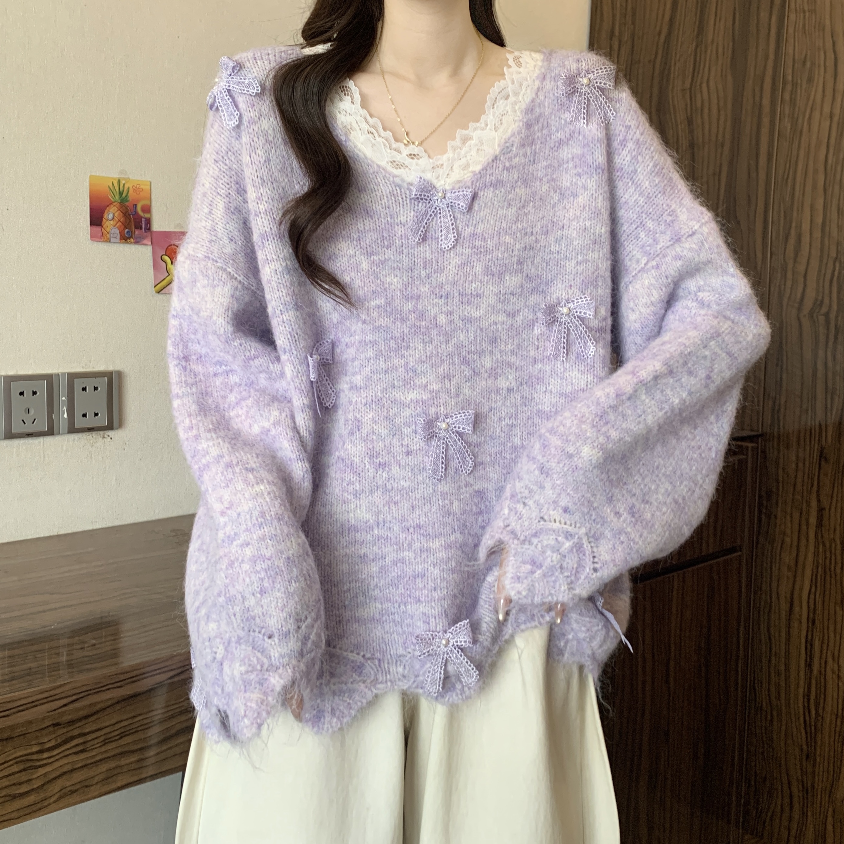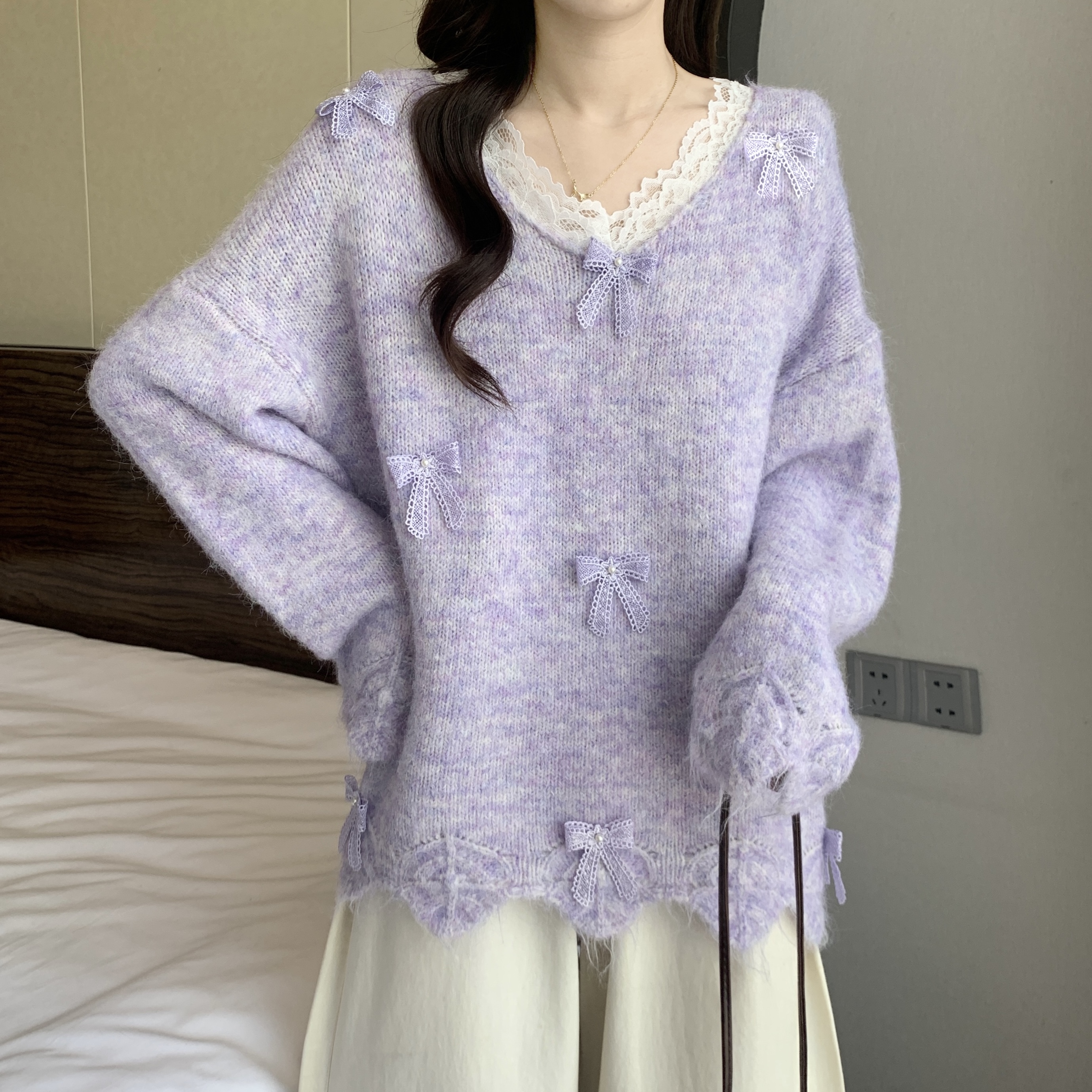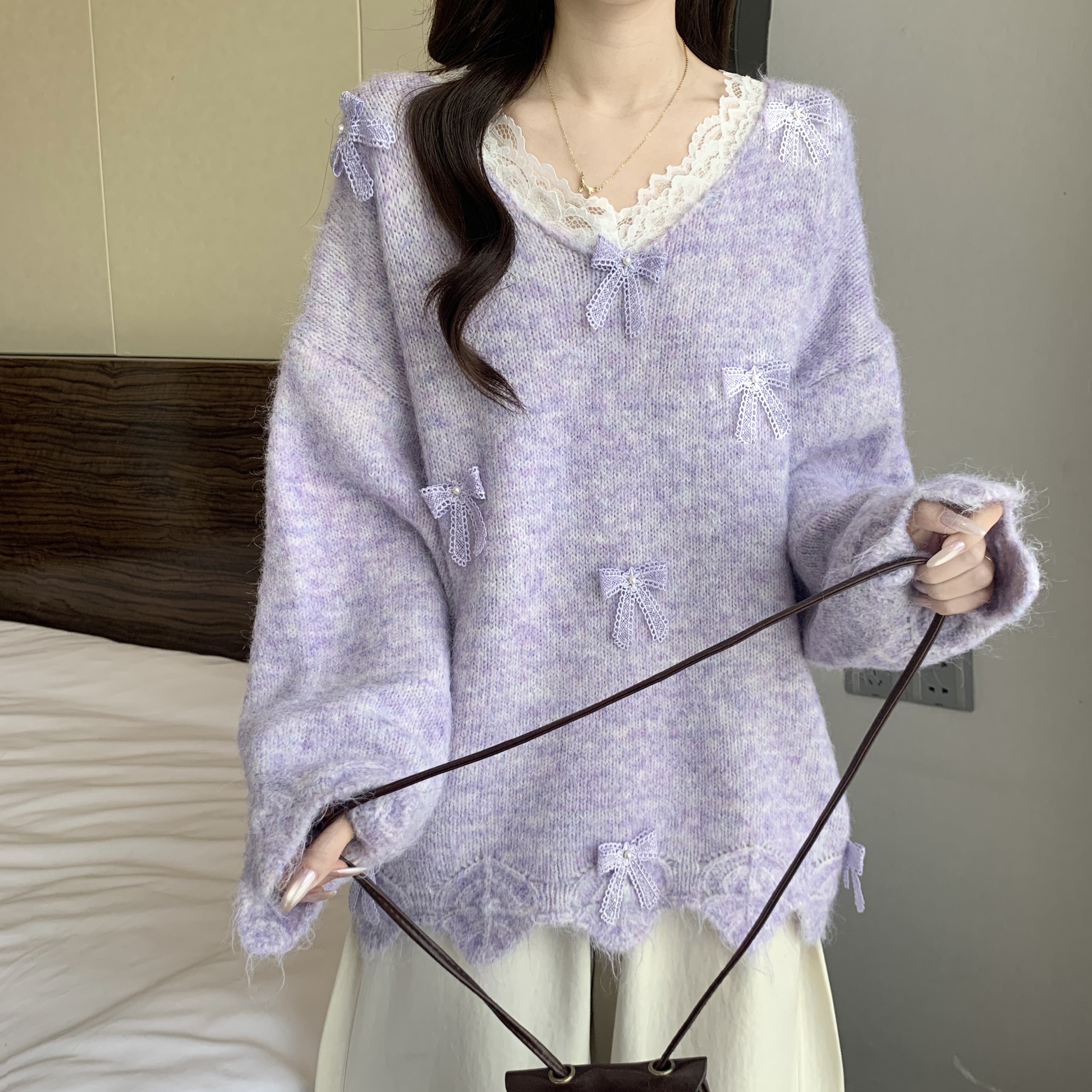 紫色花邊V領蝴蝶結針織衫毛衣女2025新款大碼胖mm軟糯巨好看上衣