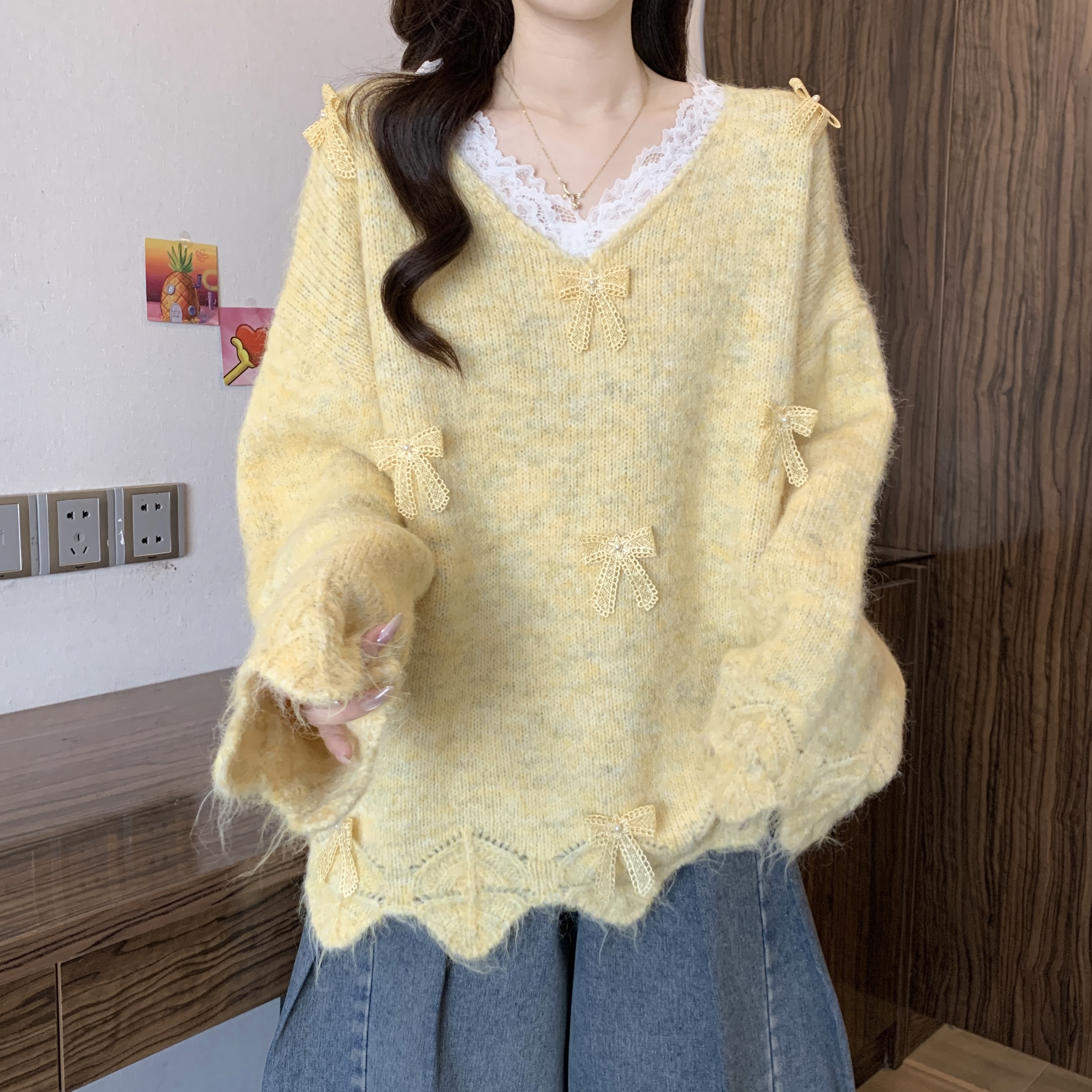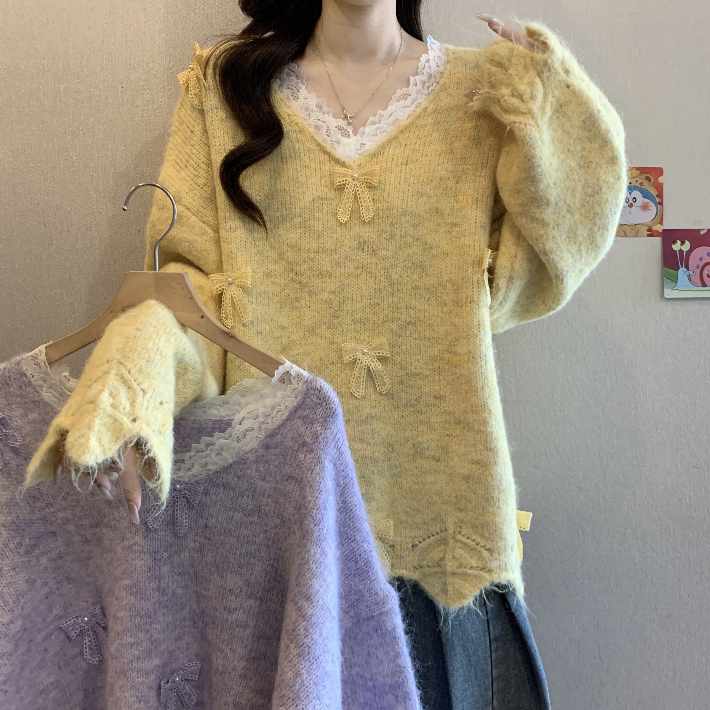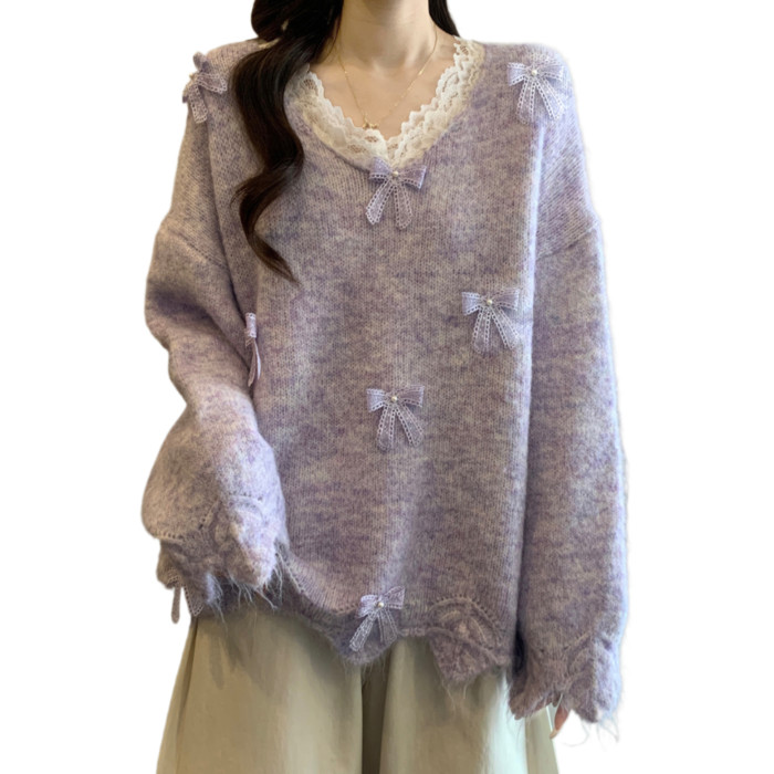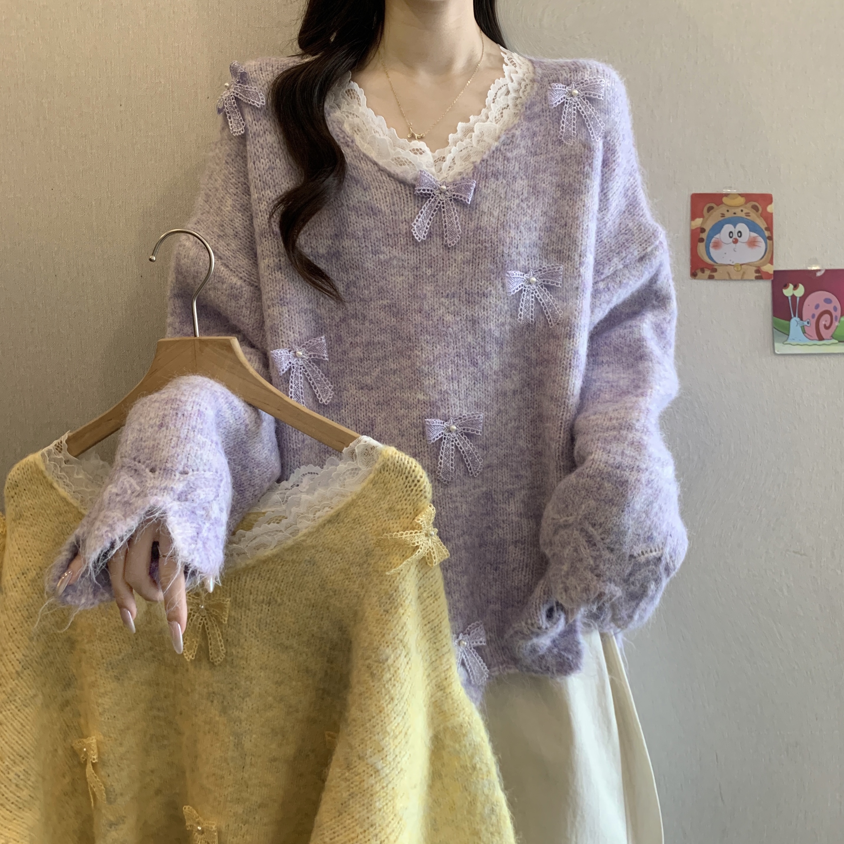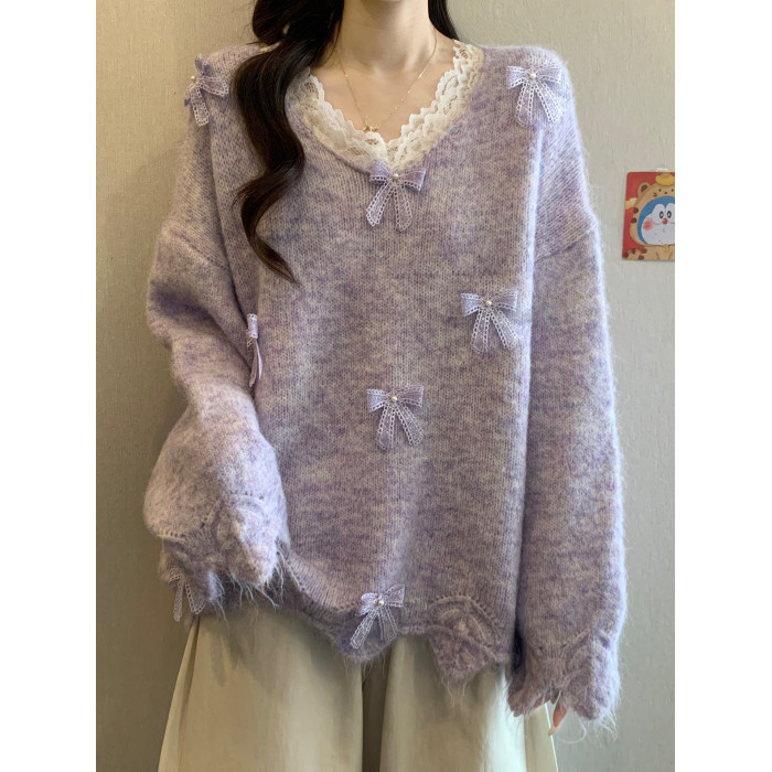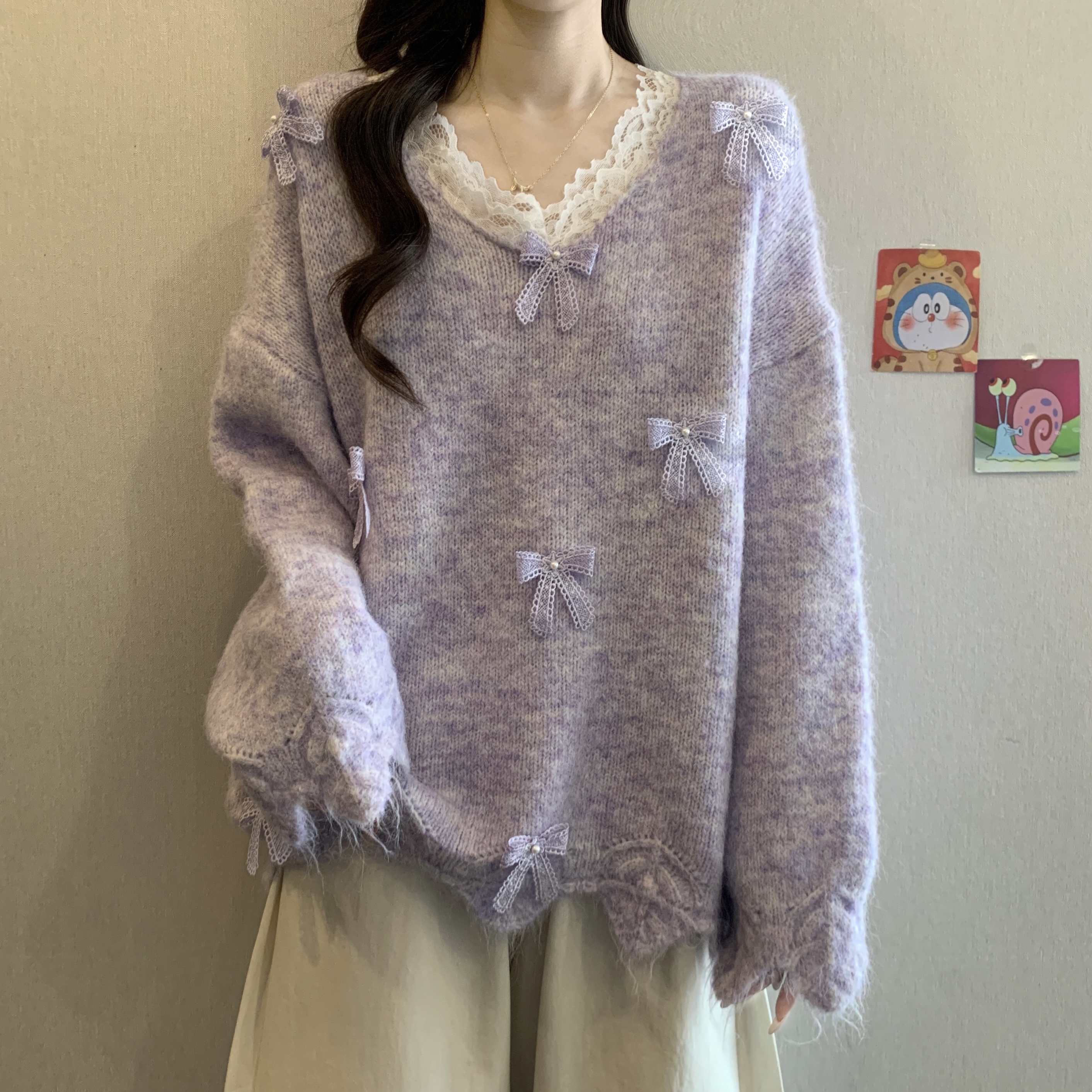 紫色花邊V領蝴蝶結針織衫毛衣女2025新款大碼胖mm軟糯巨好看上衣