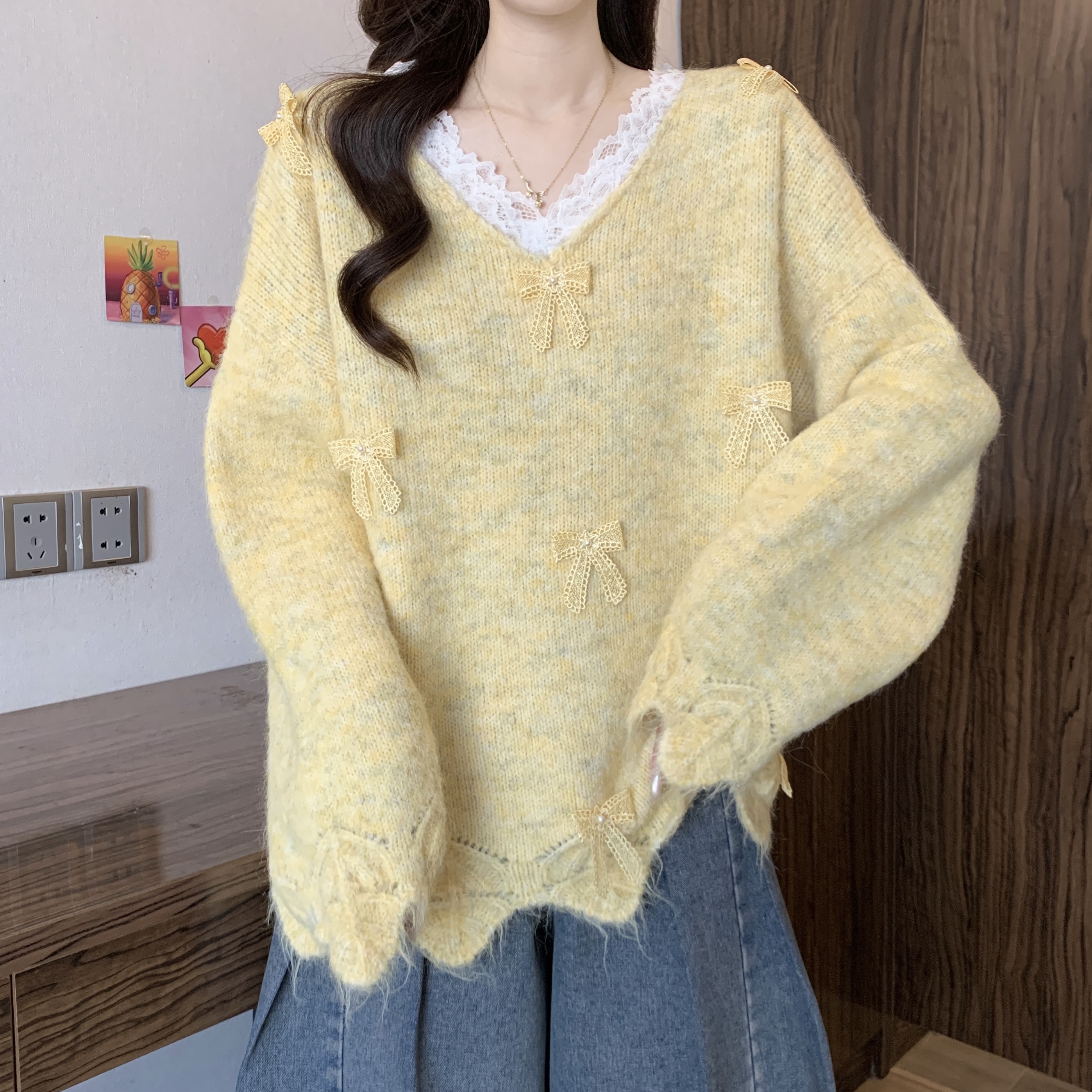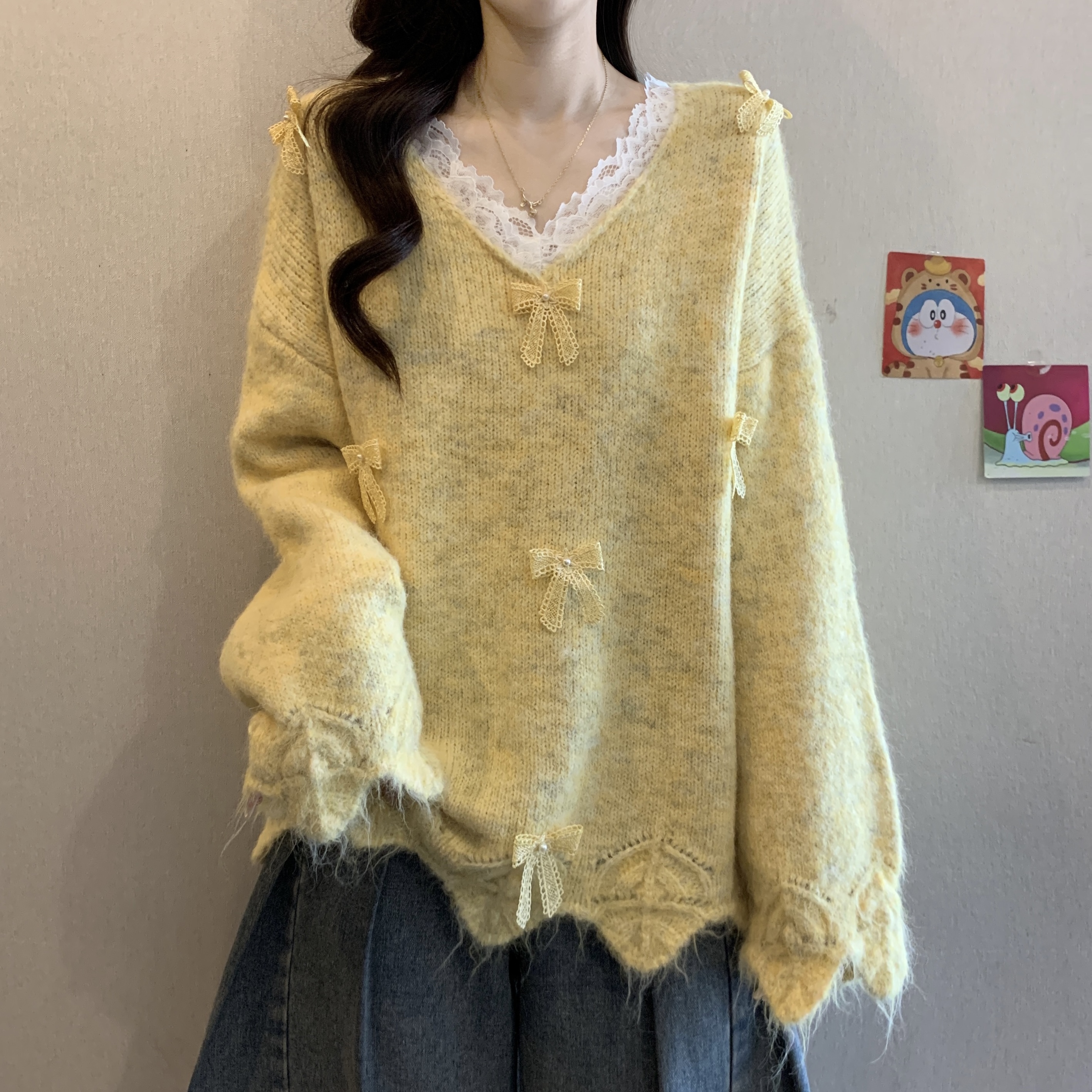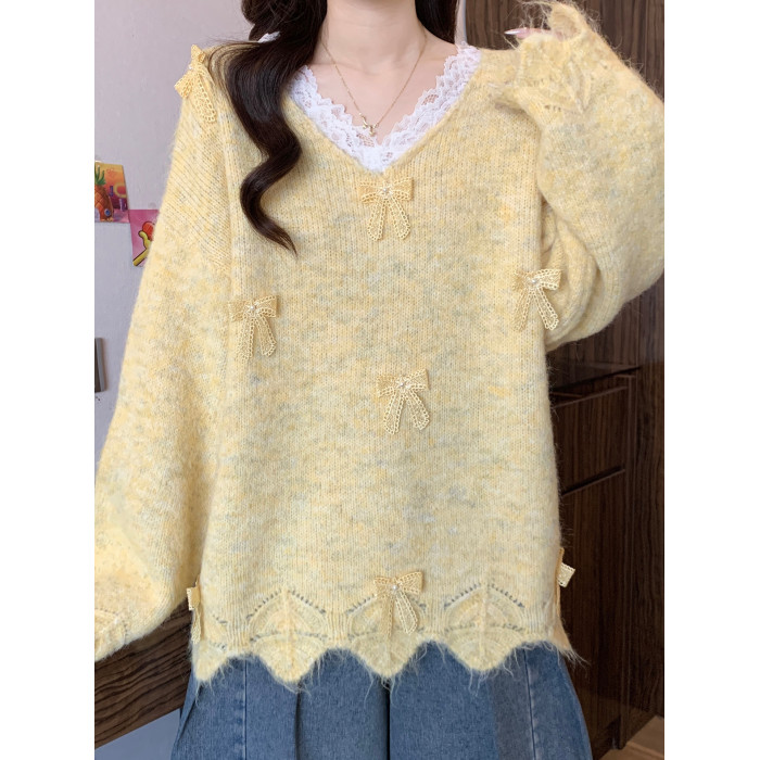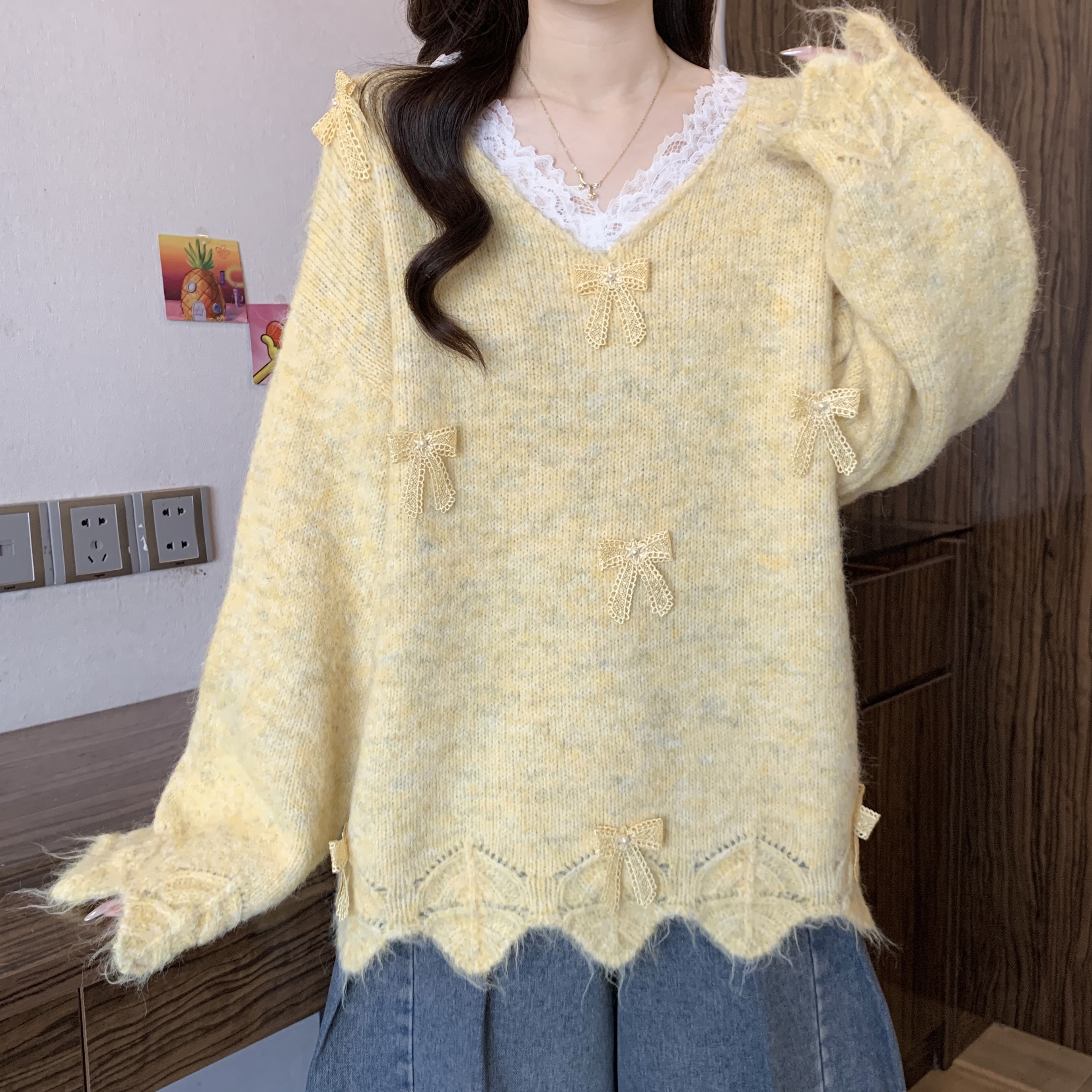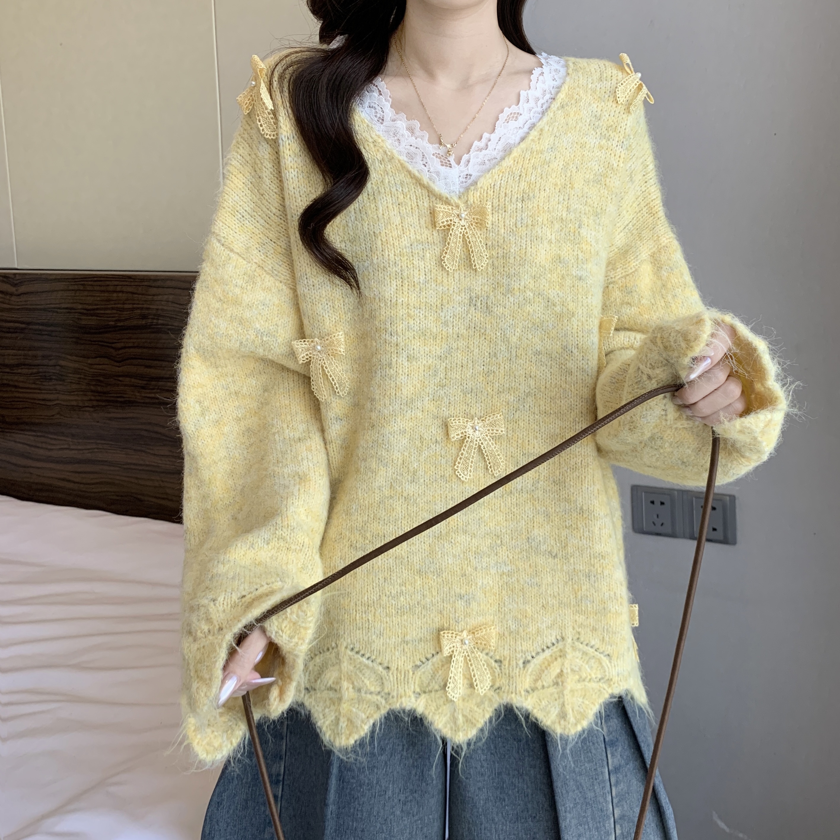 紫色花邊V領蝴蝶結針織衫毛衣女2025新款大碼胖mm軟糯巨好看上衣