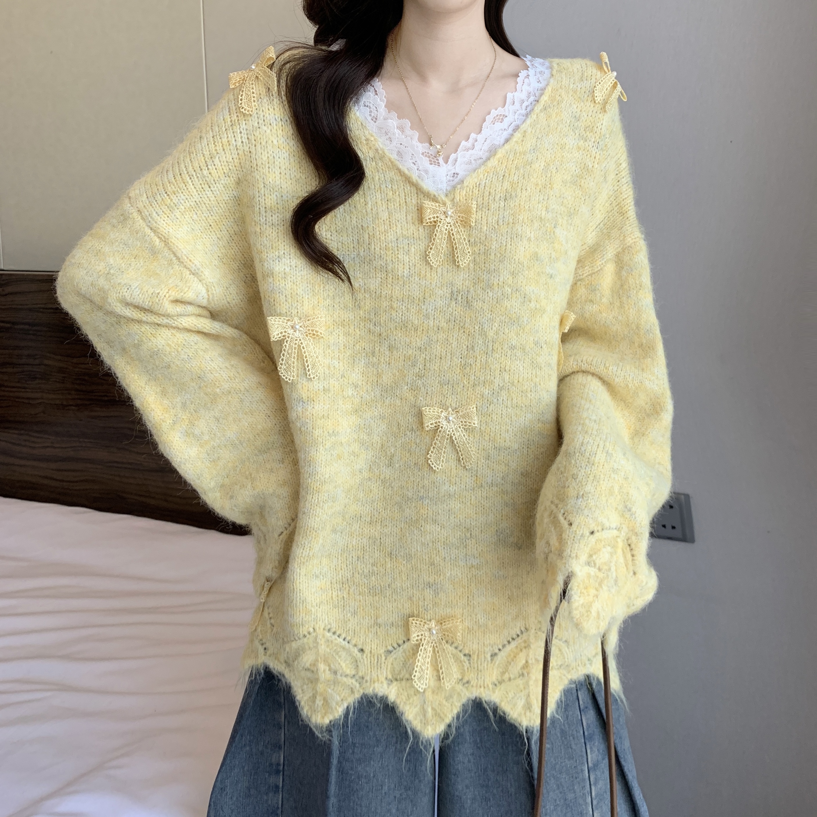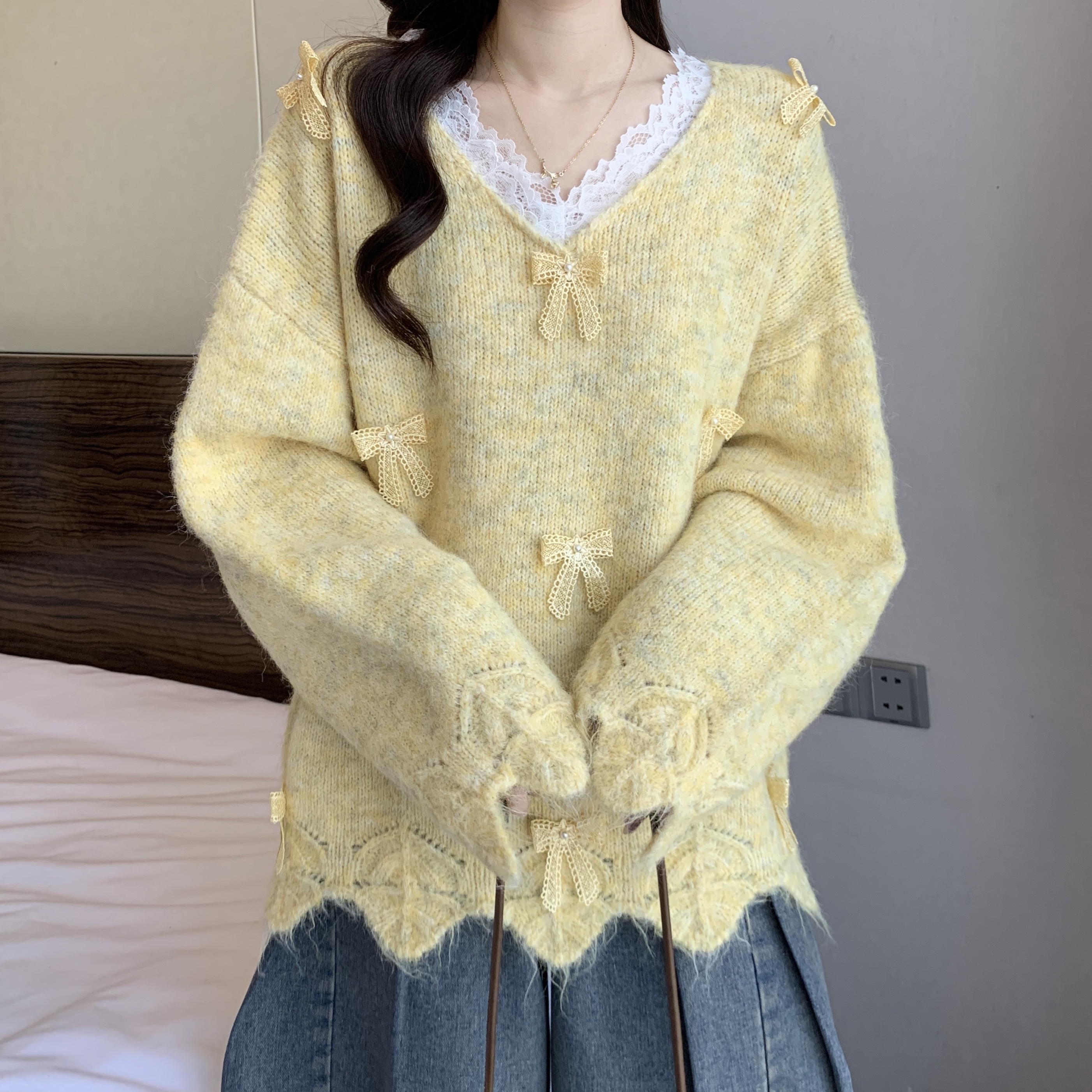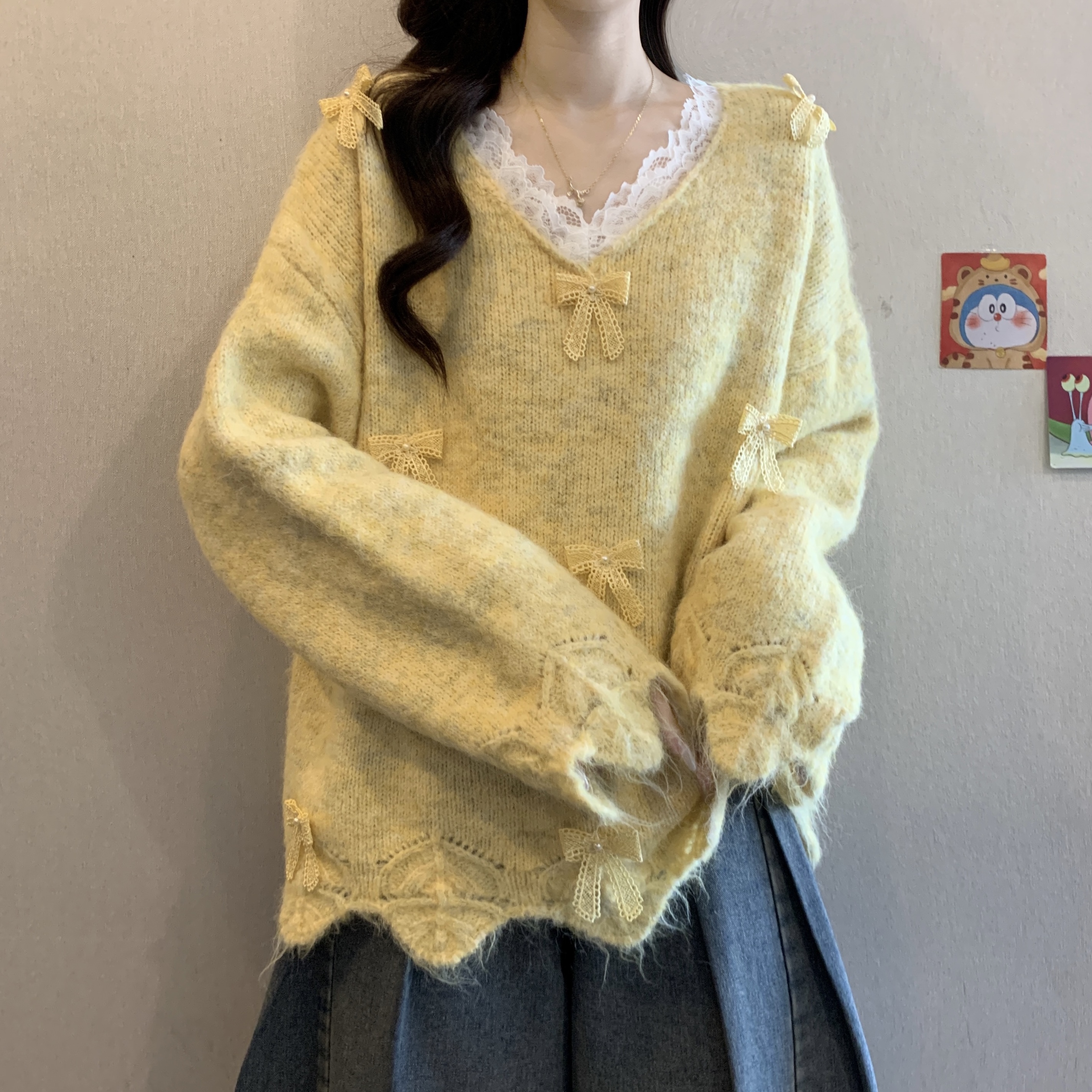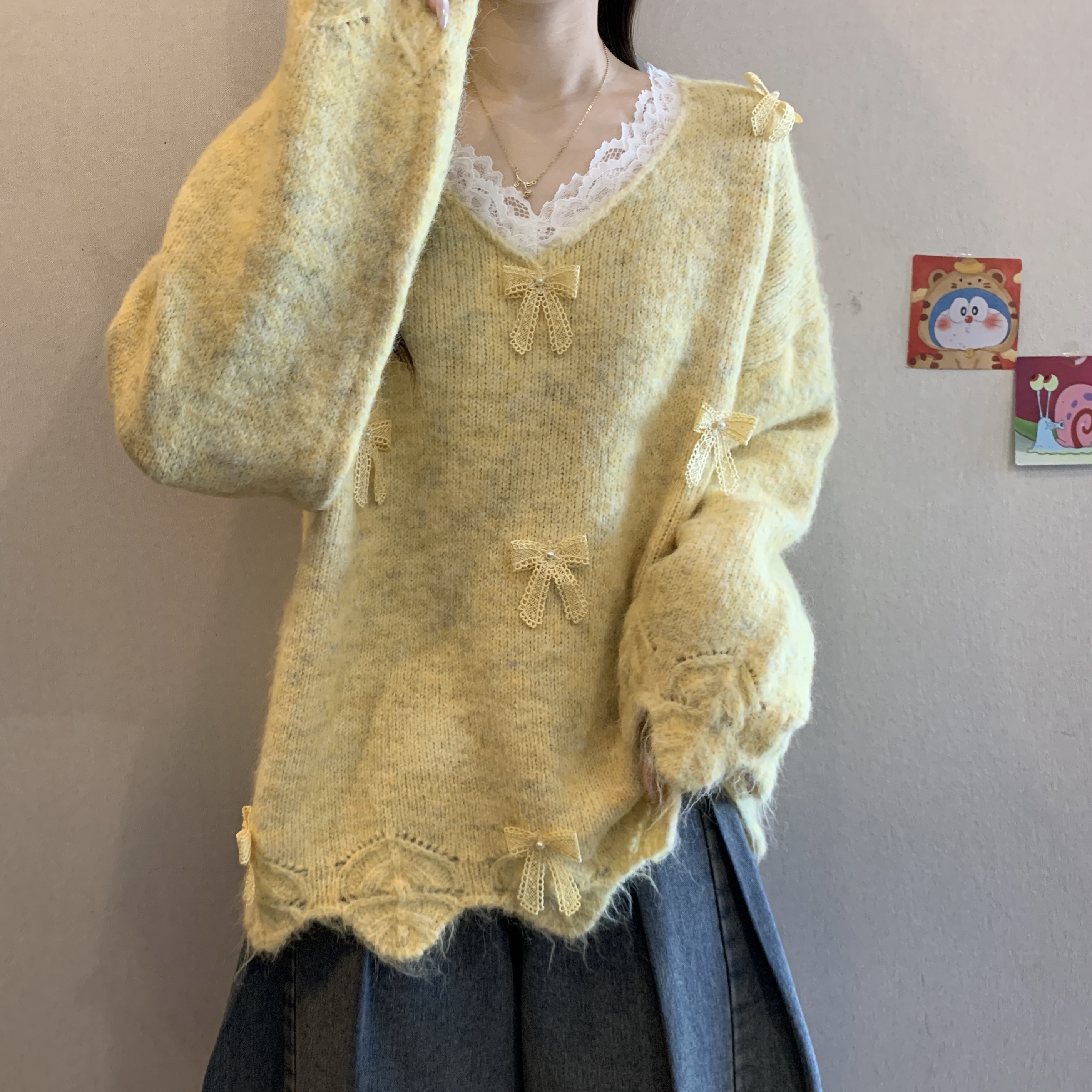 紫色花邊V領蝴蝶結針織衫毛衣女2025新款大碼胖mm軟糯巨好看上衣