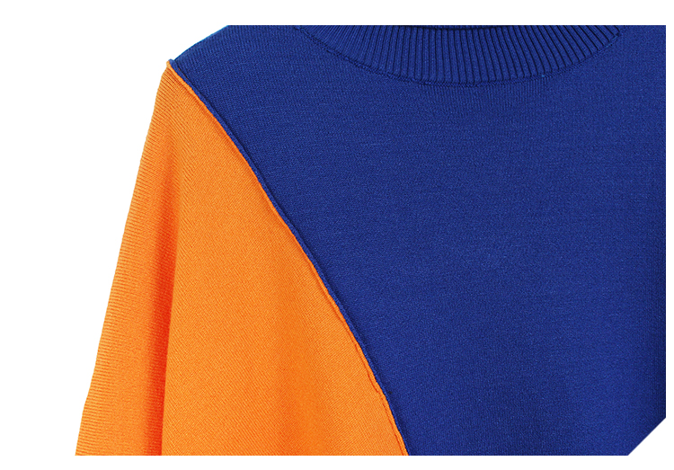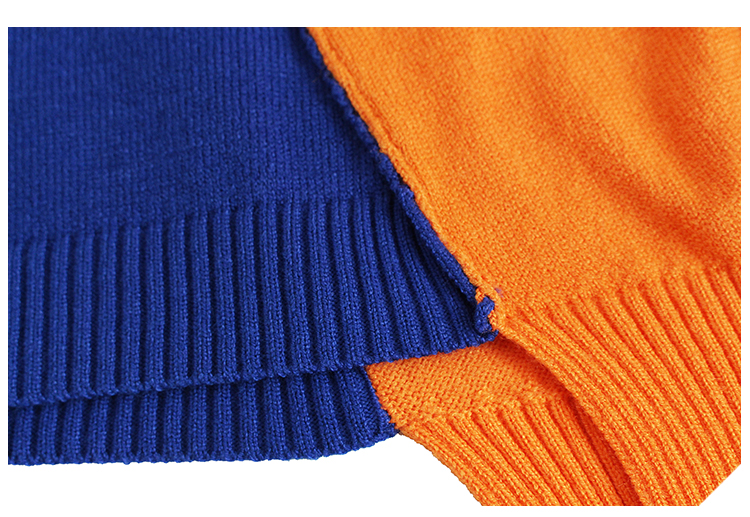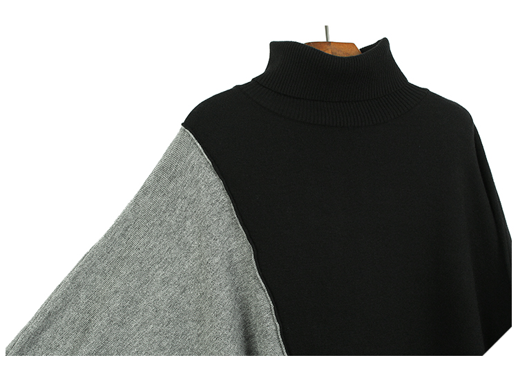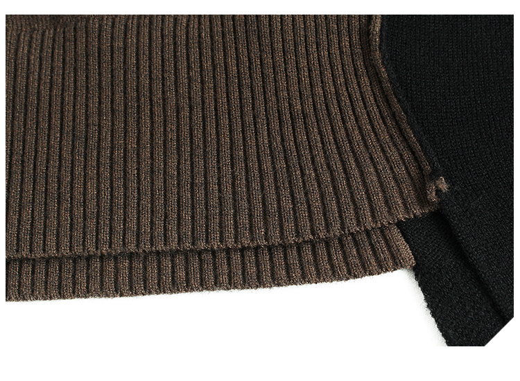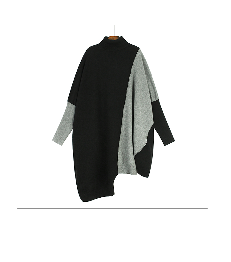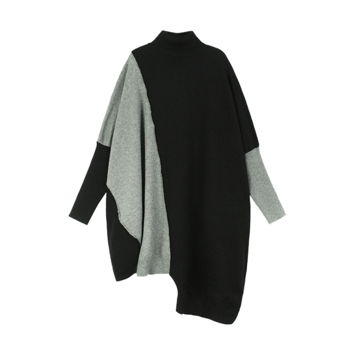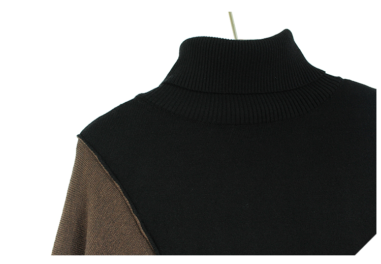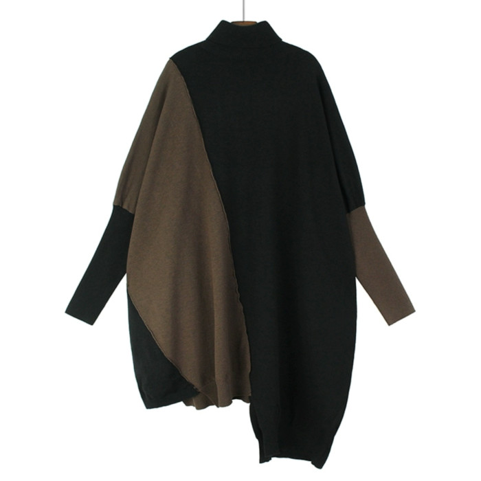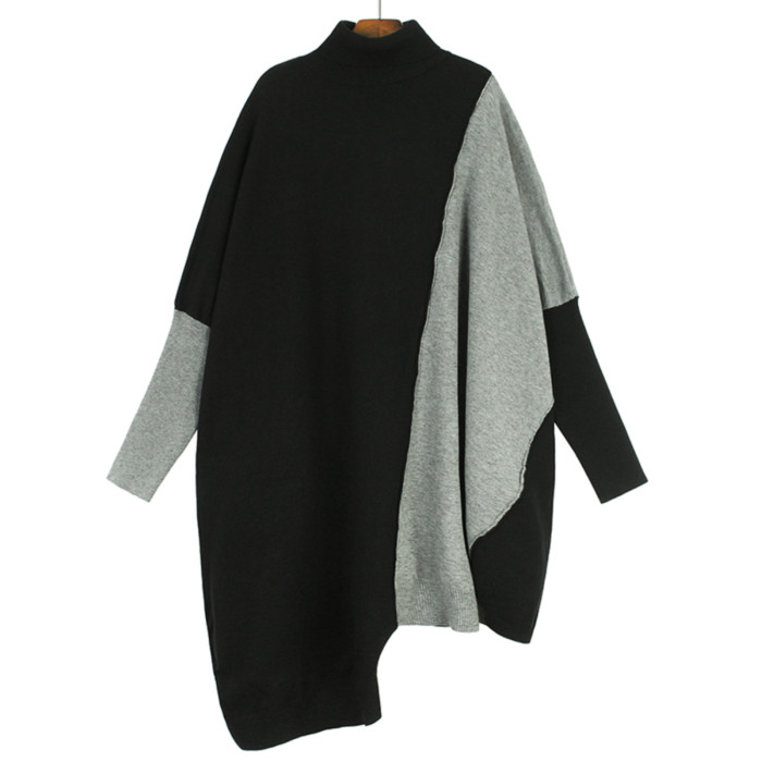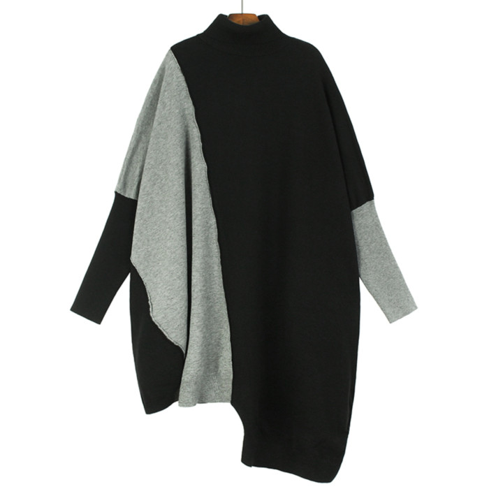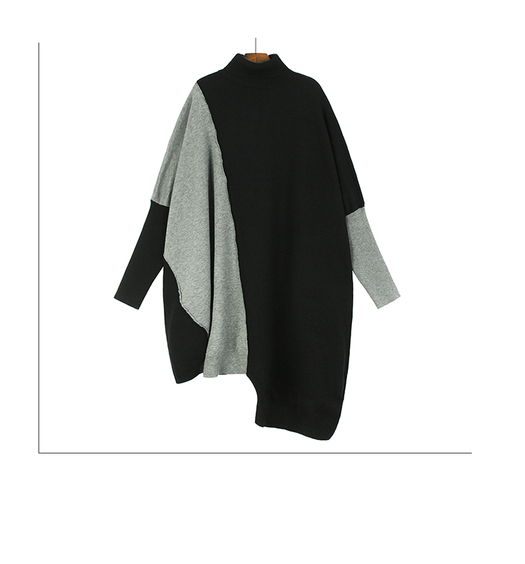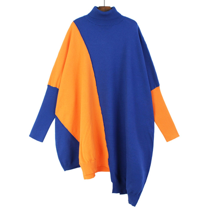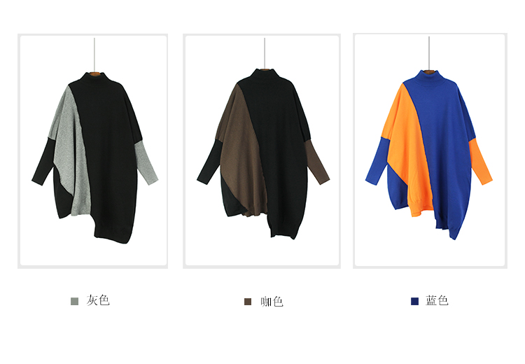 撞色拼接高領套頭毛衣女2025秋冬寬松慵懶大碼不規則中長款針織衫