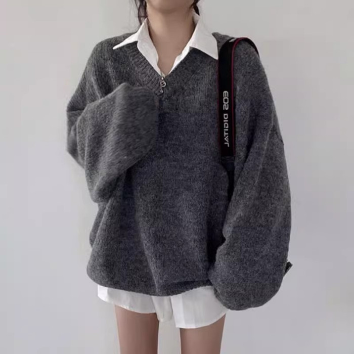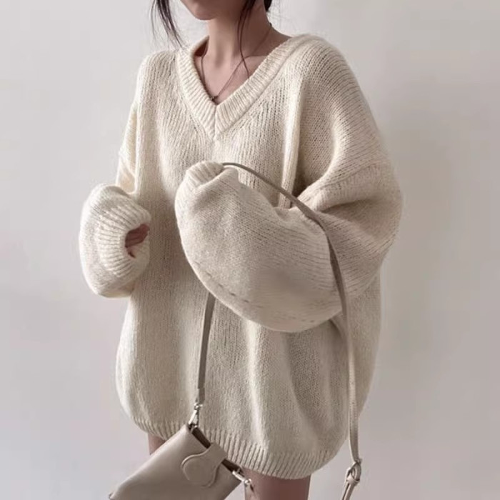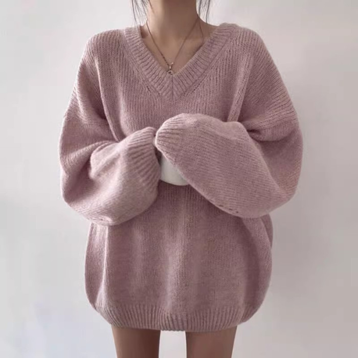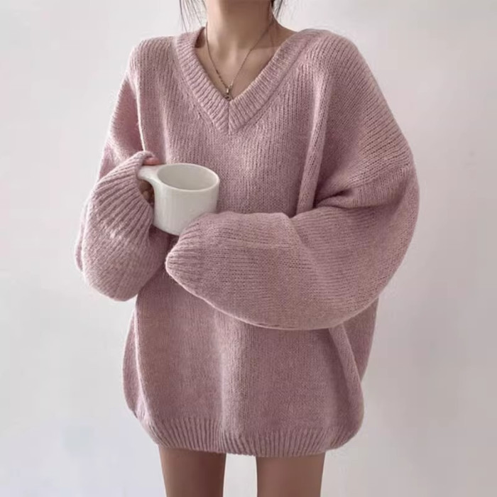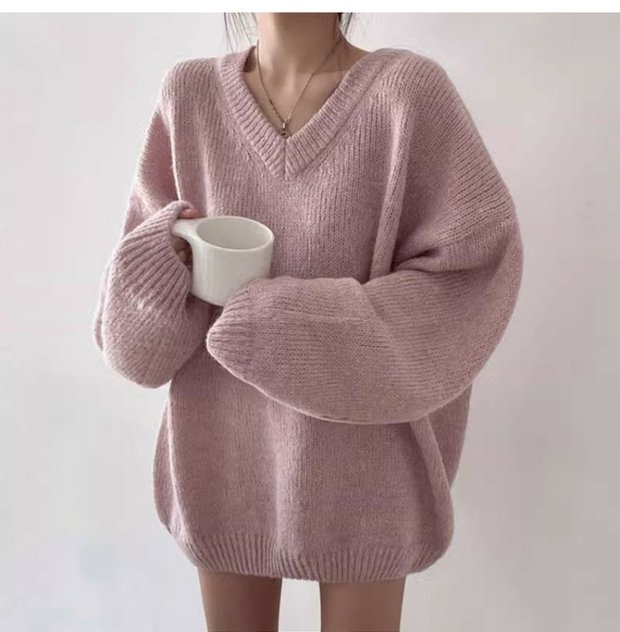 韓國chic秋冬溫柔氣質V領粉色軟糯針織衫寬松休閒長袖套頭毛衣女