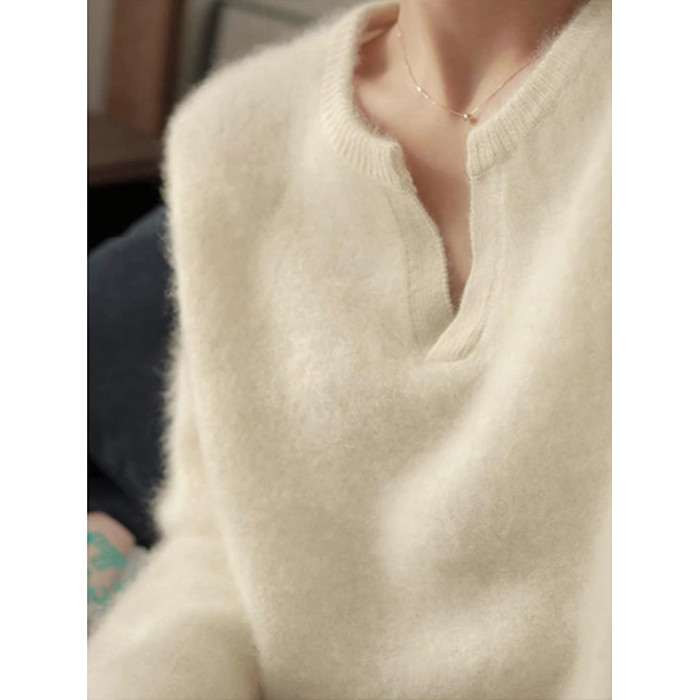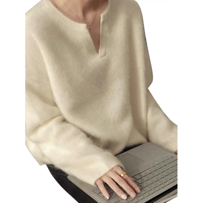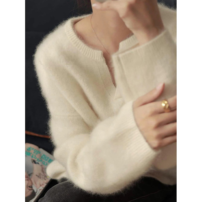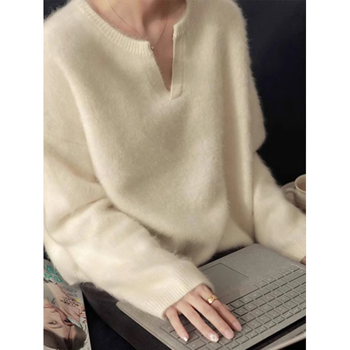 浣熊絨白色v領毛衣女秋冬季小個子寬松慵懶風內搭針織衫打底上衣
