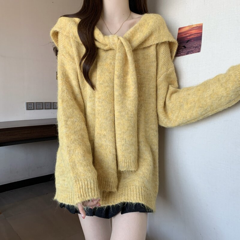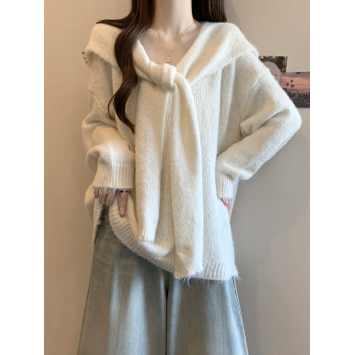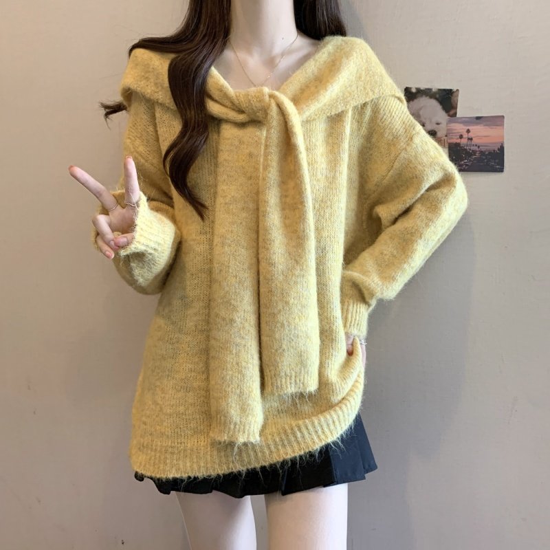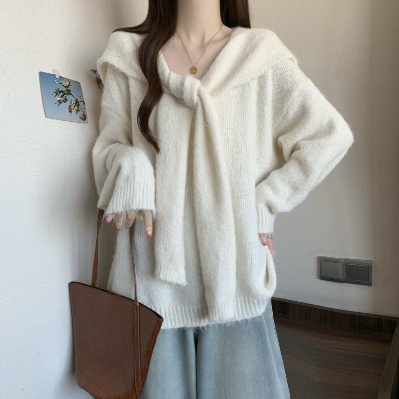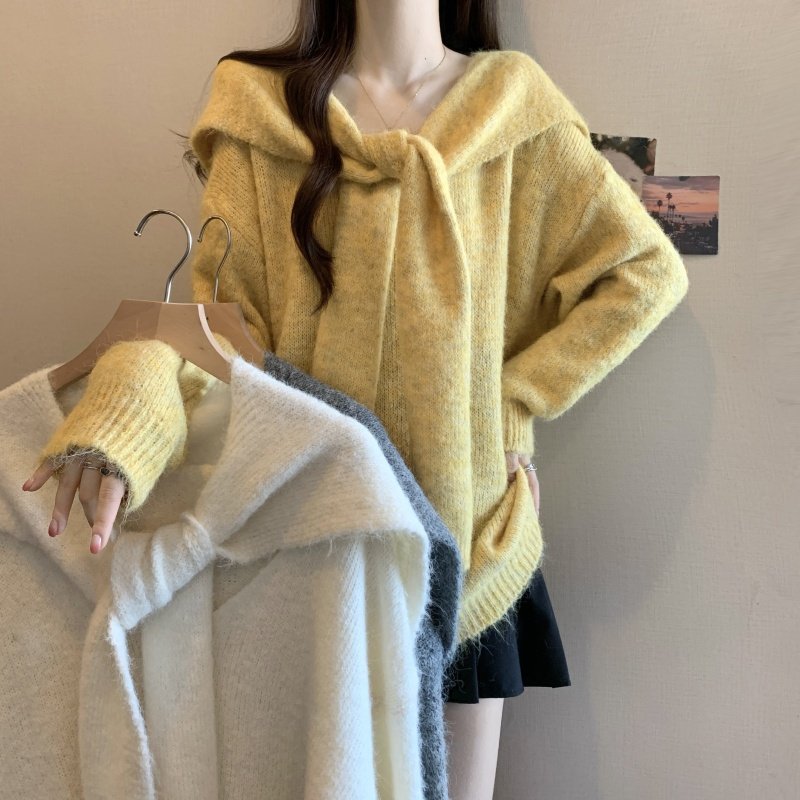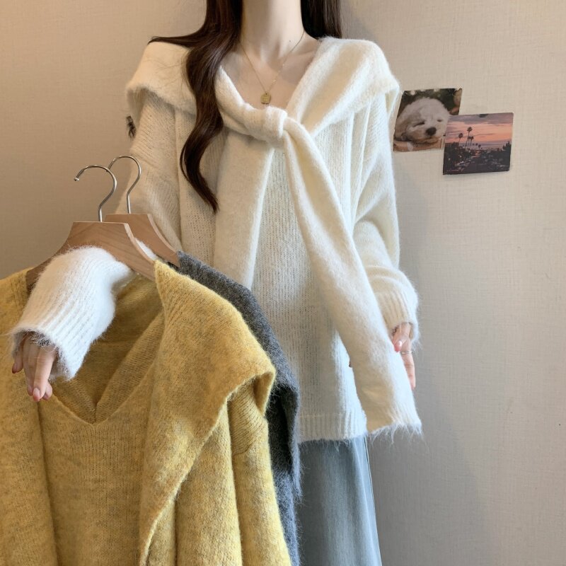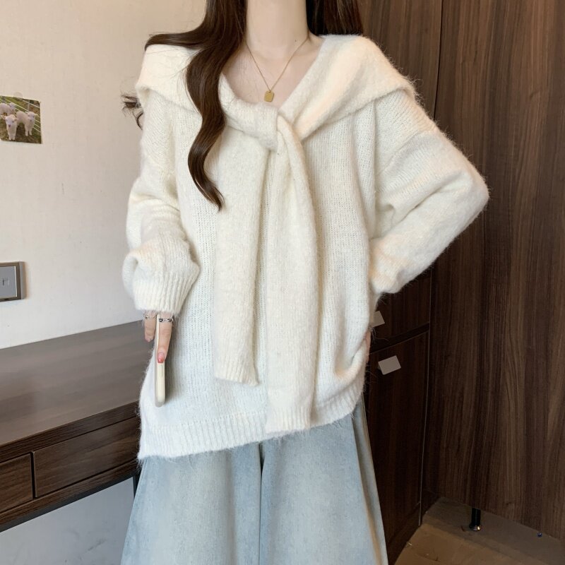 奶呼呼軟糯針織衫女春秋大碼胖mm寬松慵懶風毛衣披肩海軍領兩件套