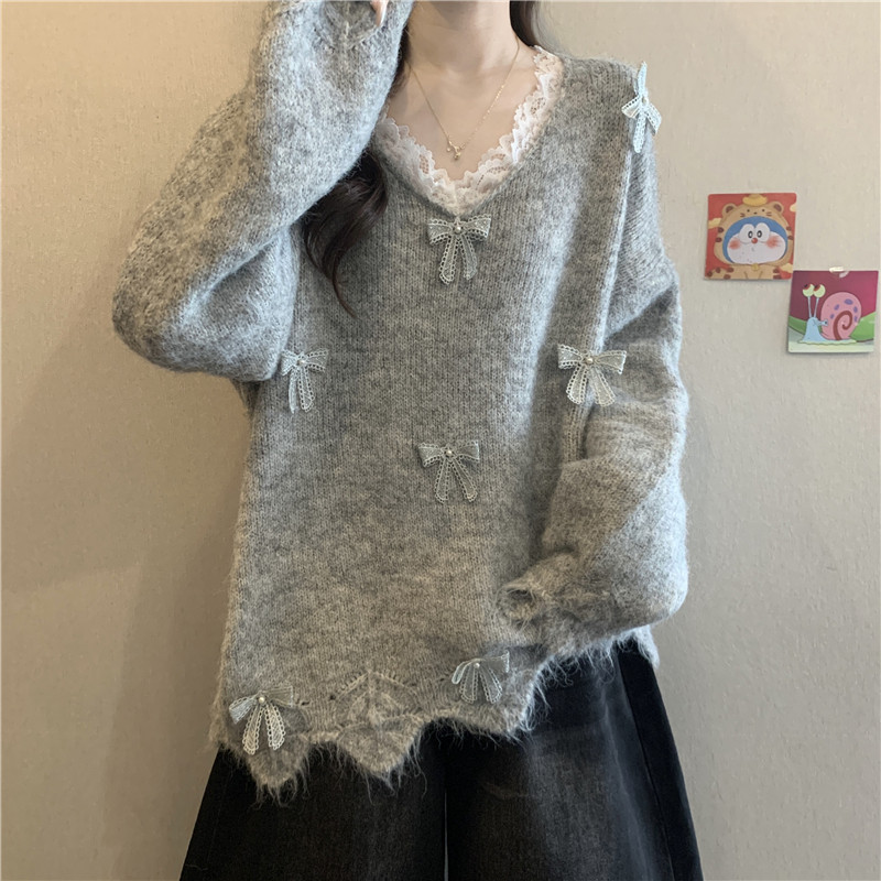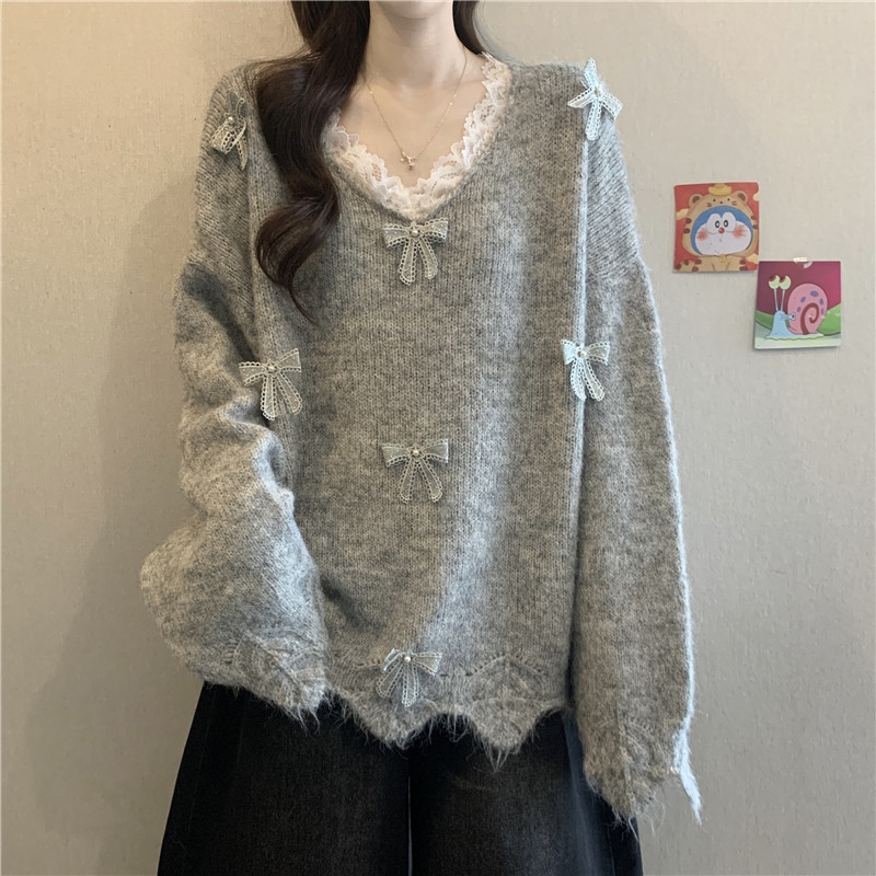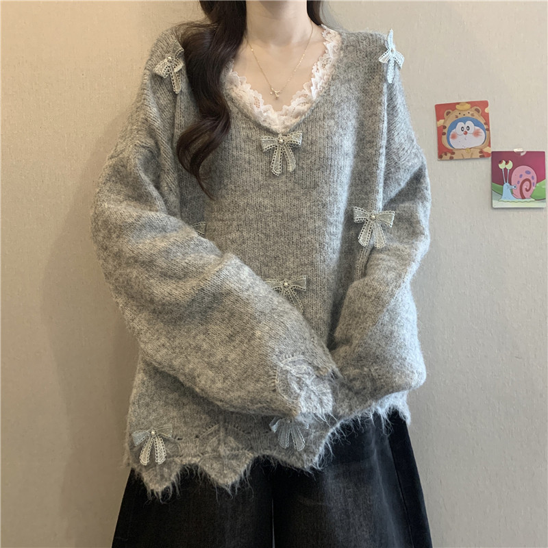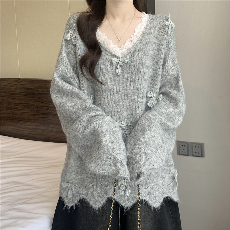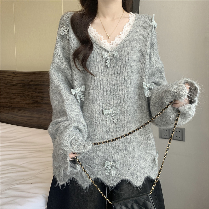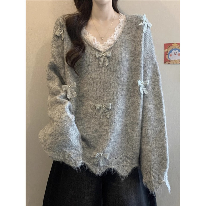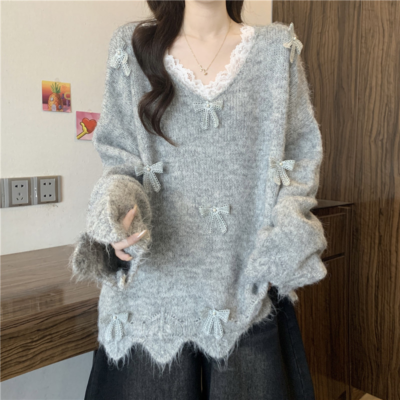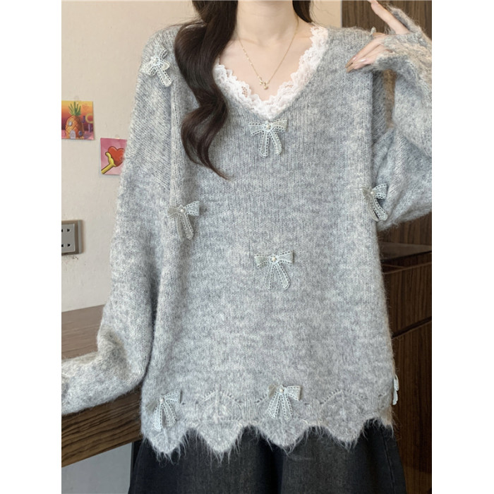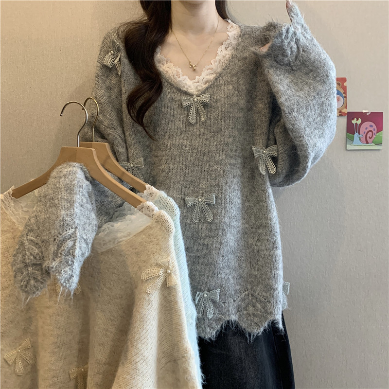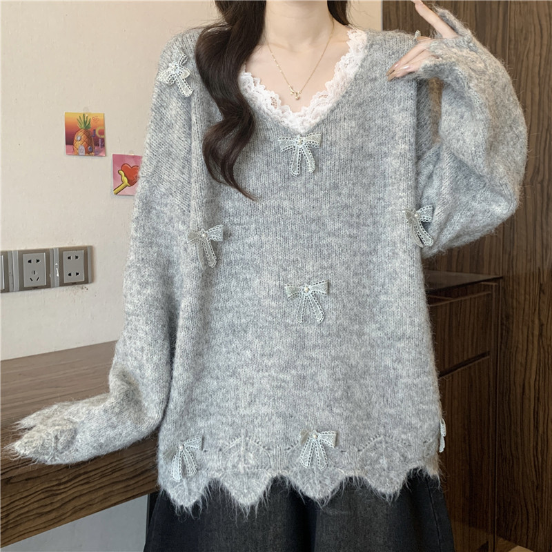巨好看蕾絲V領灰色毛衣秋季2025新款大碼女裝胖mm長袖針織衫上衣