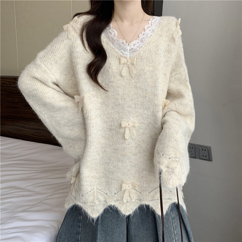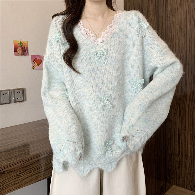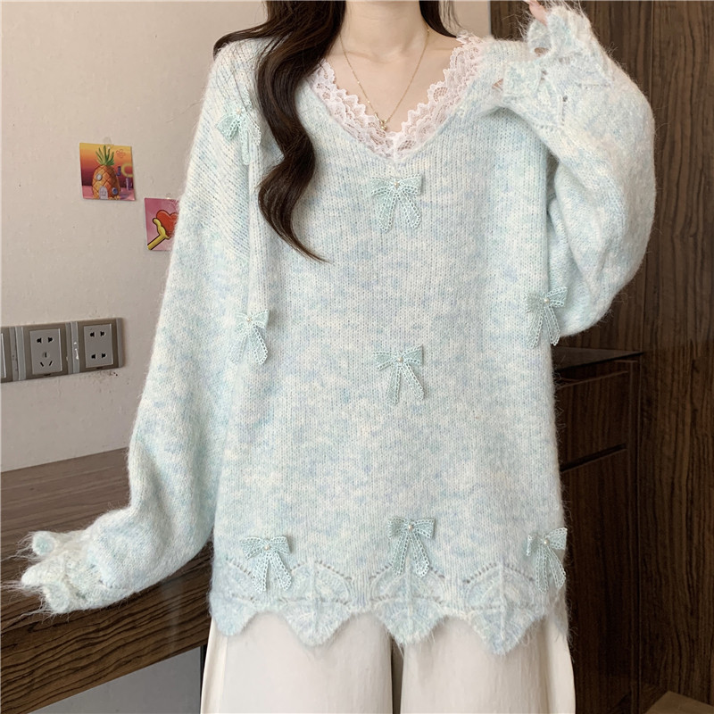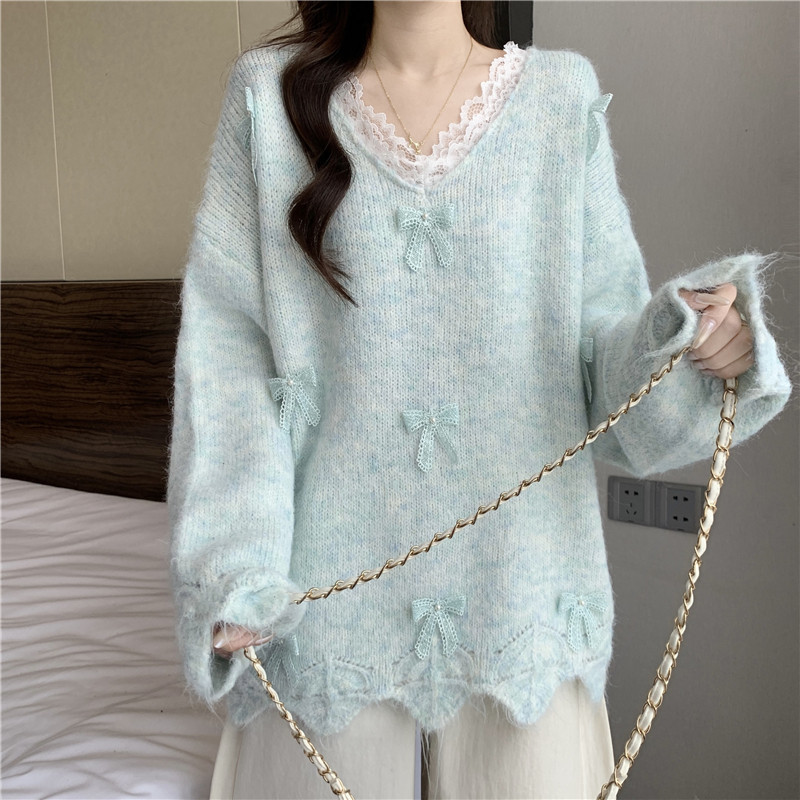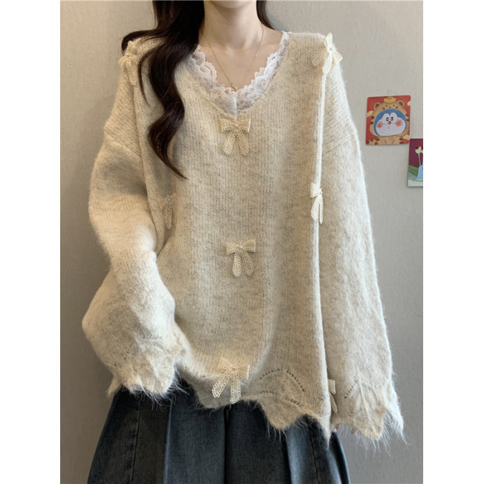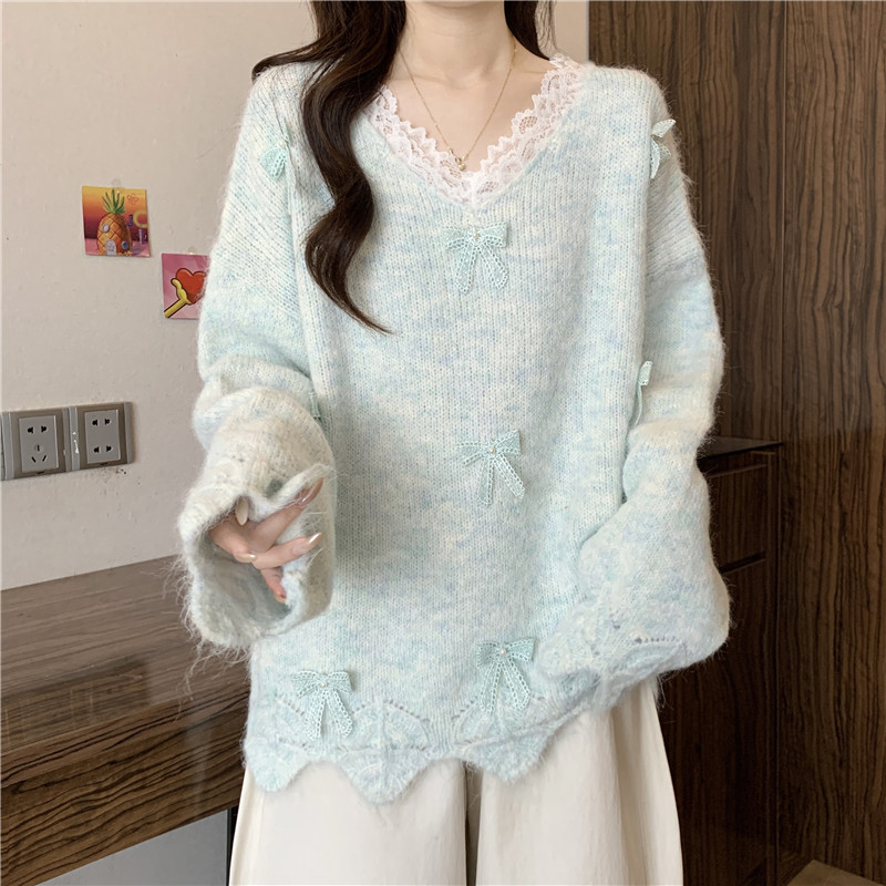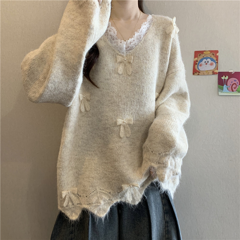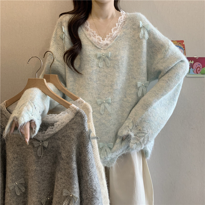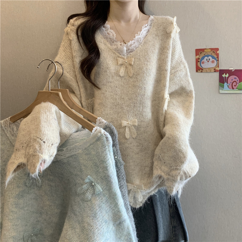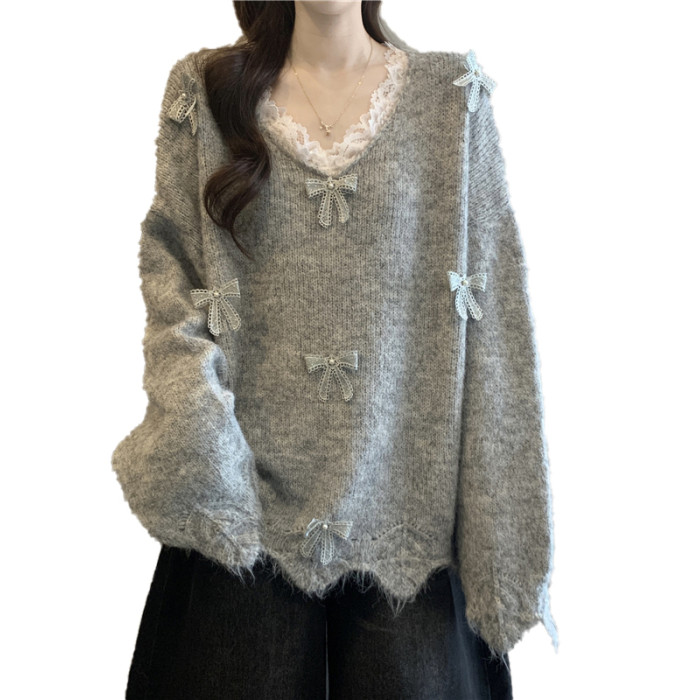 巨好看蕾絲V領灰色毛衣秋季2025新款大碼女裝胖mm長袖針織衫上衣