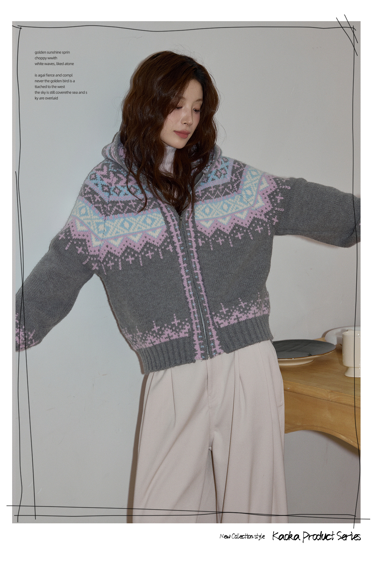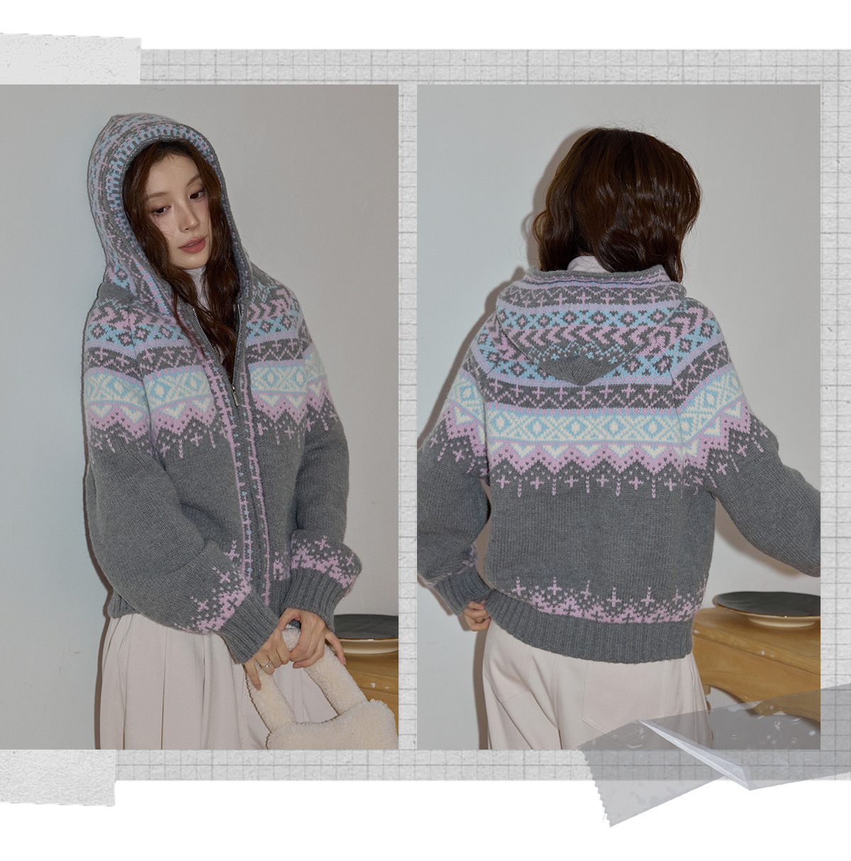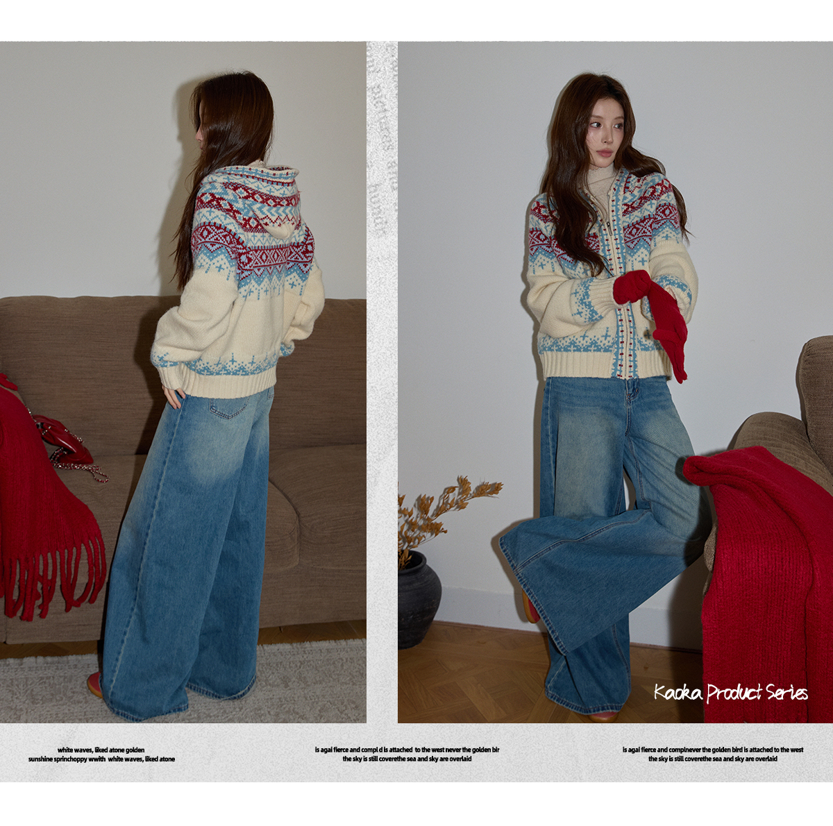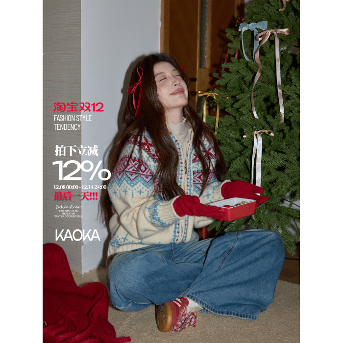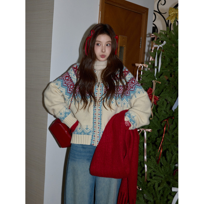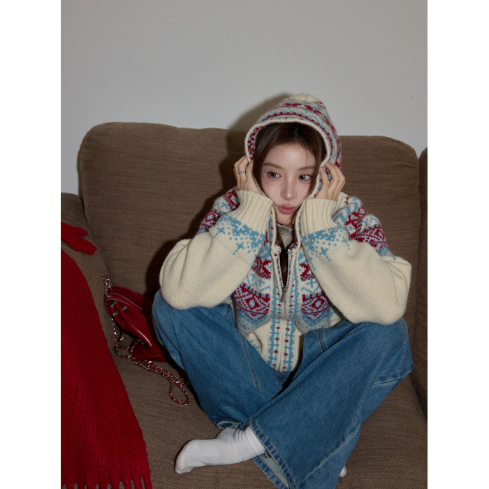 吵吵家聖誕連帽厚毛衣開衫秋冬女米色費爾島毛衫加厚長袖毛織外套