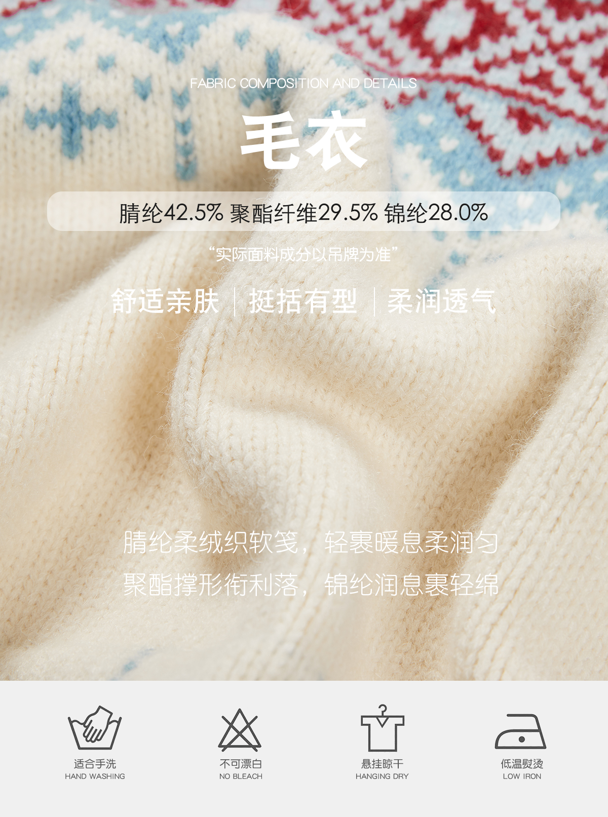 | 材質成分 | 聚丙烯腈纖維(腈綸)42.5% 聚酯纖維29.5% 聚醯胺纖維(錦綸)28% |