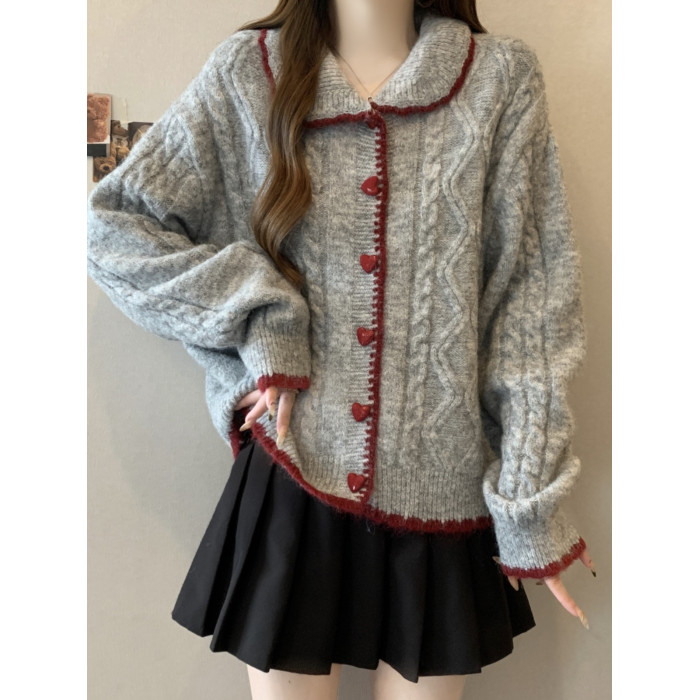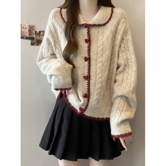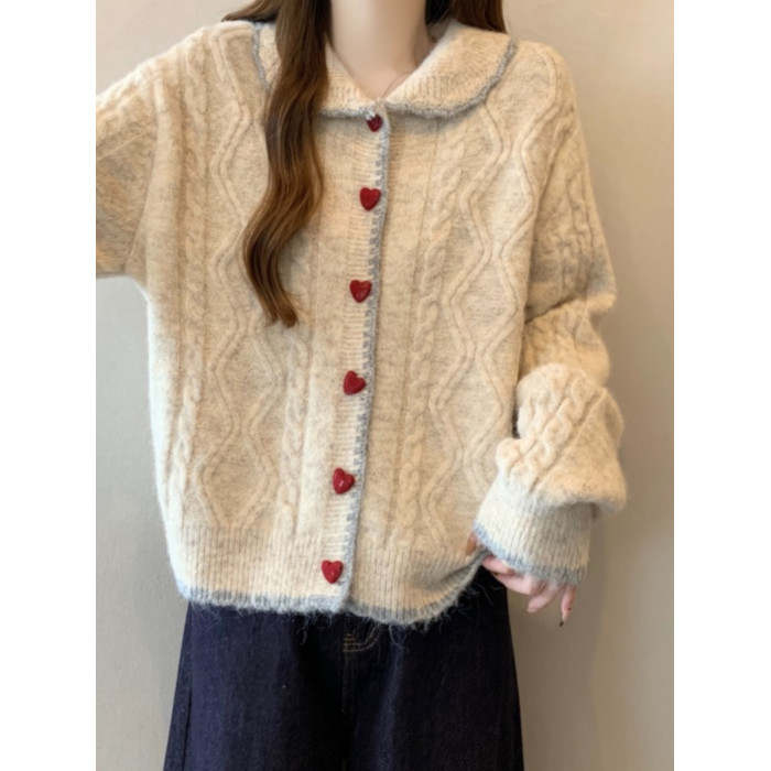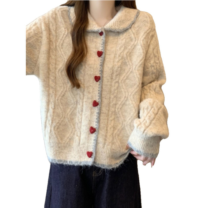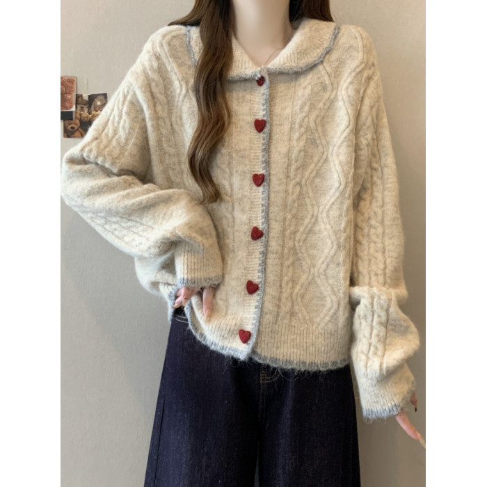 韓系慵懶風娃娃領正肩毛衣外套女2025秋季大碼胖mm愛心釦針織開衫