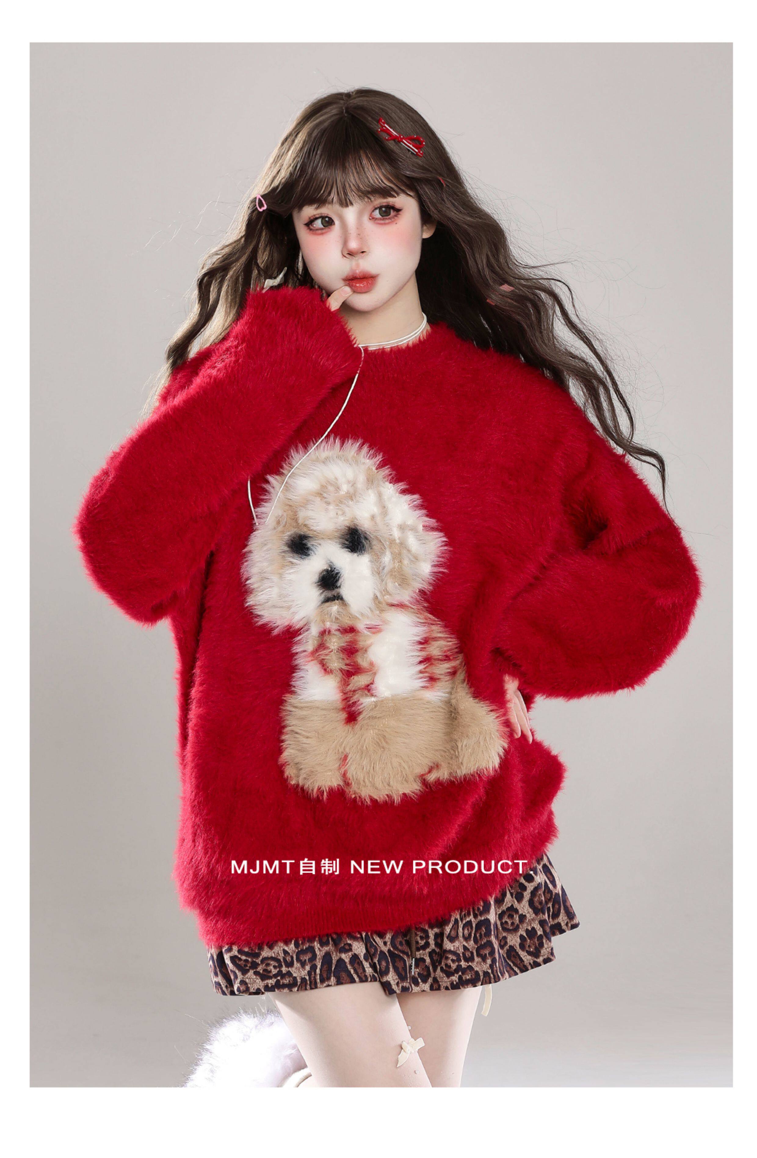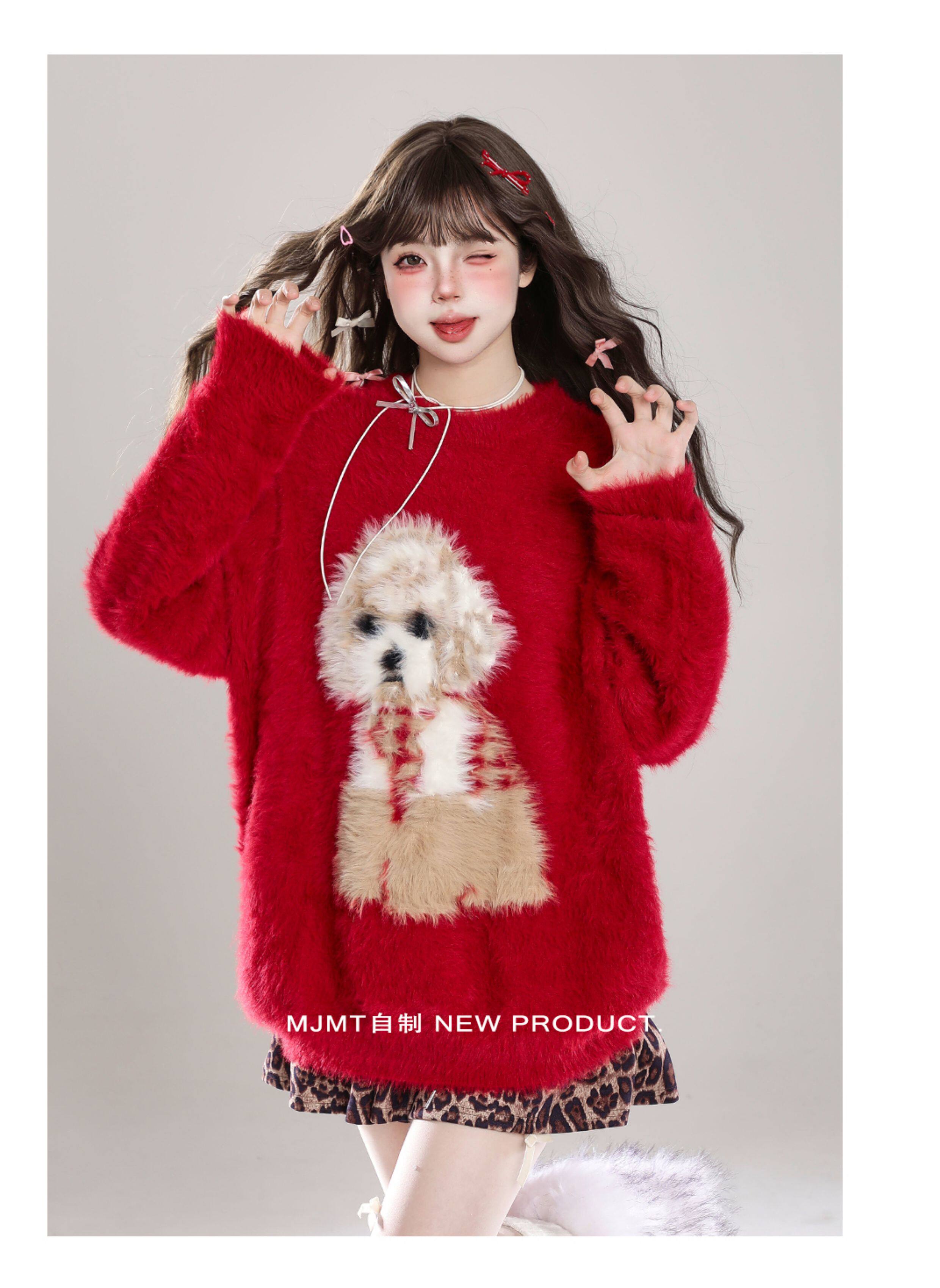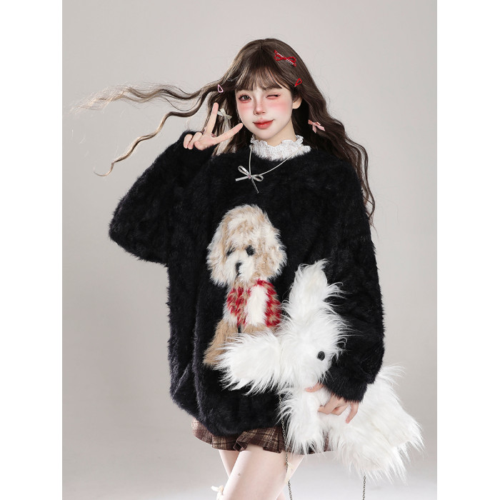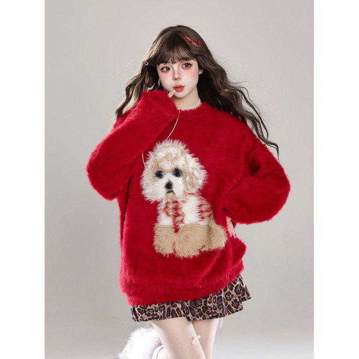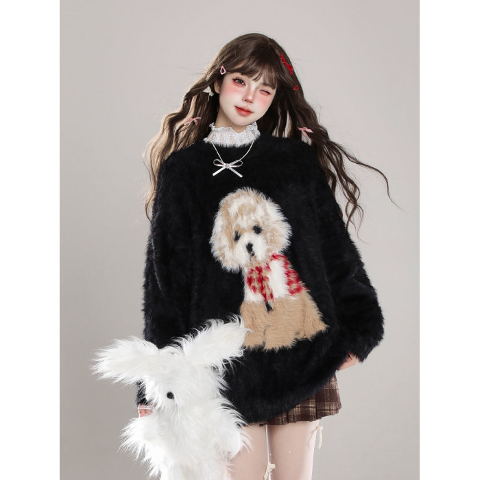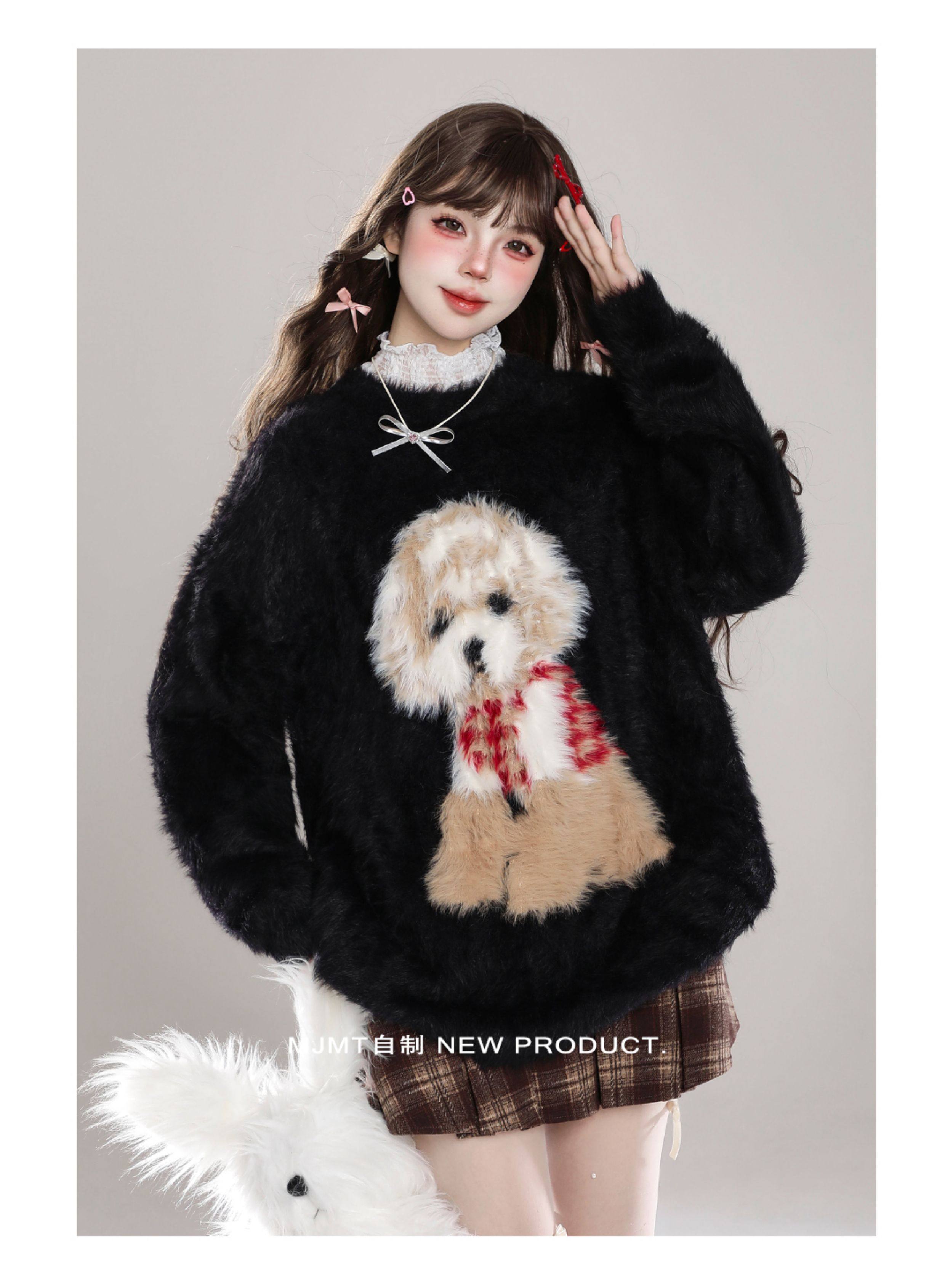 卡通小狗馬海毛套頭毛衣女秋冬新款慵懶風軟糯水貂絨休閒針織上衣