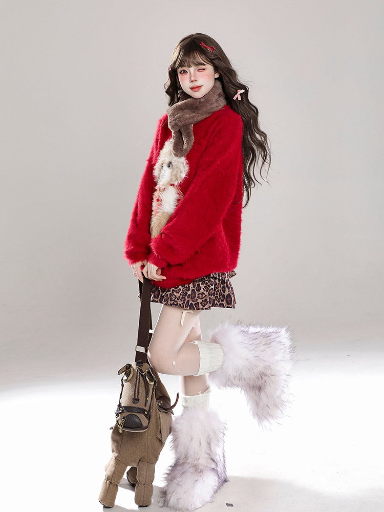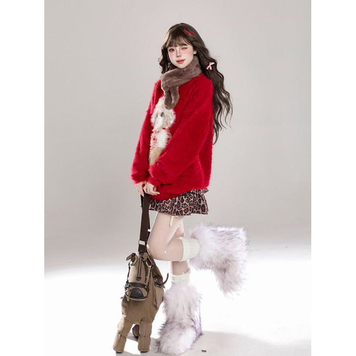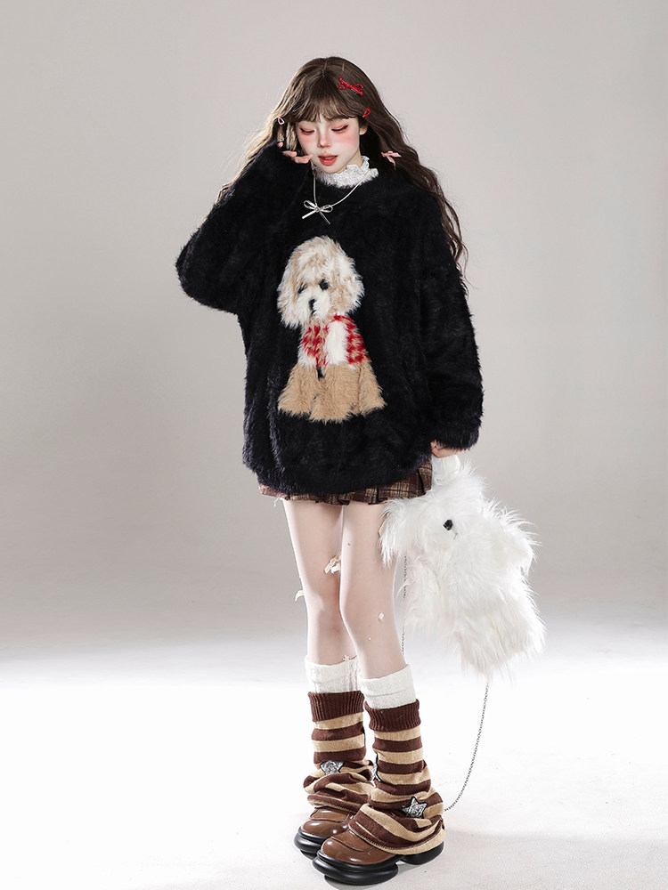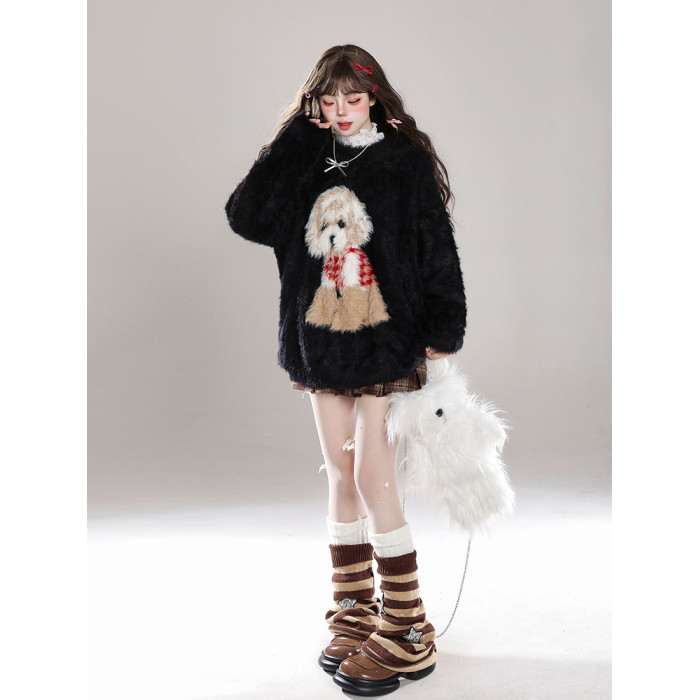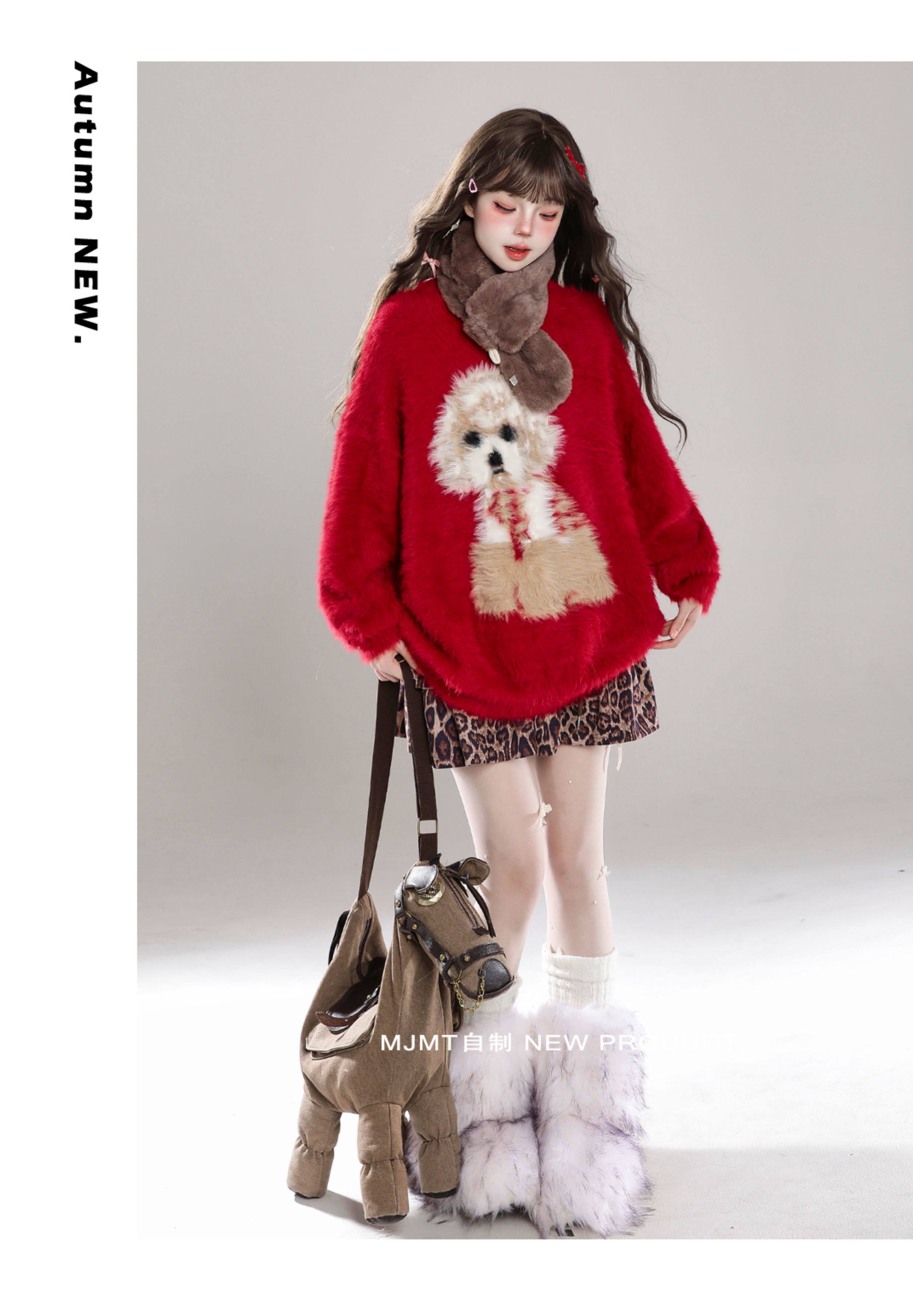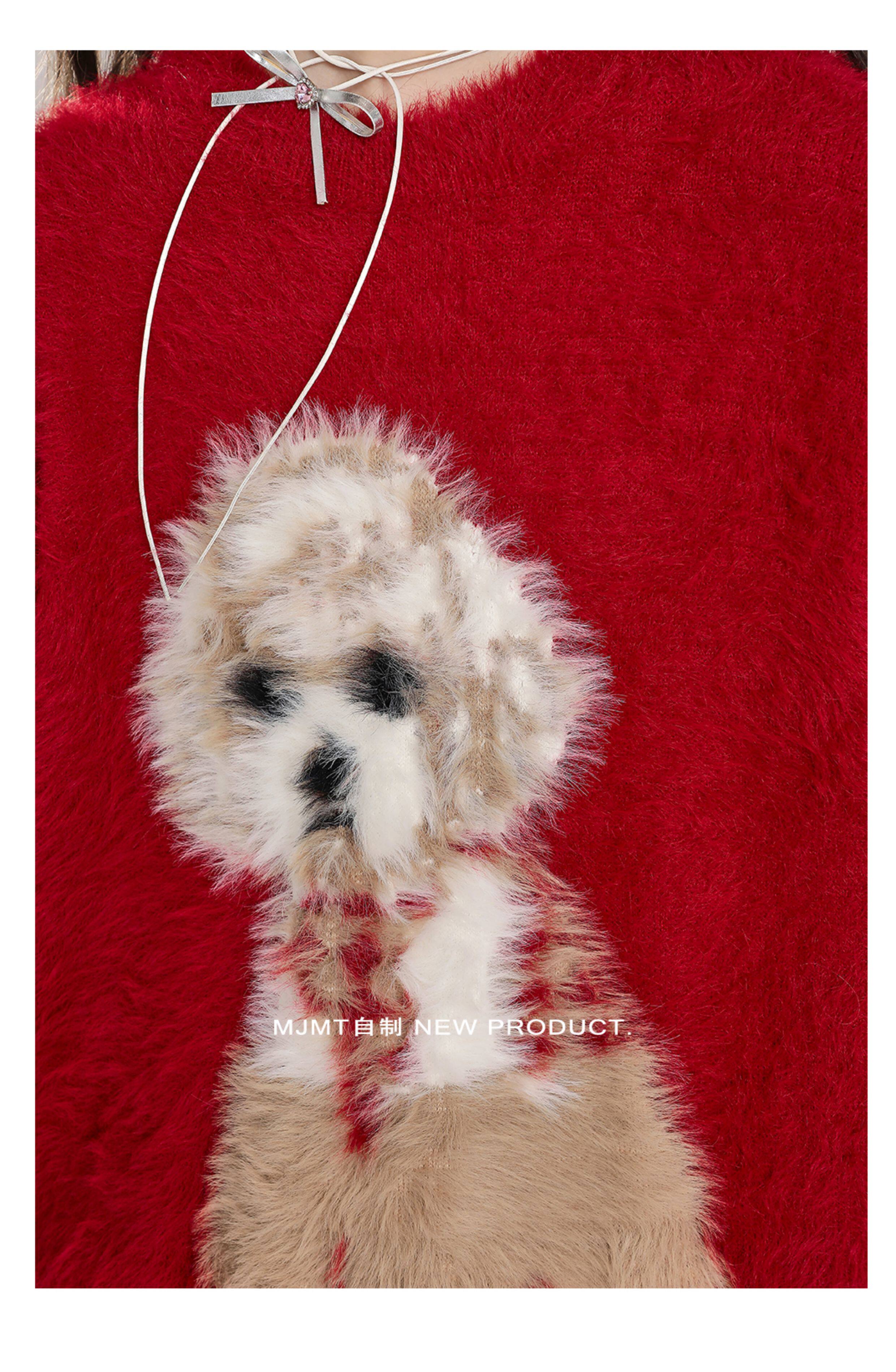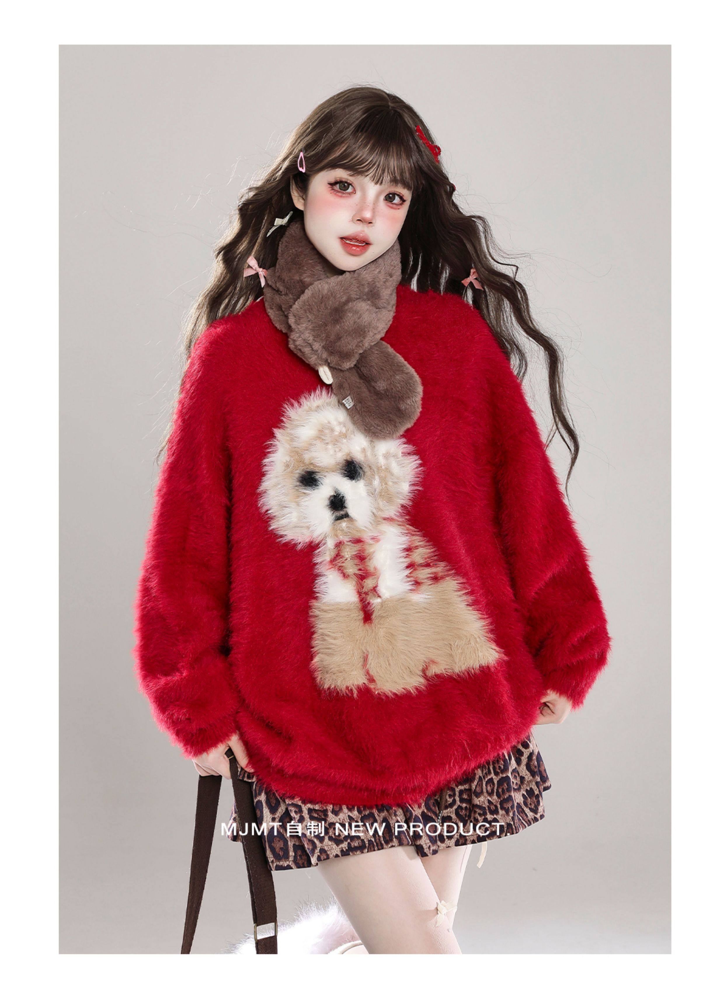 卡通小狗馬海毛套頭毛衣女秋冬新款慵懶風軟糯水貂絨休閒針織上衣