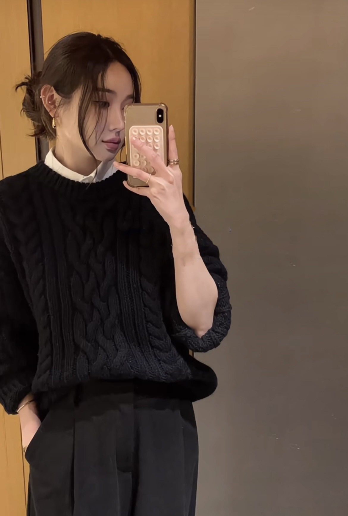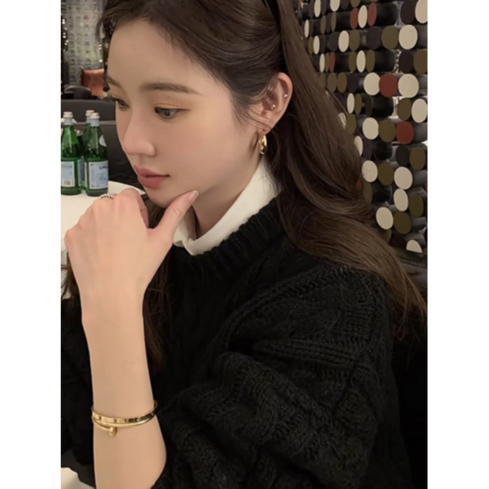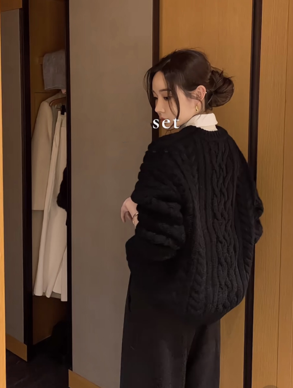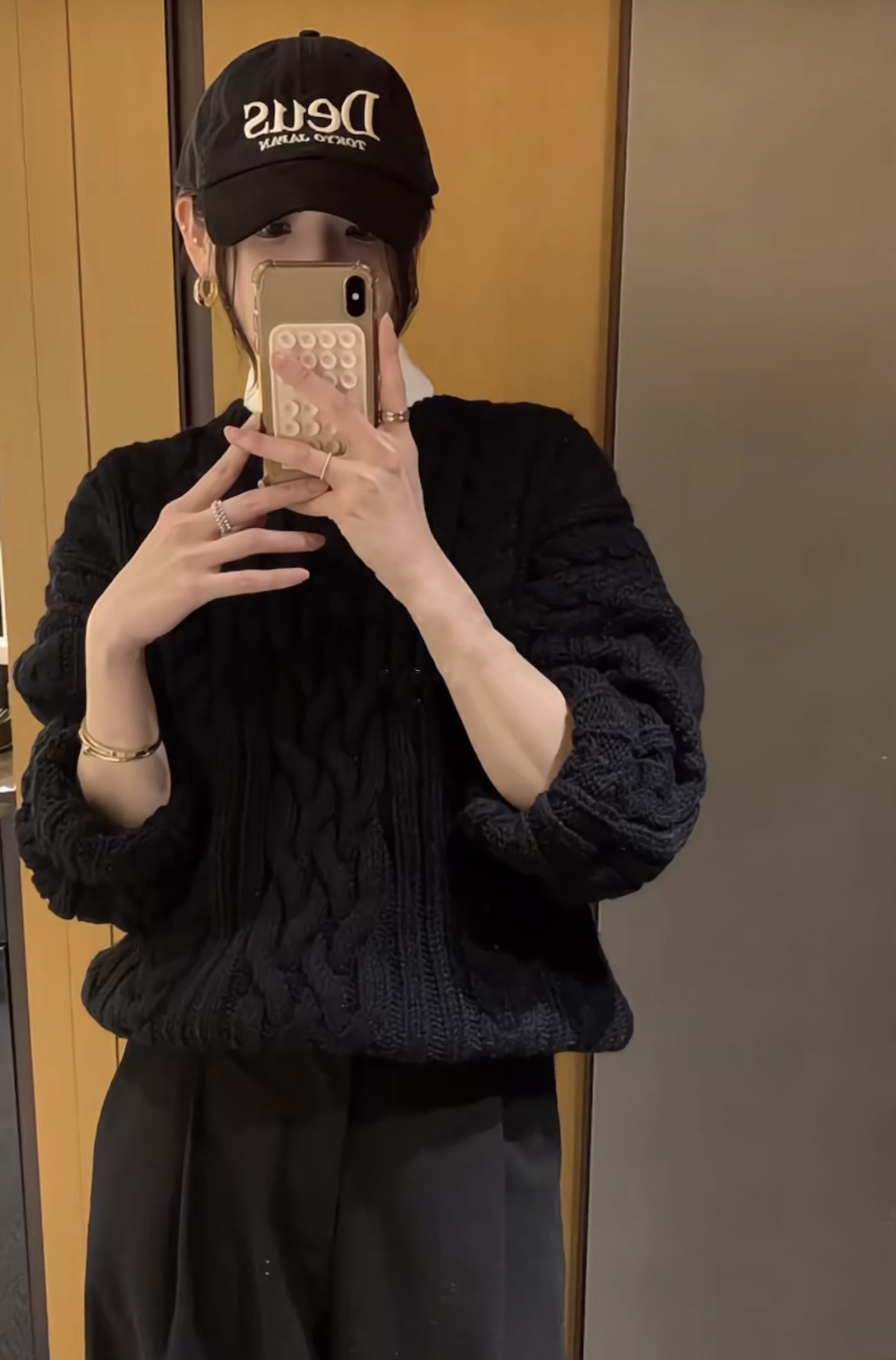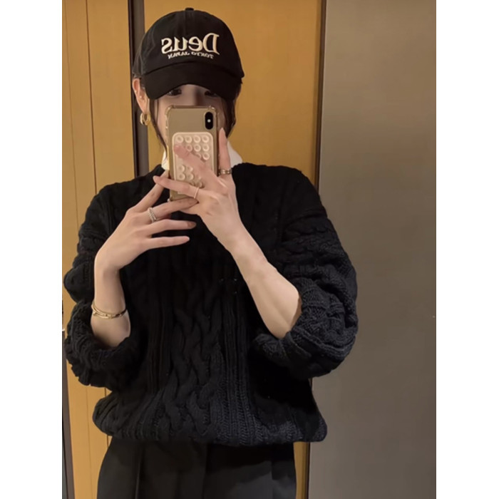 高級感黑色麻花浣熊絨毛衣女秋冬季加厚寬松慵懶風套頭針織衫上衣