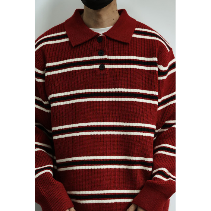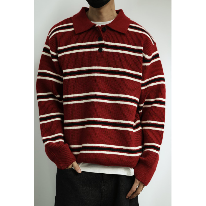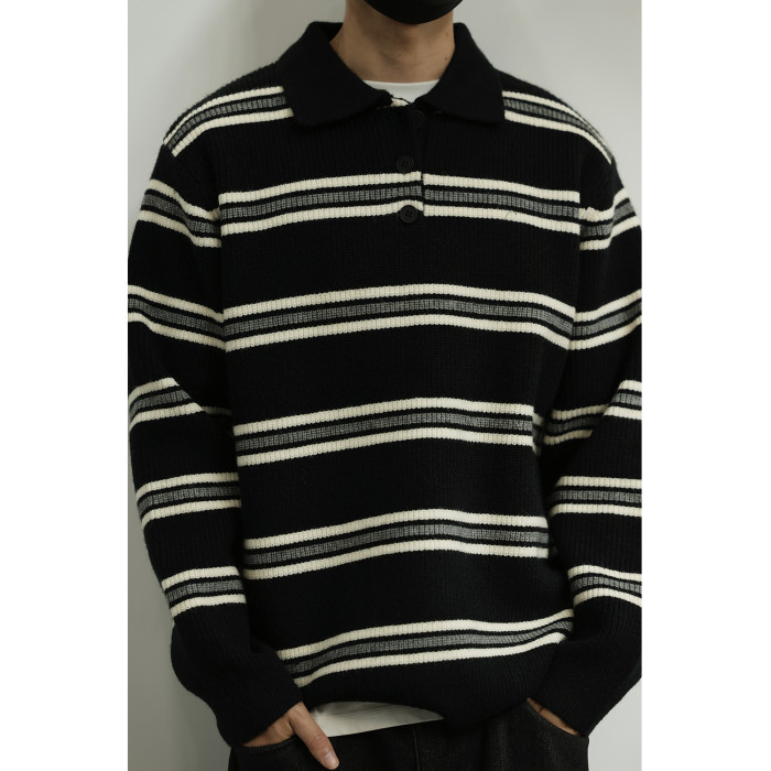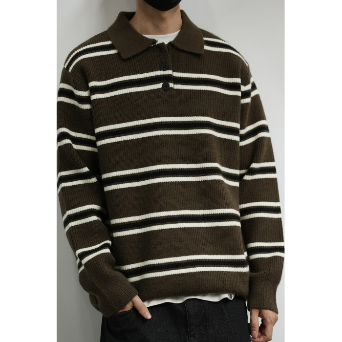 LH store 美式復古條紋POLO毛衣男秋寬松情侶翻領長袖針織衫上衣