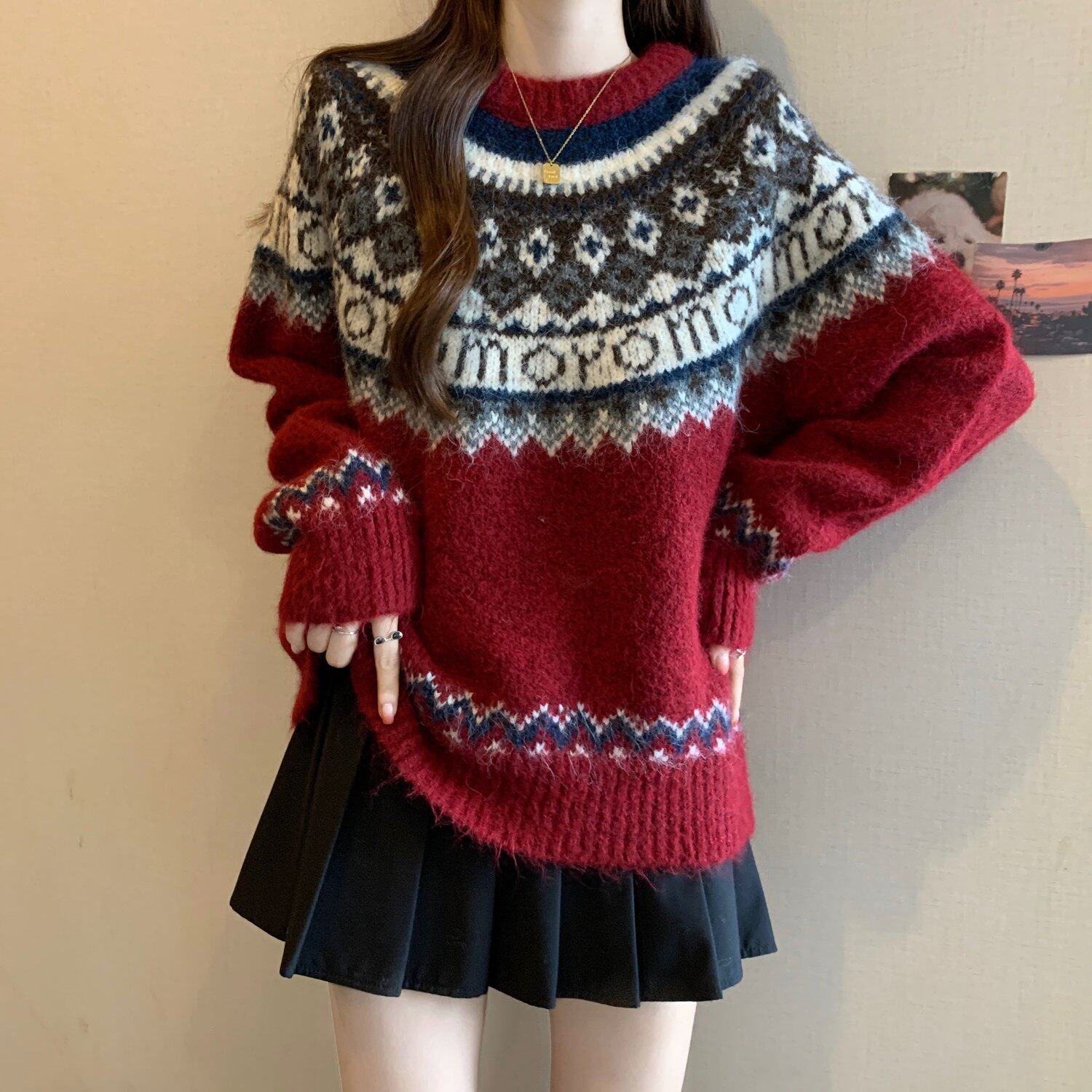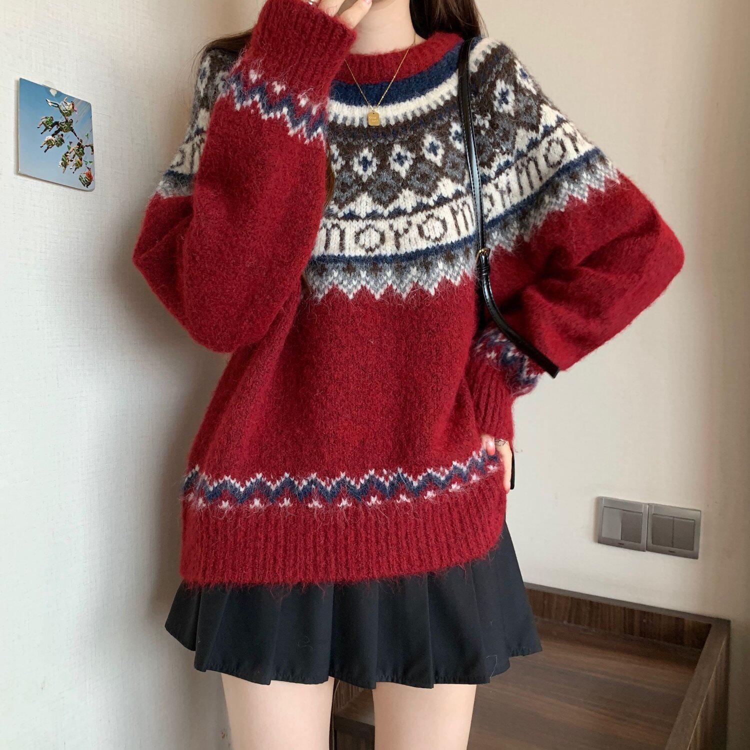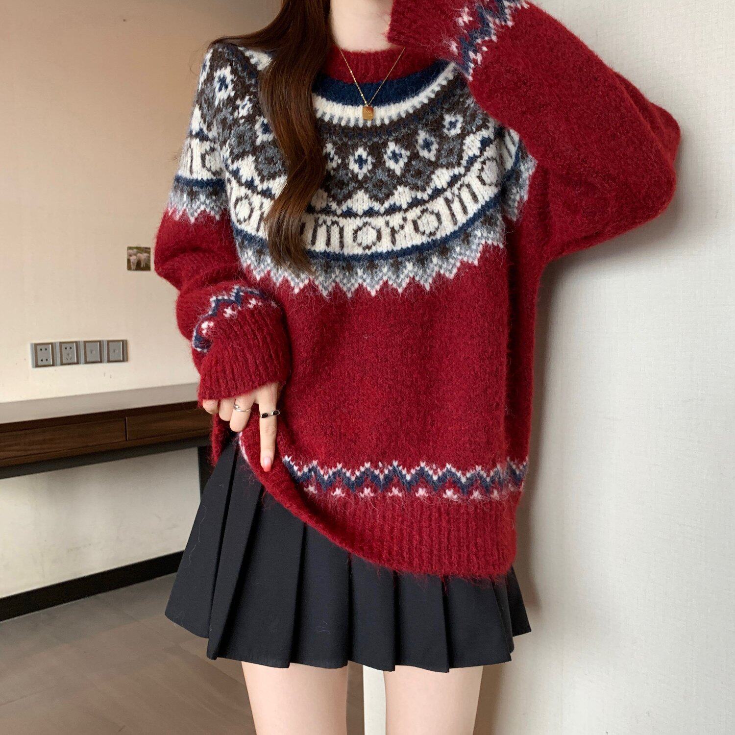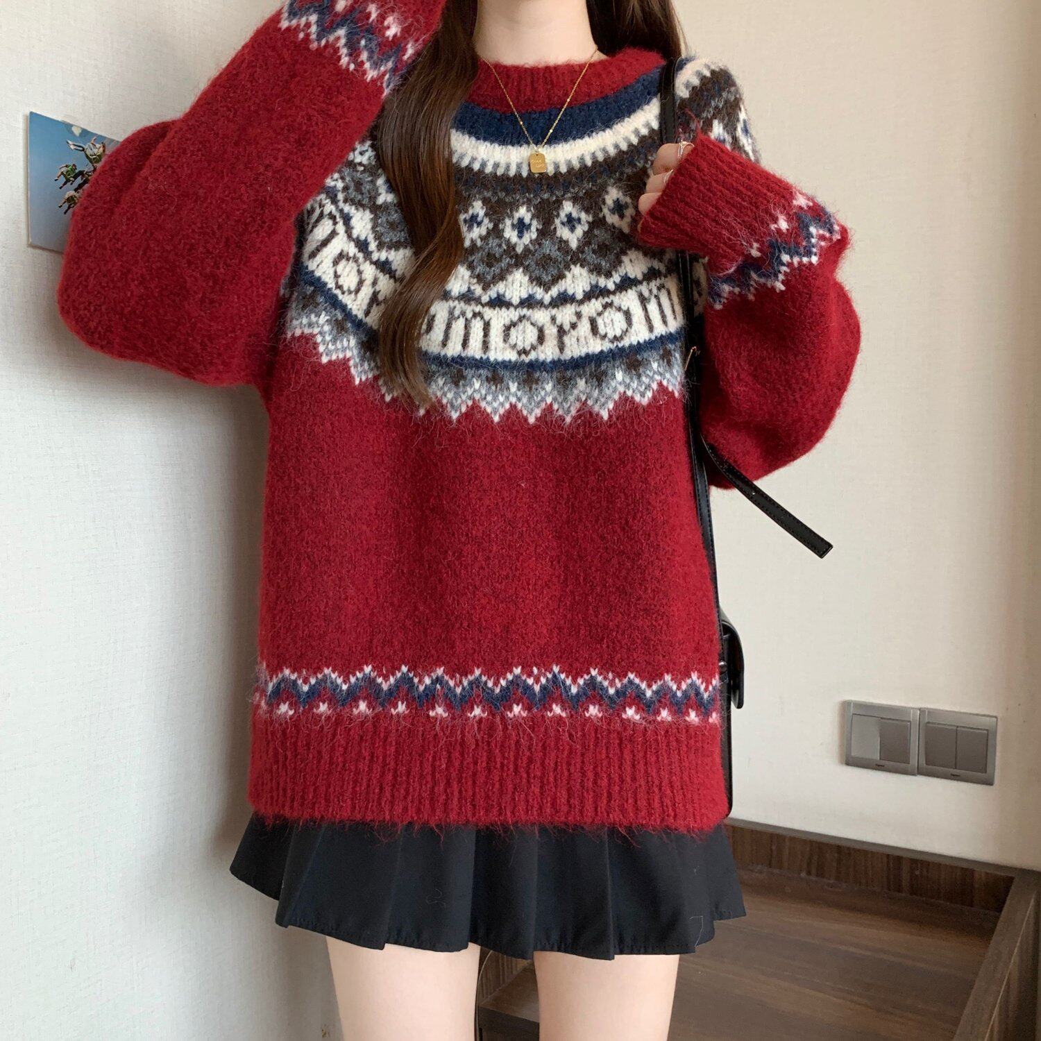 紅色費爾島毛衣女2025秋裝新款大碼胖mm加厚針織衫聖誕氛圍感上衣