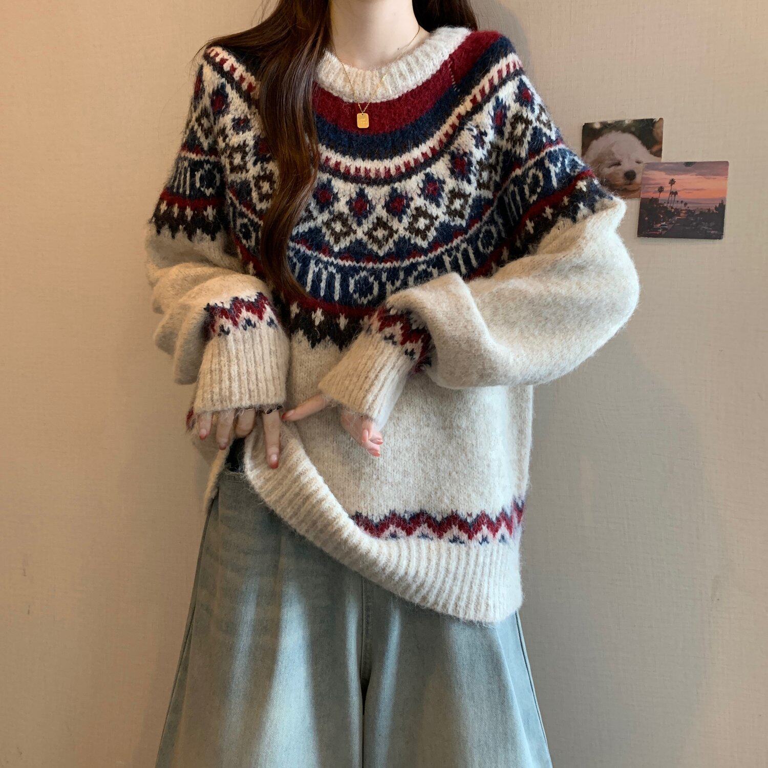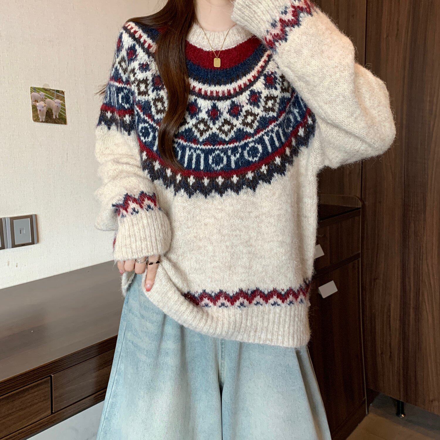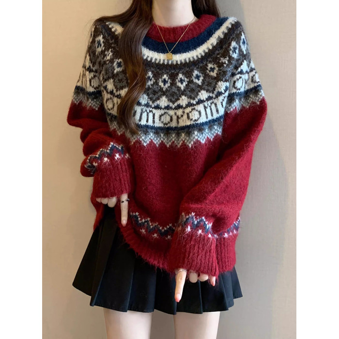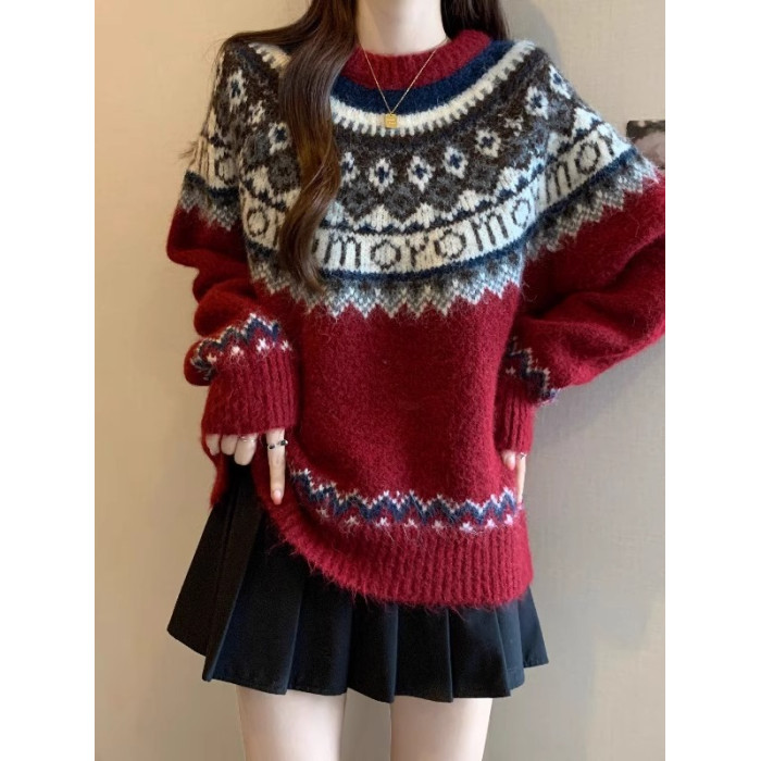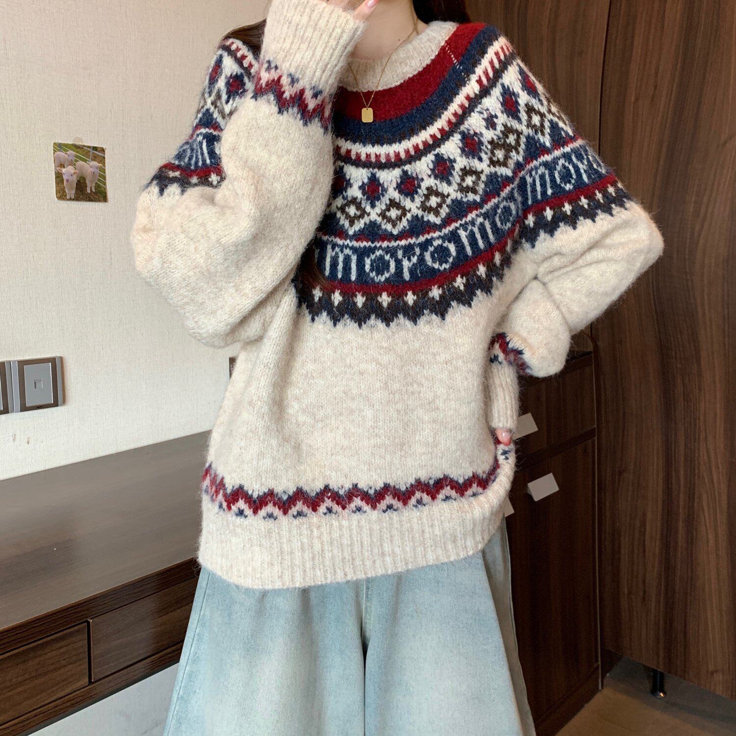 紅色費爾島毛衣女2025秋裝新款大碼胖mm加厚針織衫聖誕氛圍感上衣