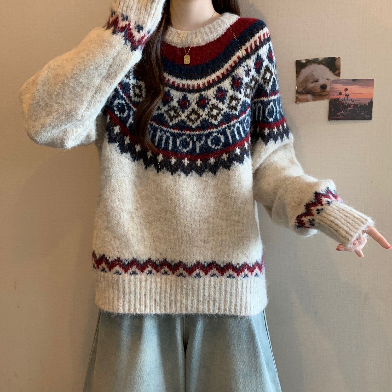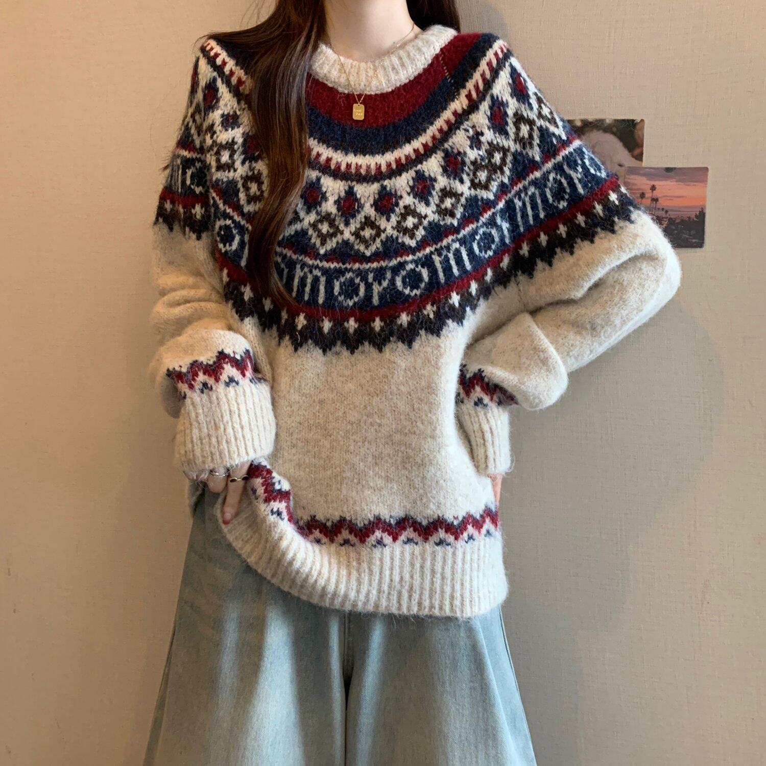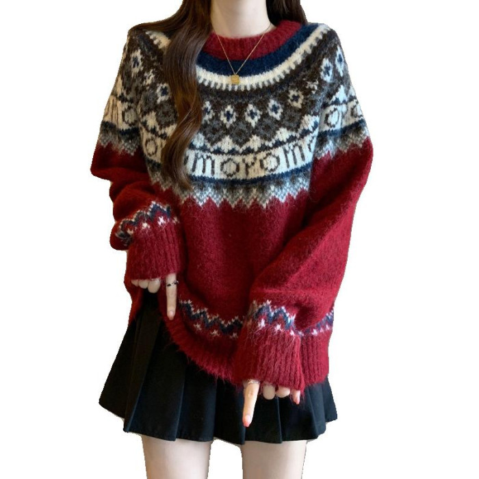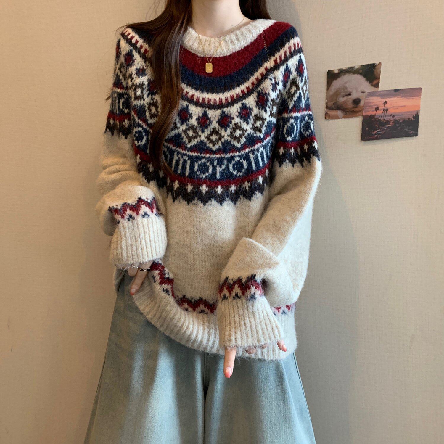紅色費爾島毛衣女2025秋裝新款大碼胖mm加厚針織衫聖誕氛圍感上衣
