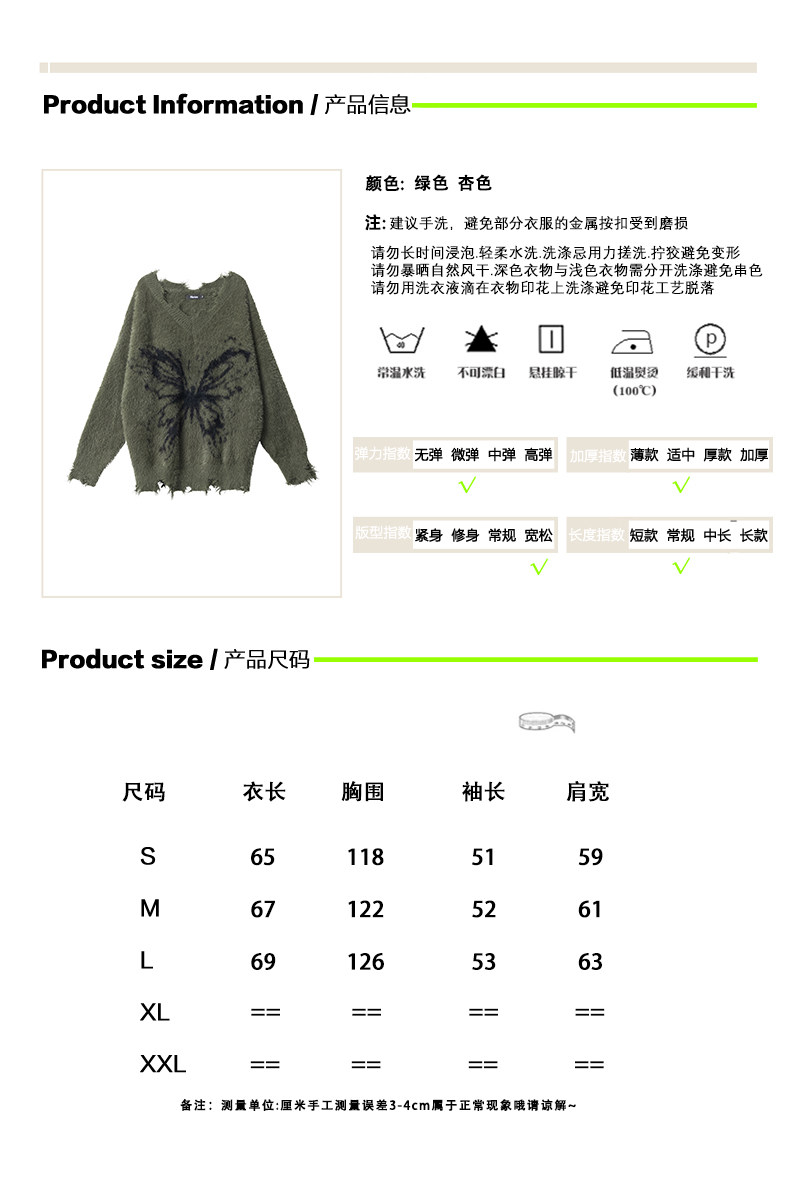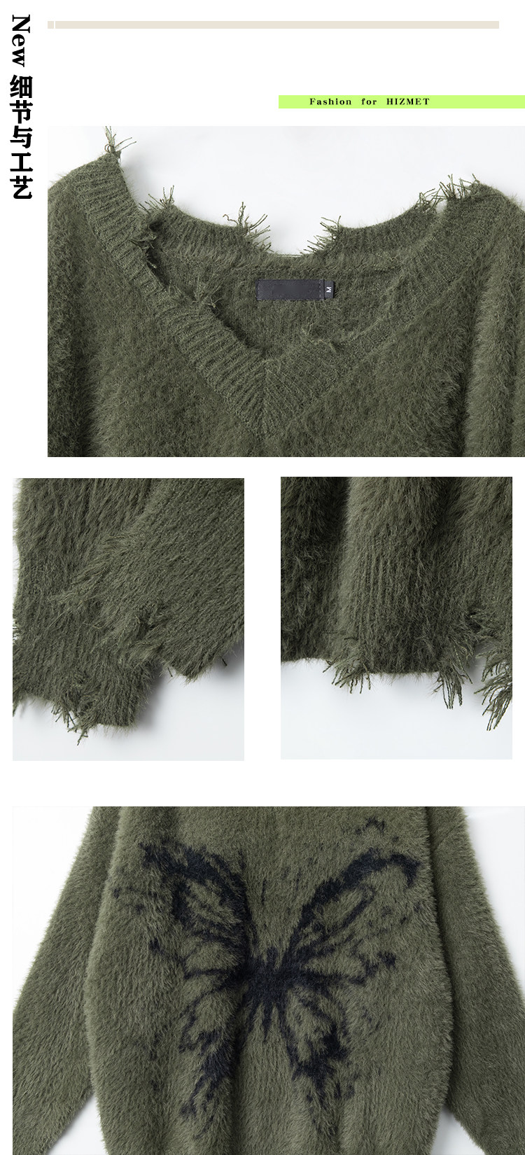 BIGGOLD廢土風磨破毛v領毛衣女秋冬設計感慵懶風蝴蝶馬海毛針織衫
