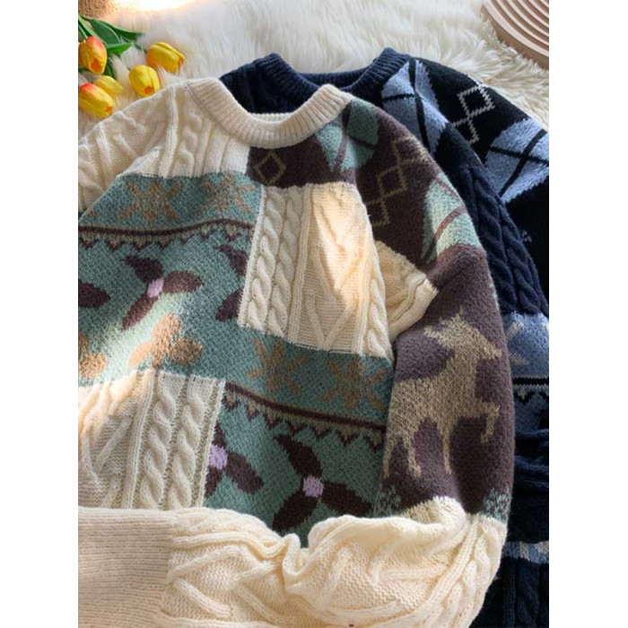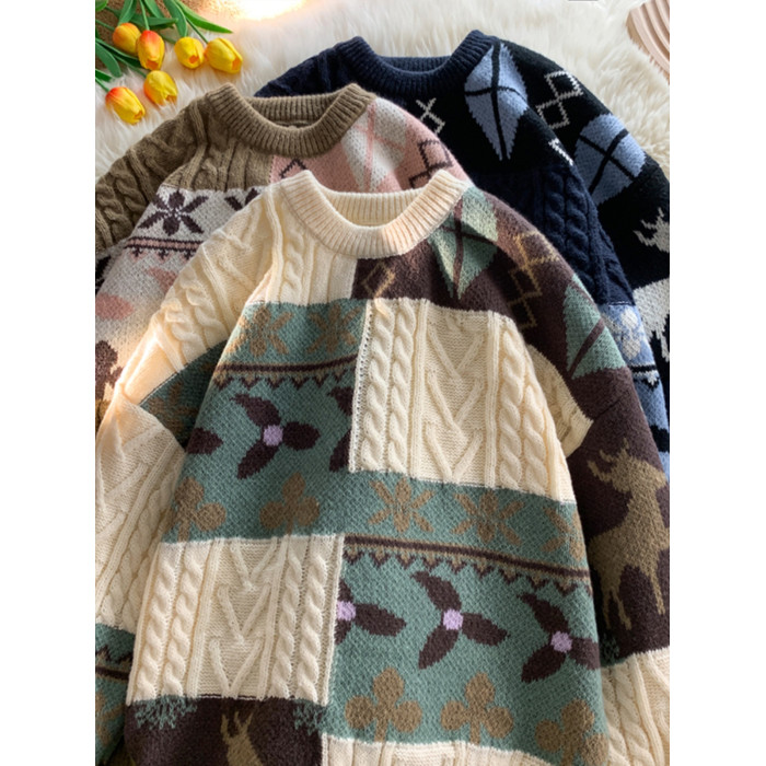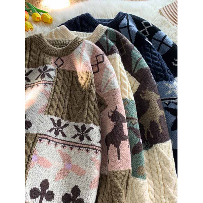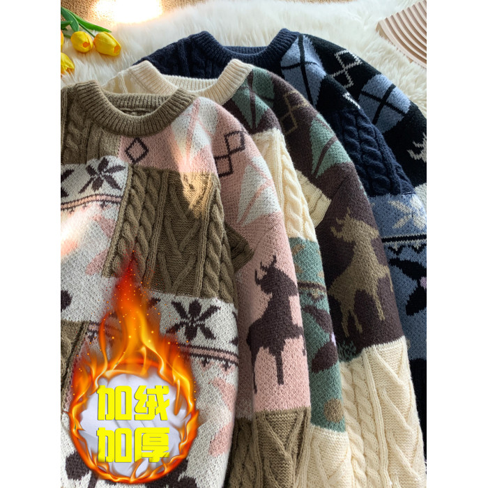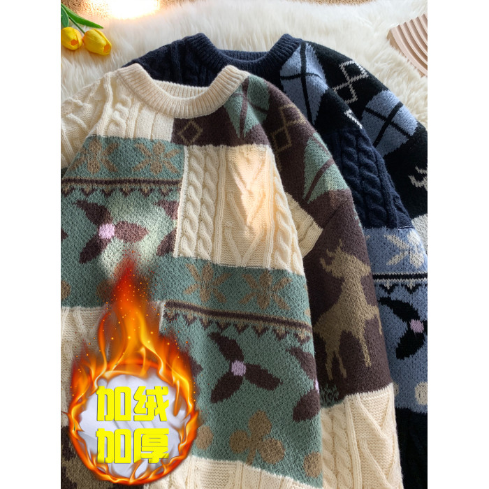 秋冬季聖誕節毛衣男圓領加絨休閒潮牌日系復古美式情侶百搭針織衫