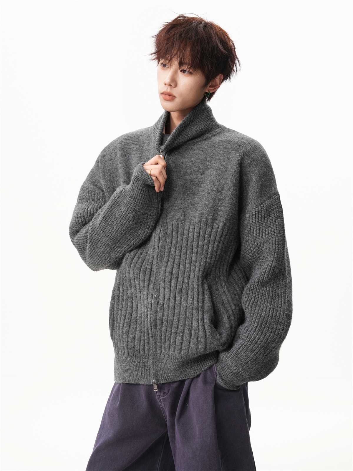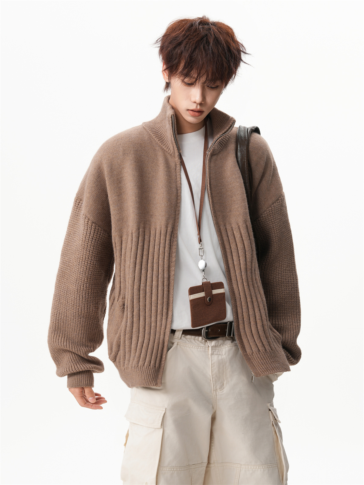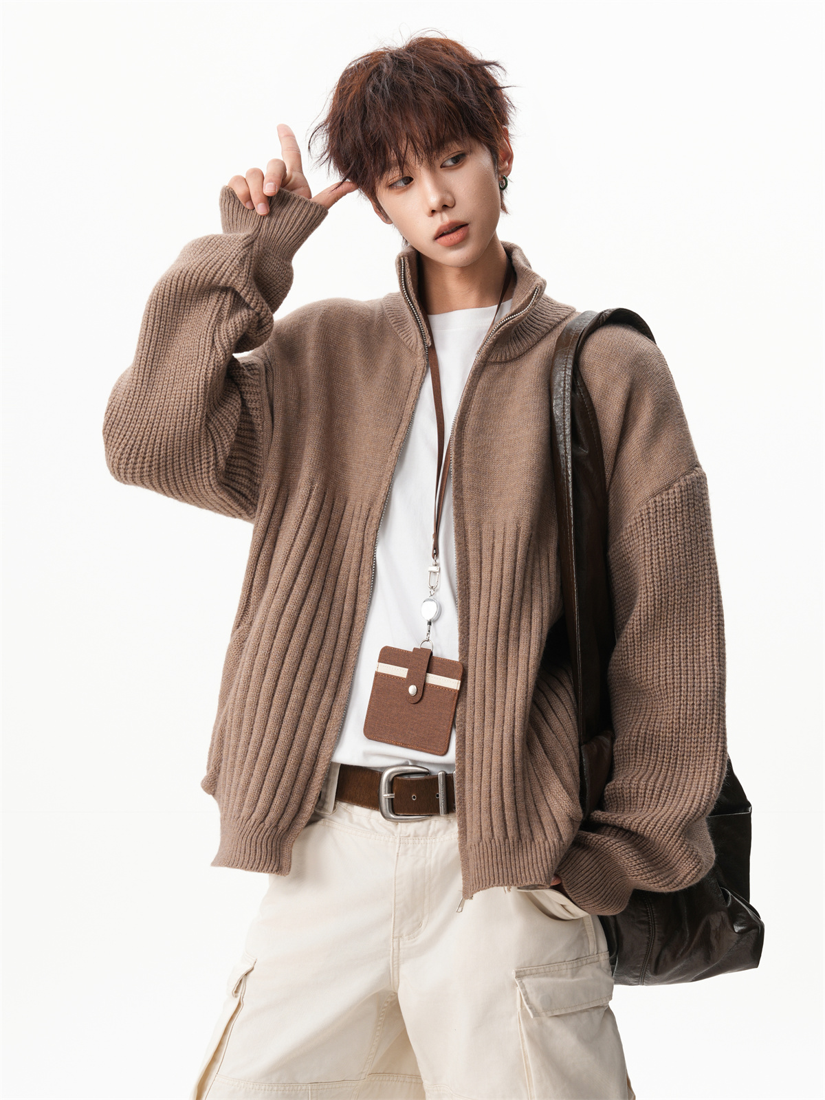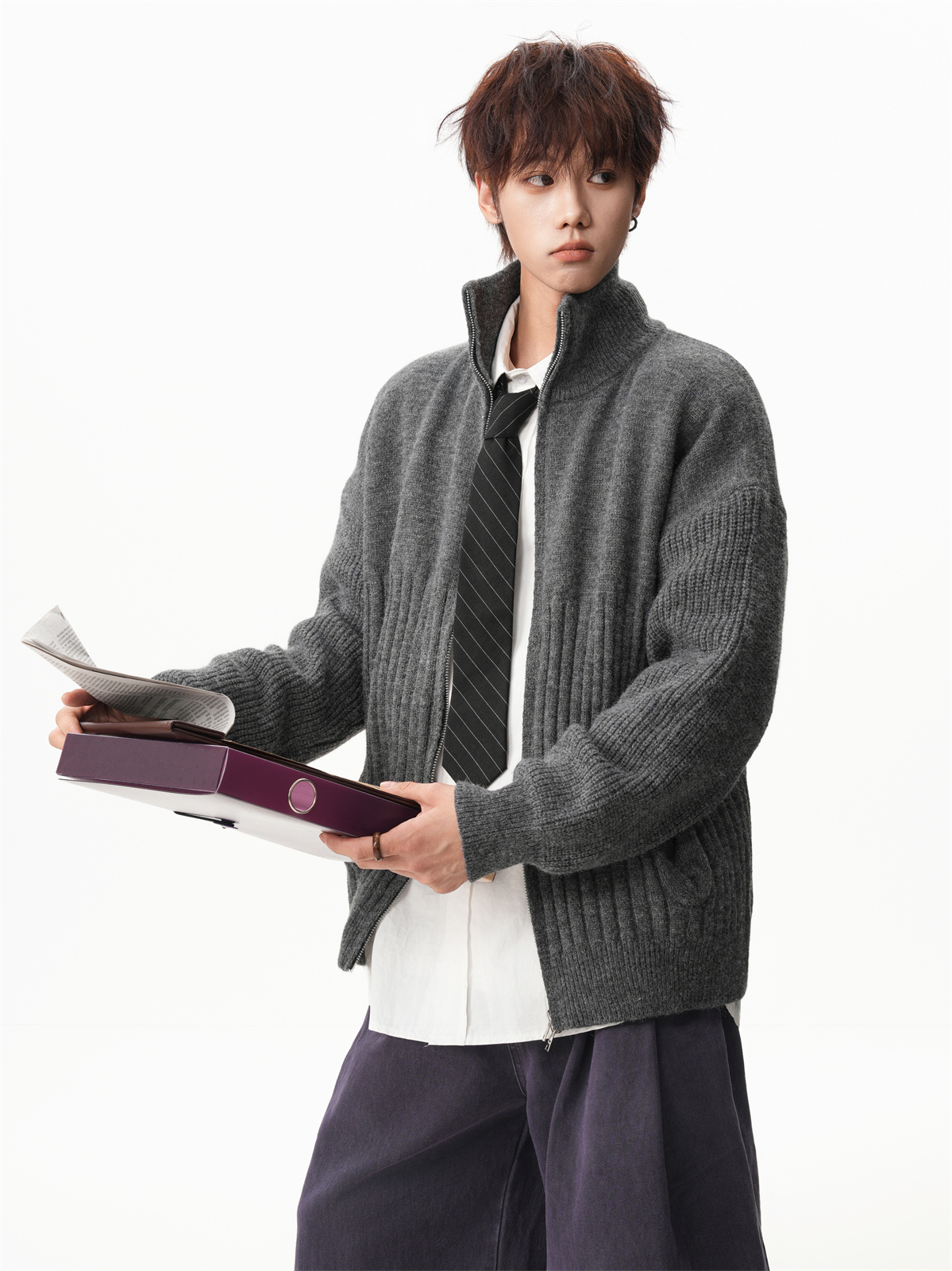 美拉德肌理感毛衣開衫男女秋冬cleanfit寬松慵懶感大碼立領針織衫