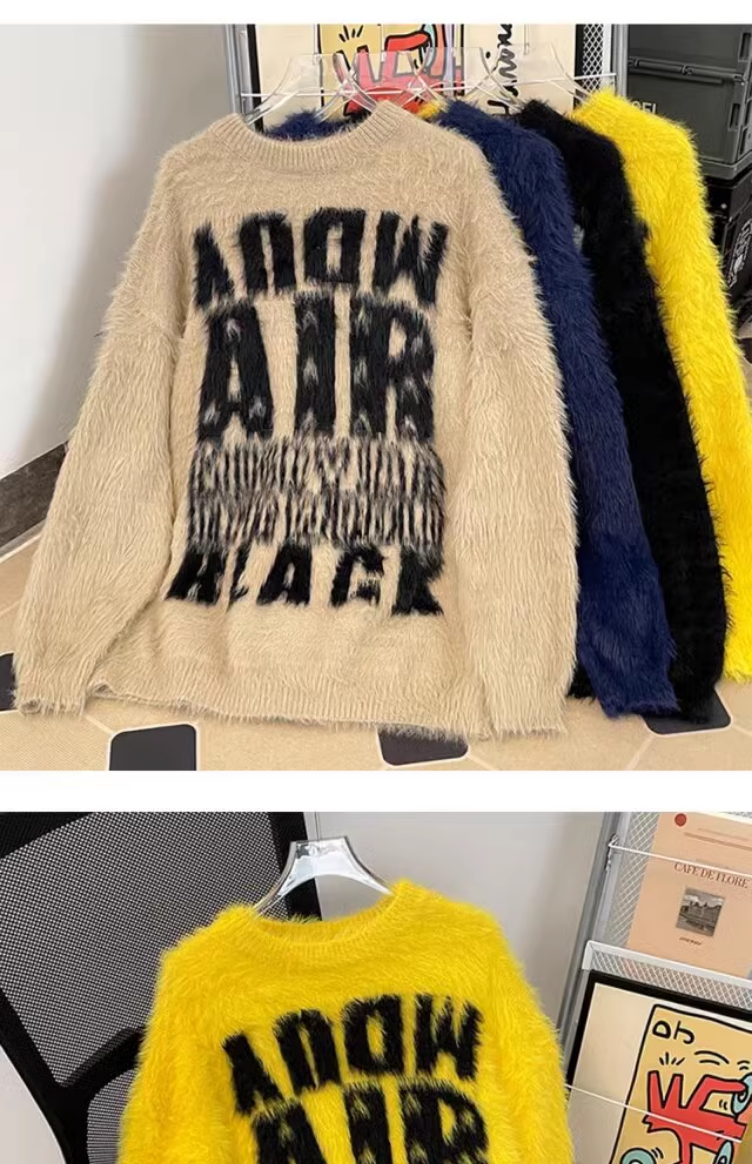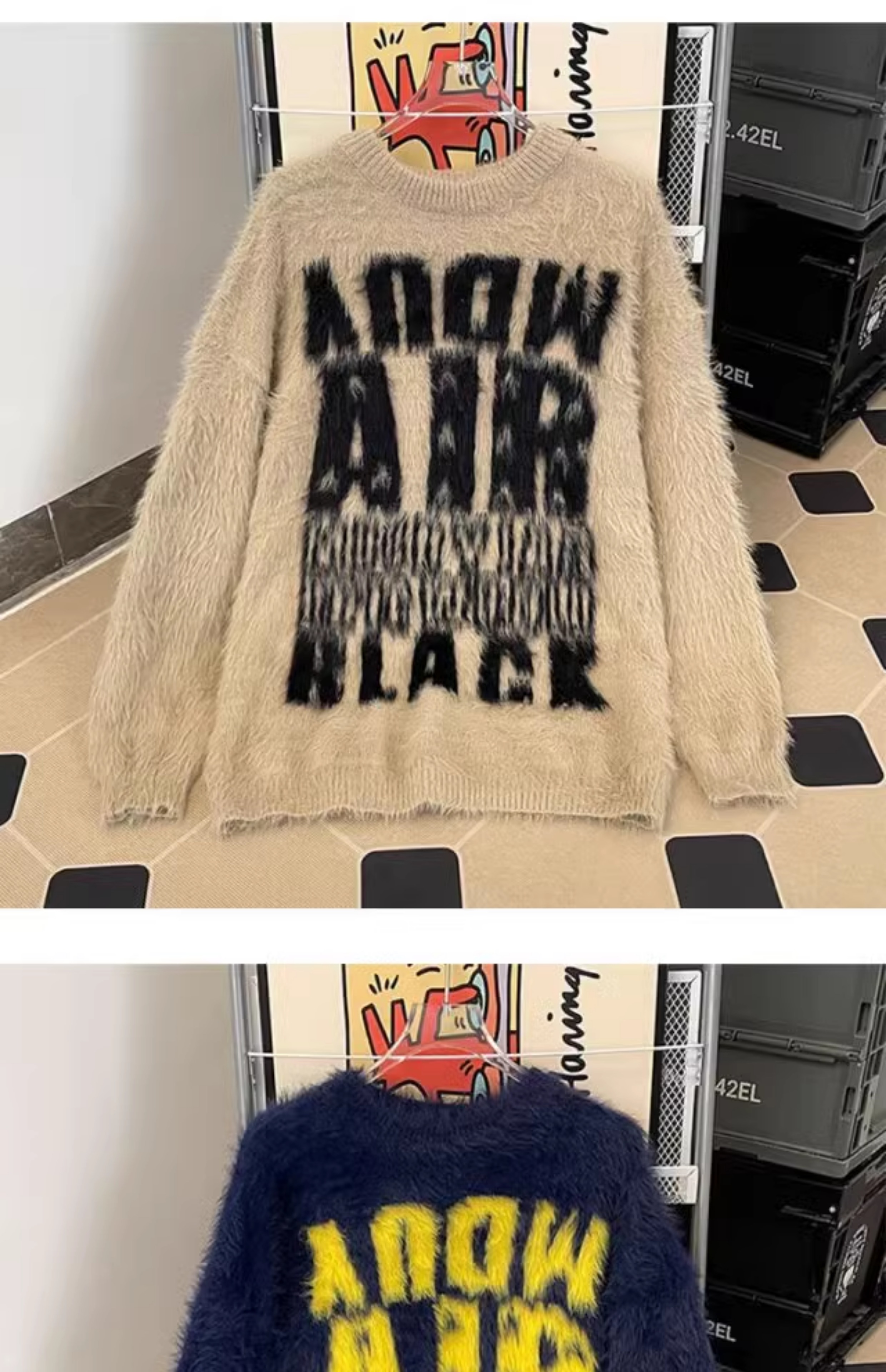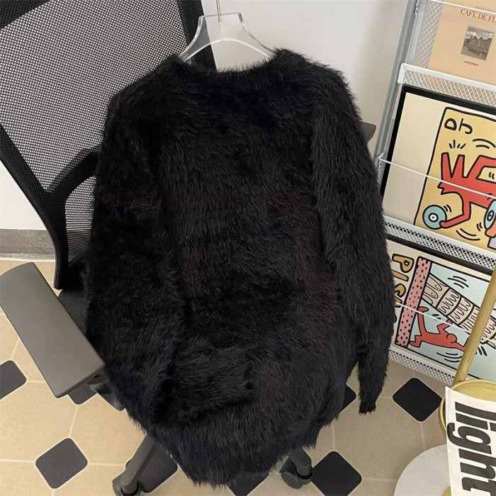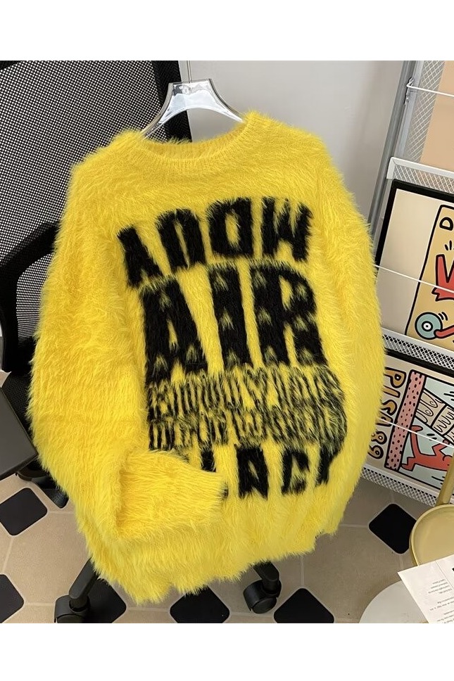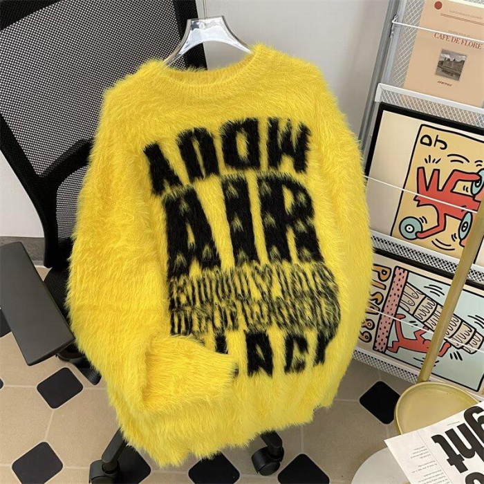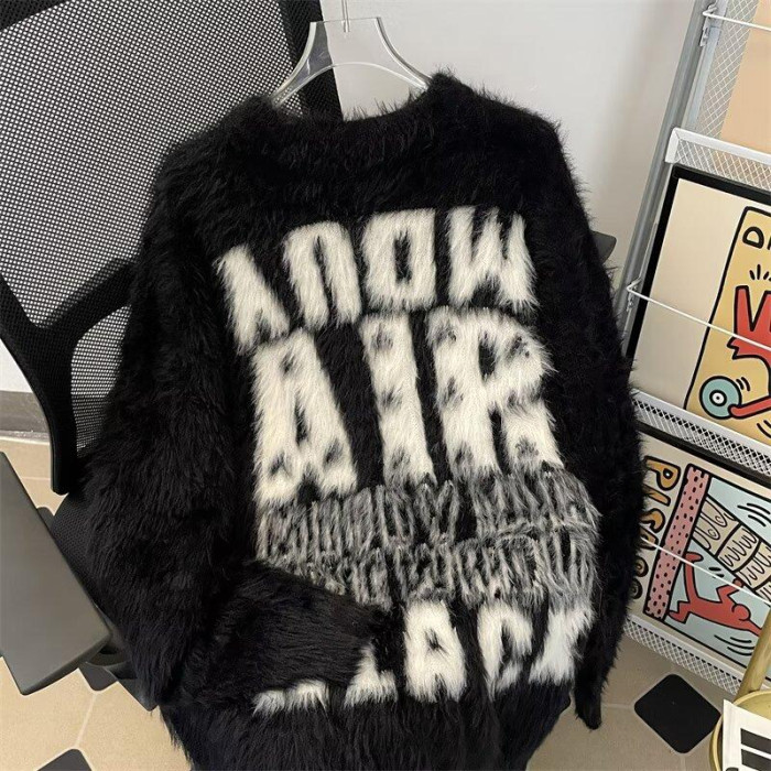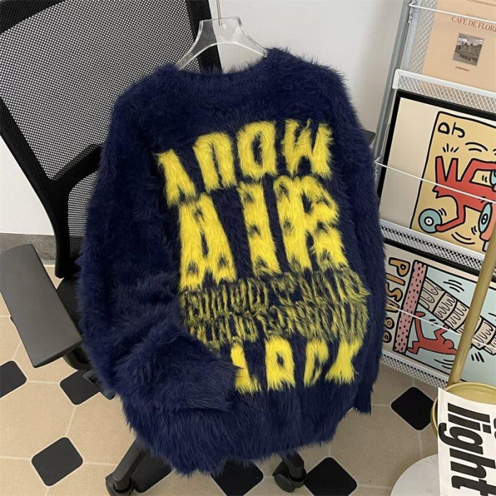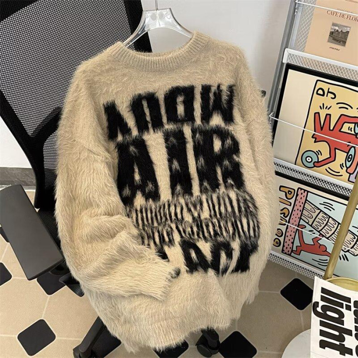 美式字母提花水貂絨毛衣男女寬松圓領學院風情侶潮牌針織打底衫