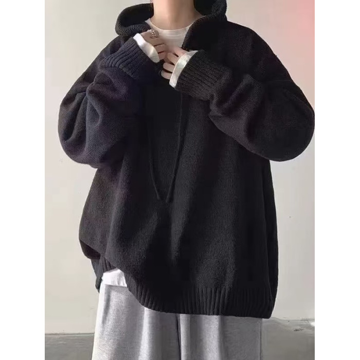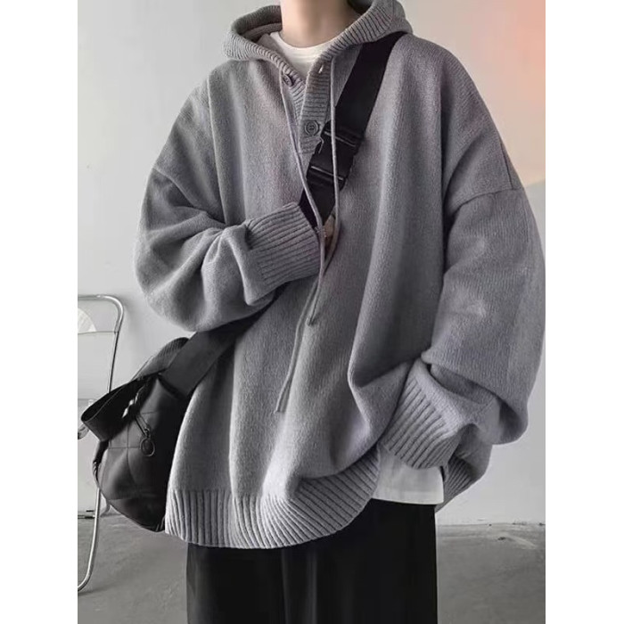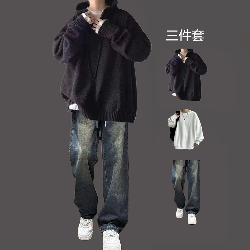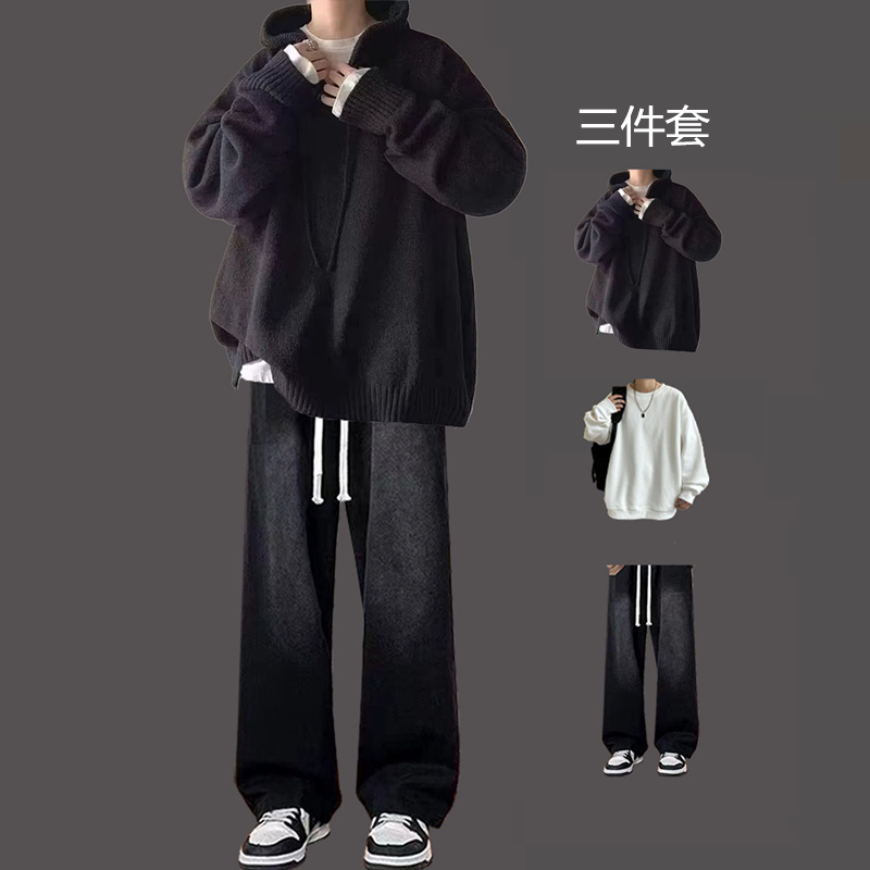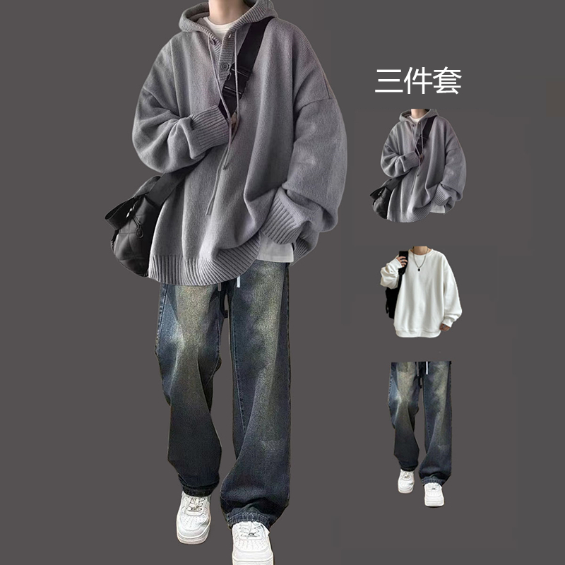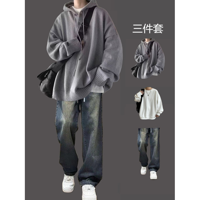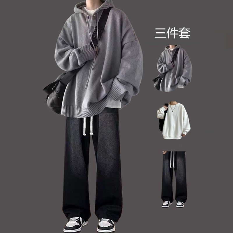 日系連帽毛衣男三件套慵懶風秋冬青少年寬松高級感潮牌針織衫套裝