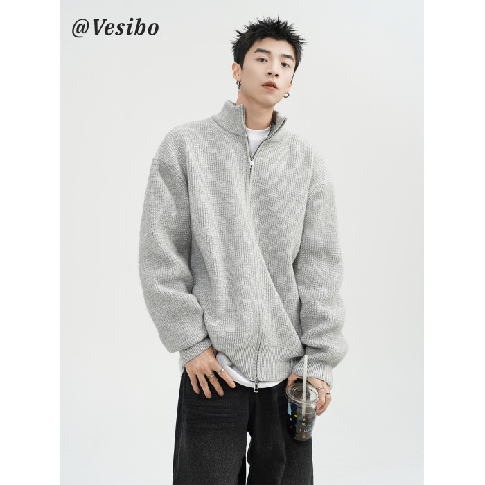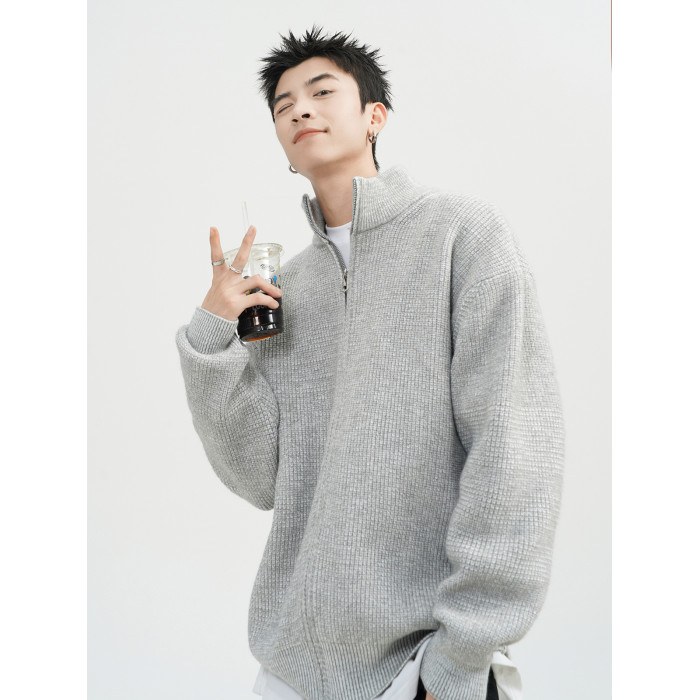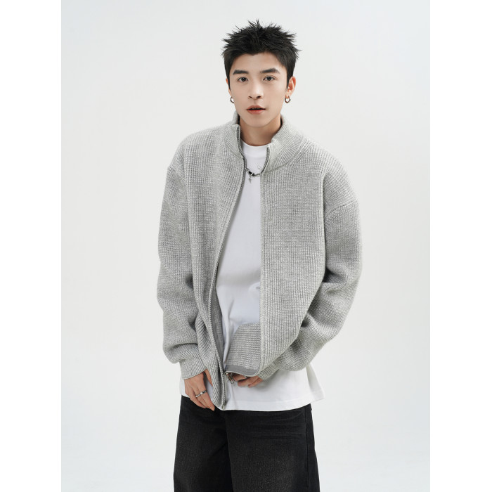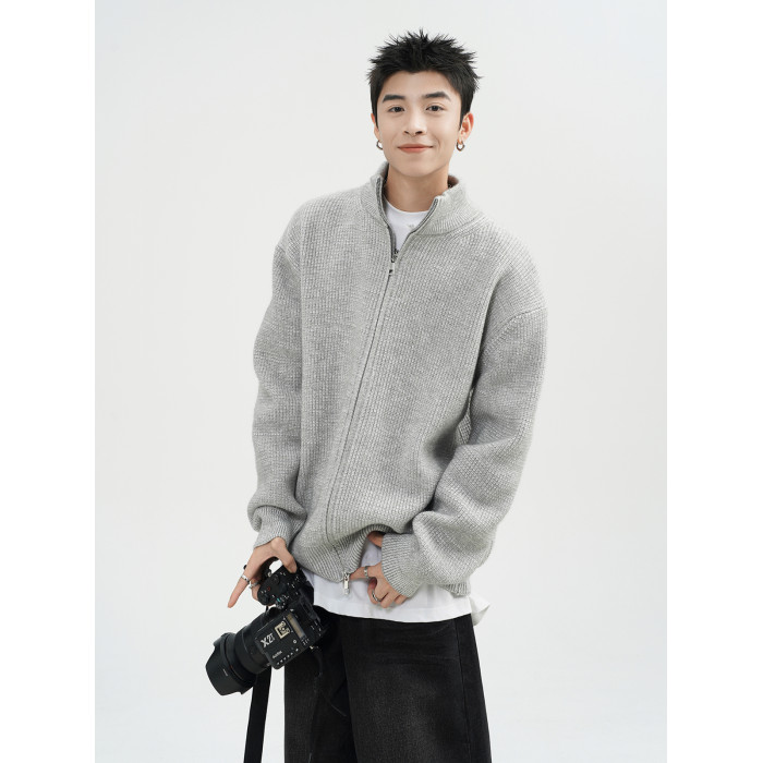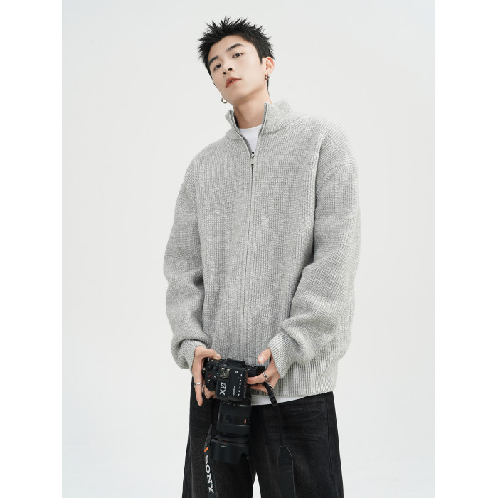 美式雙拉鍊開衫毛衣男冬高街立領針織衫外套潮牌百搭休閒情侶上衣