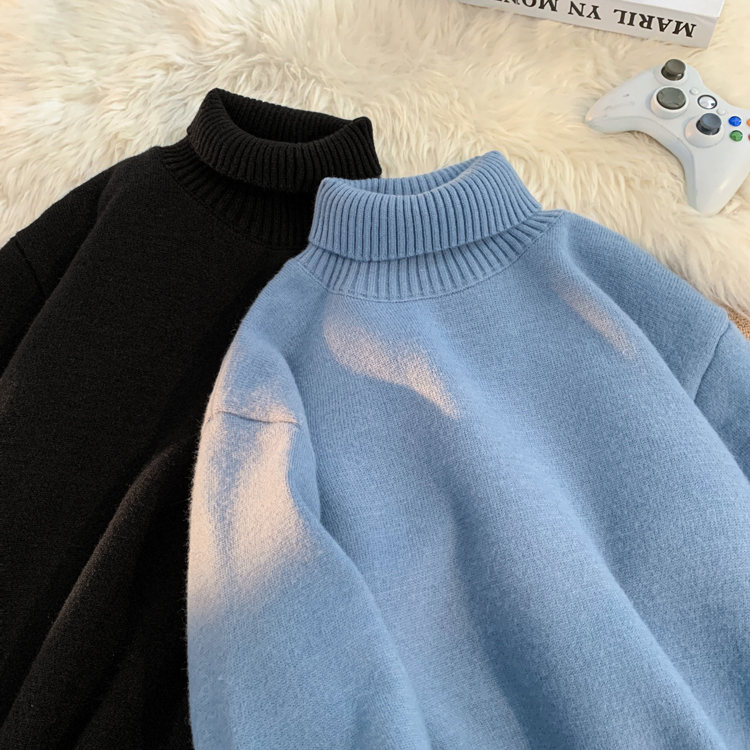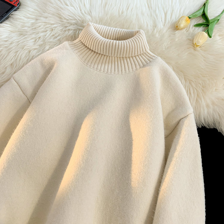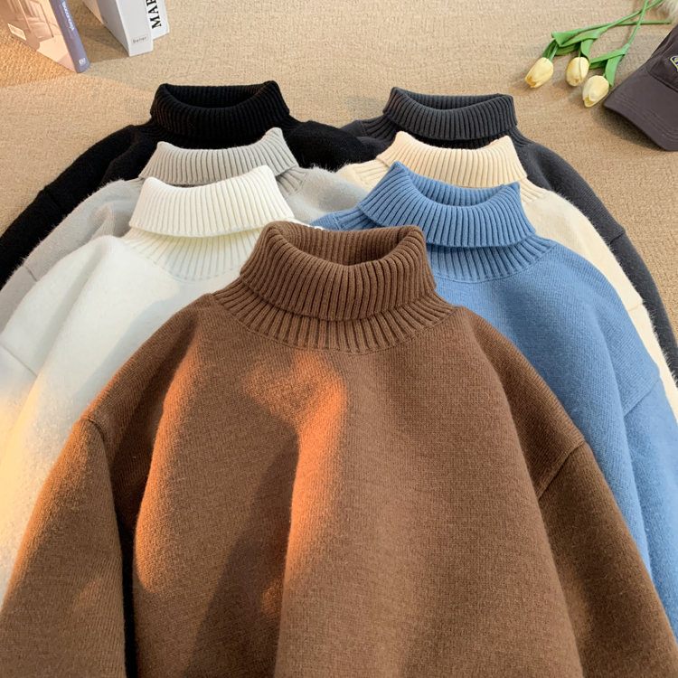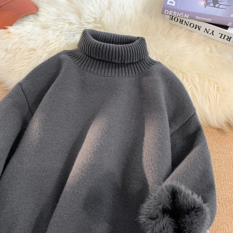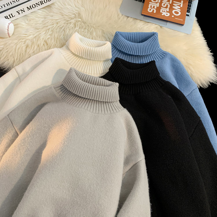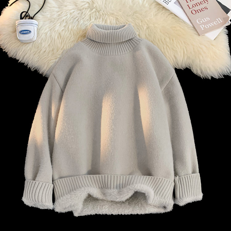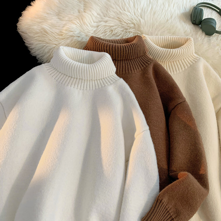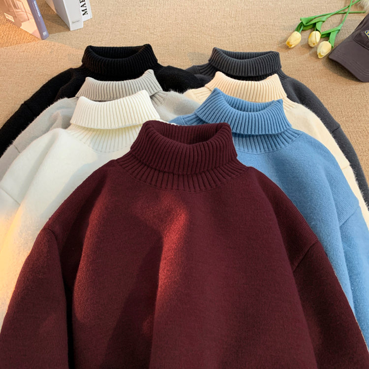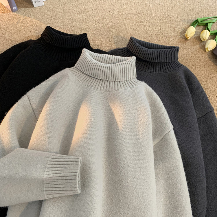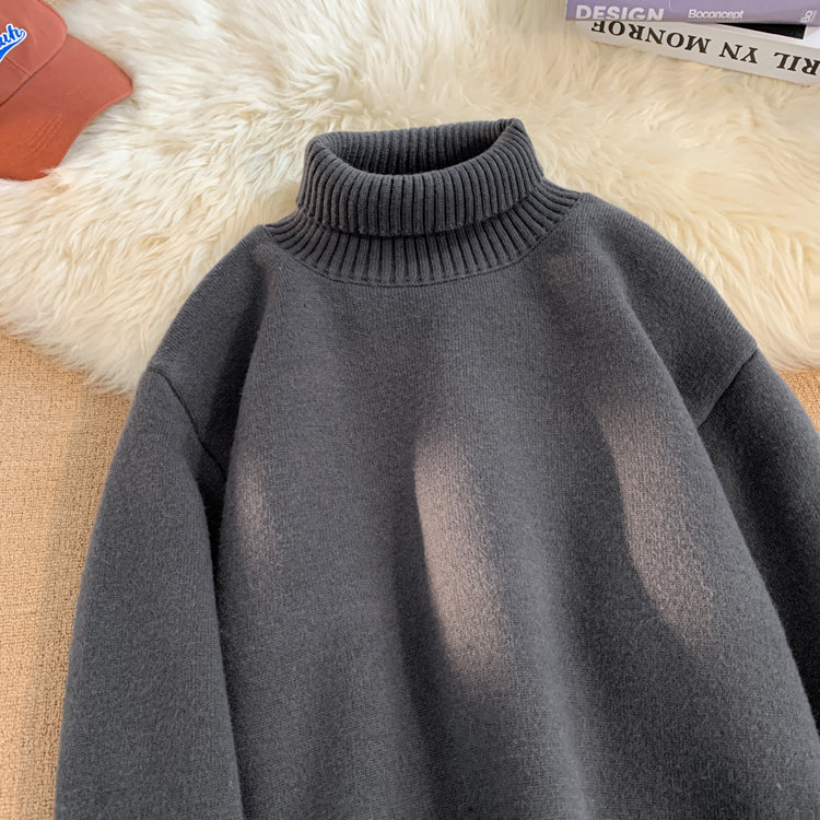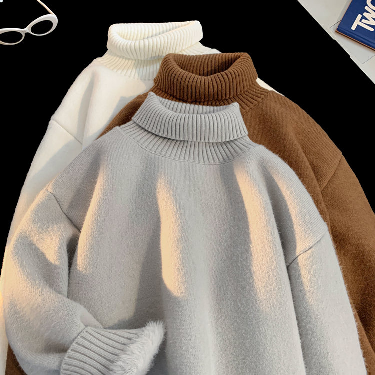 秋冬純色高領毛衣男加絨加厚寬松簡約翻領針織衫保暖內搭長袖潮流