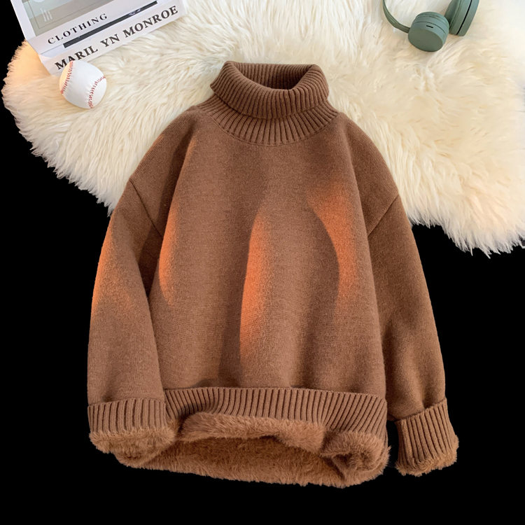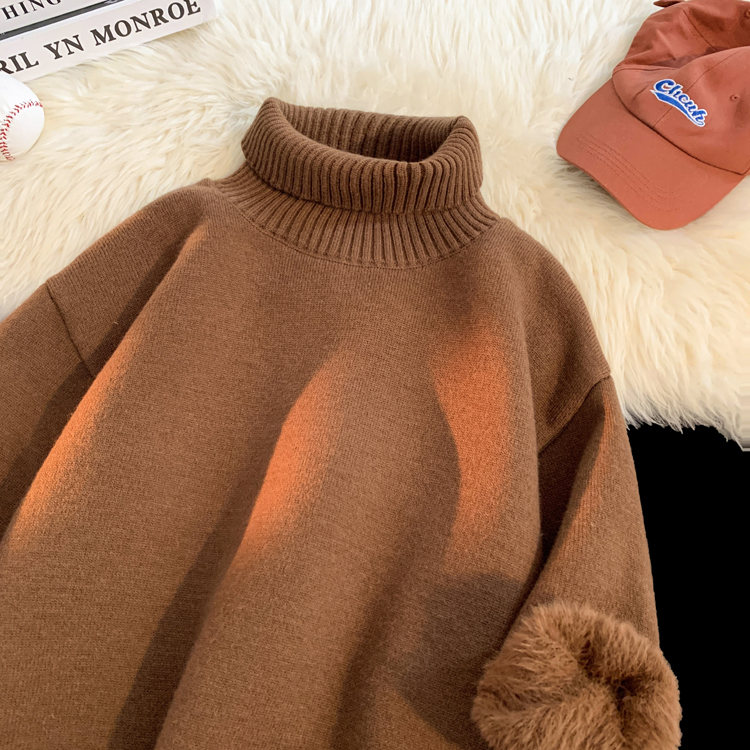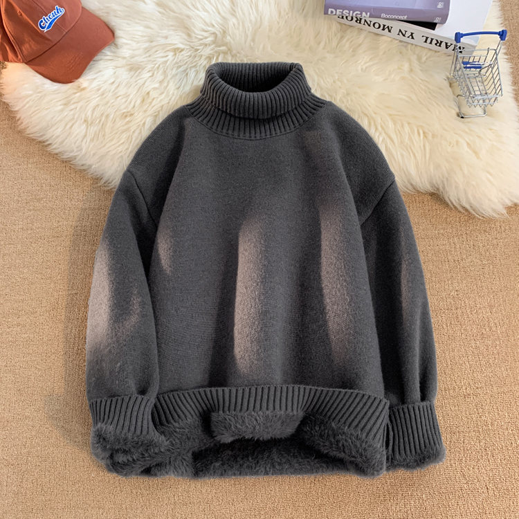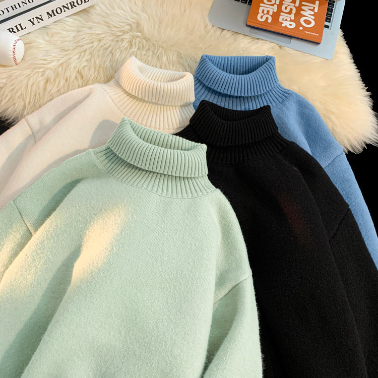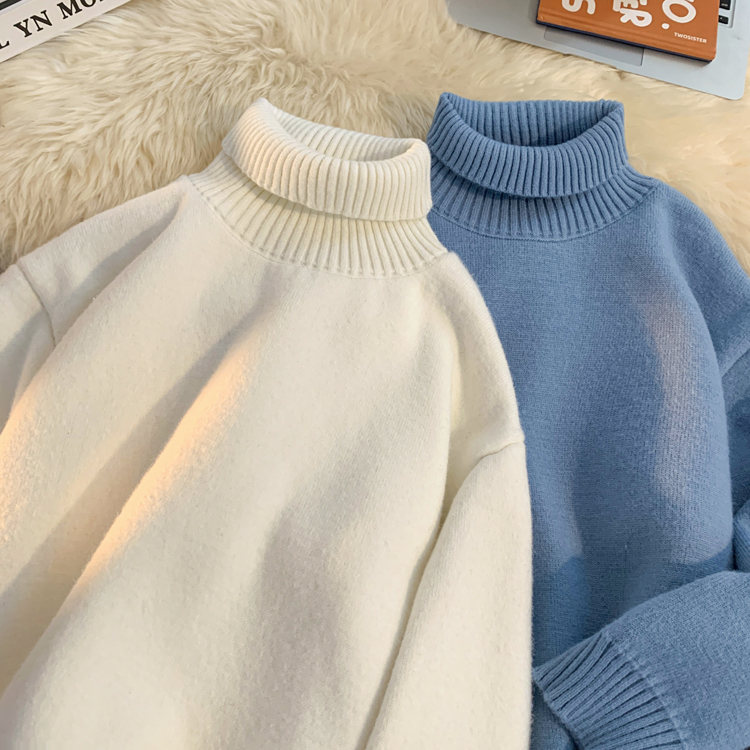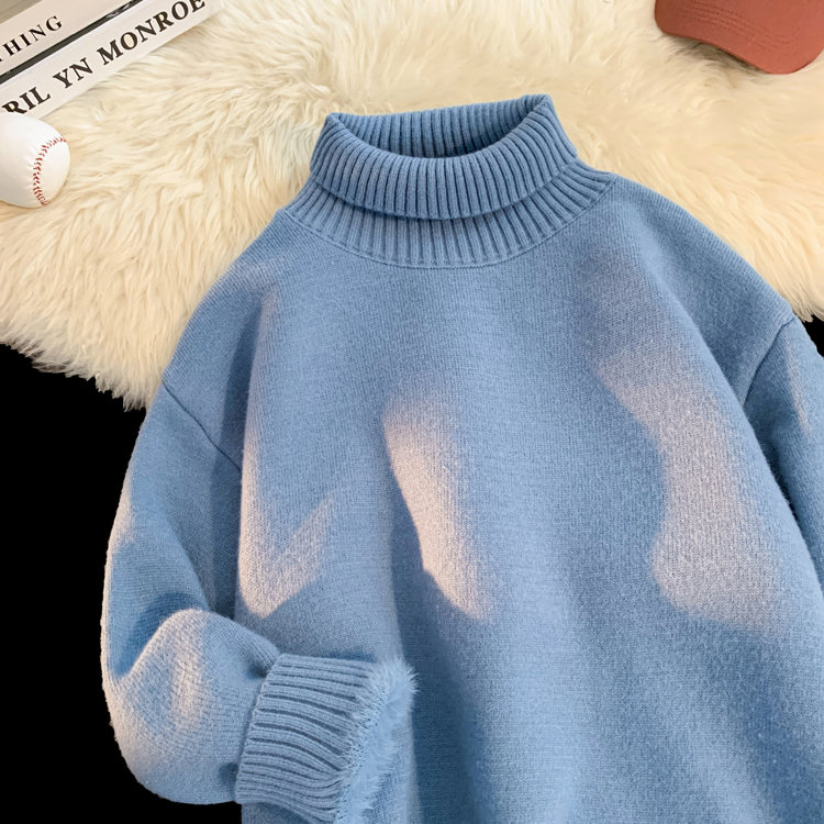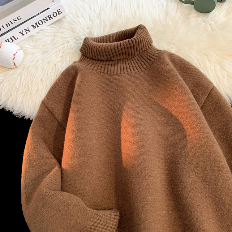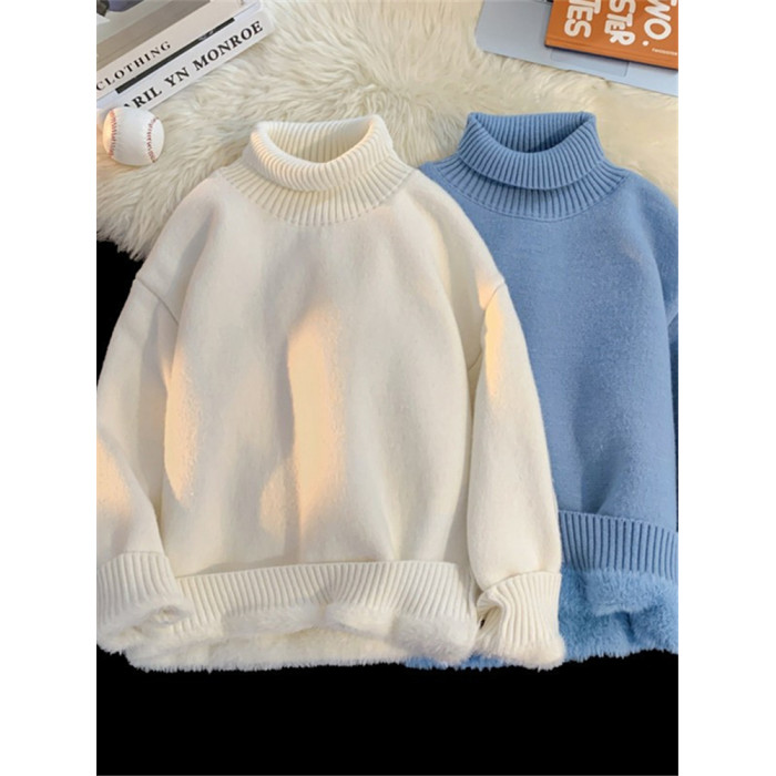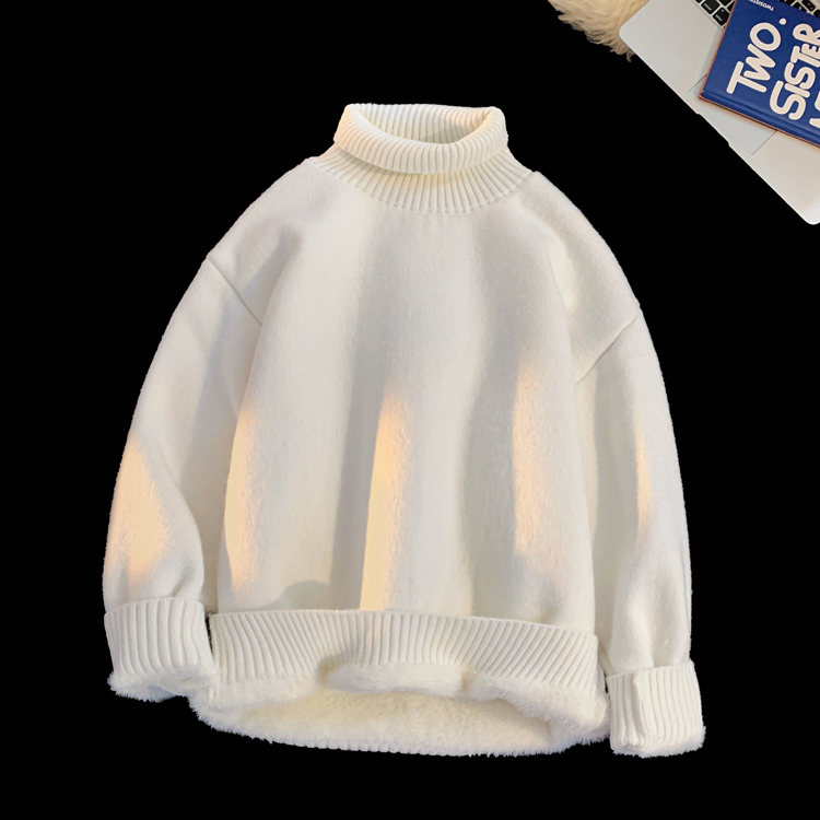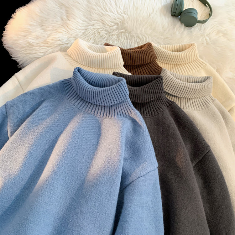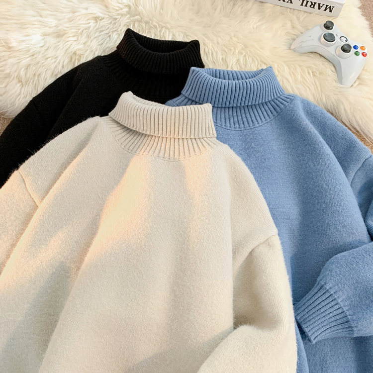 秋冬純色高領毛衣男加絨加厚寬松簡約翻領針織衫保暖內搭長袖潮流