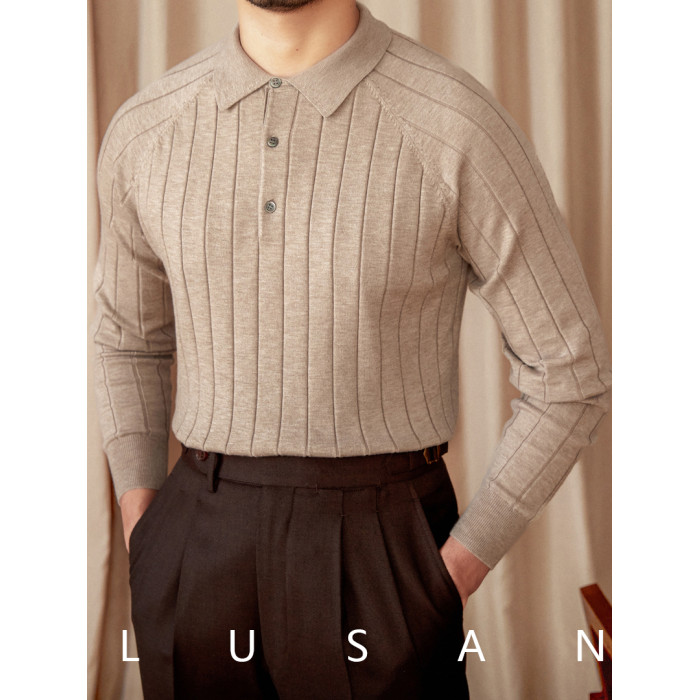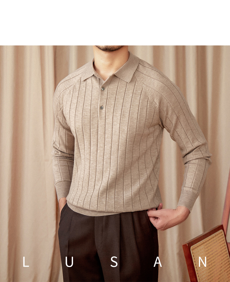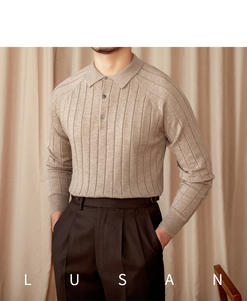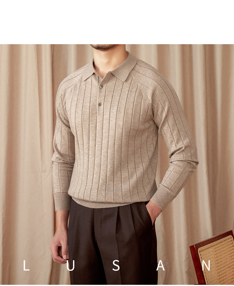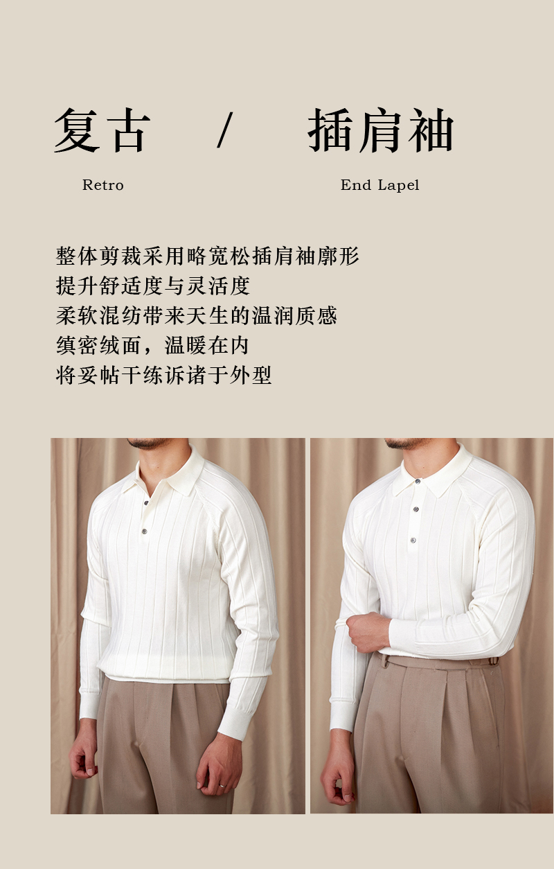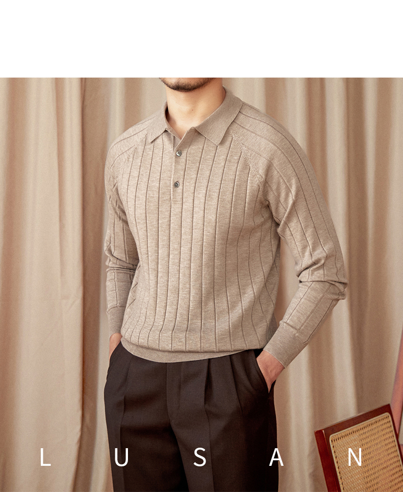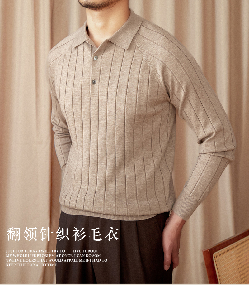 鹿三先生秋冬英倫修身翻領長袖POLO薄款羊毛+桑蠶絲打底針織衫男