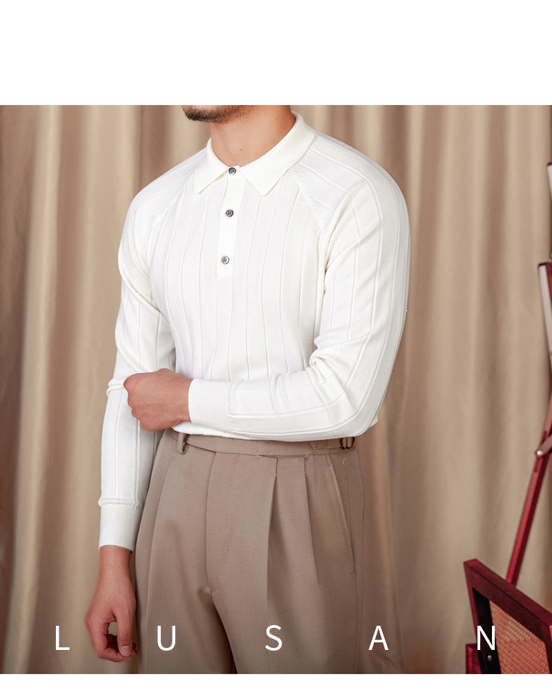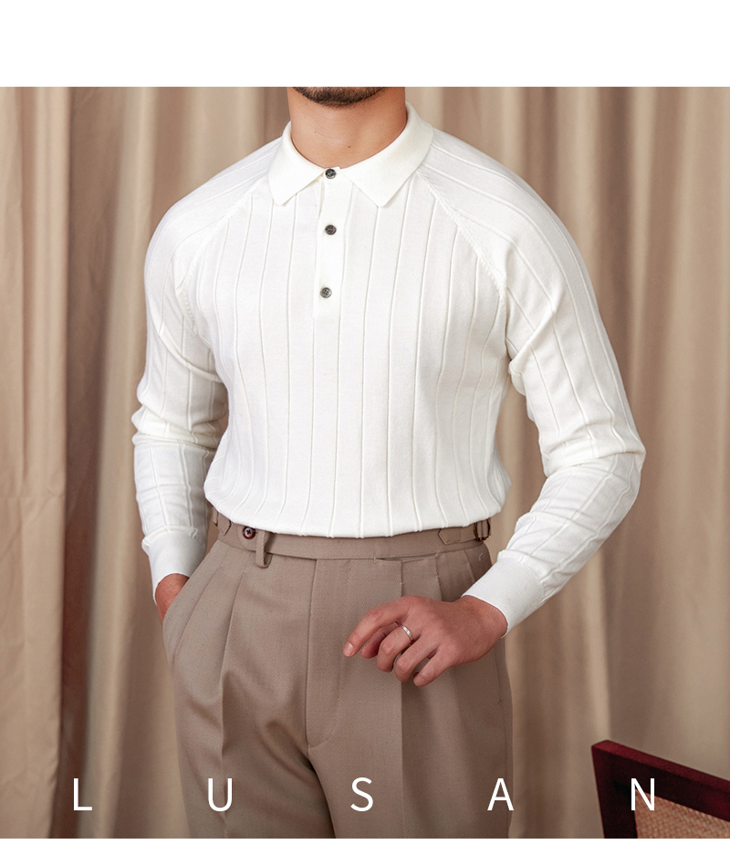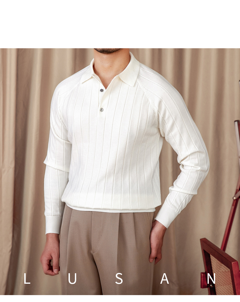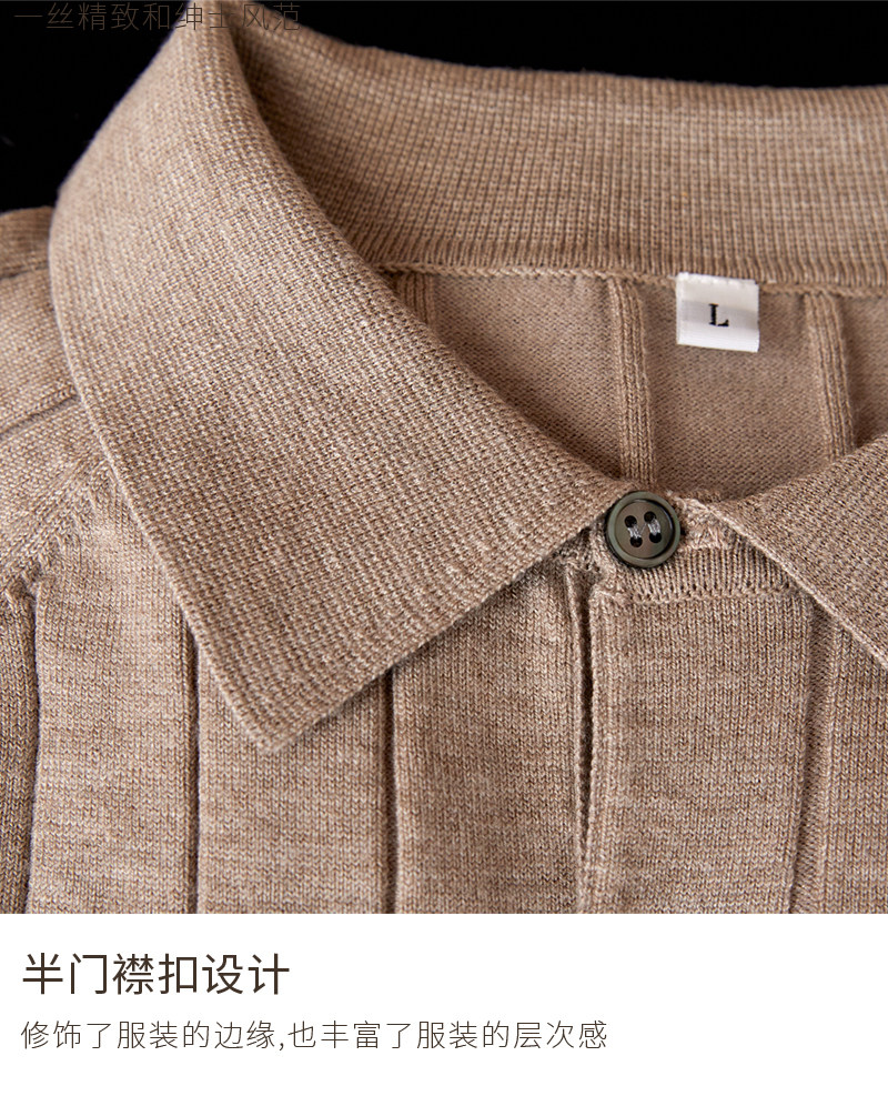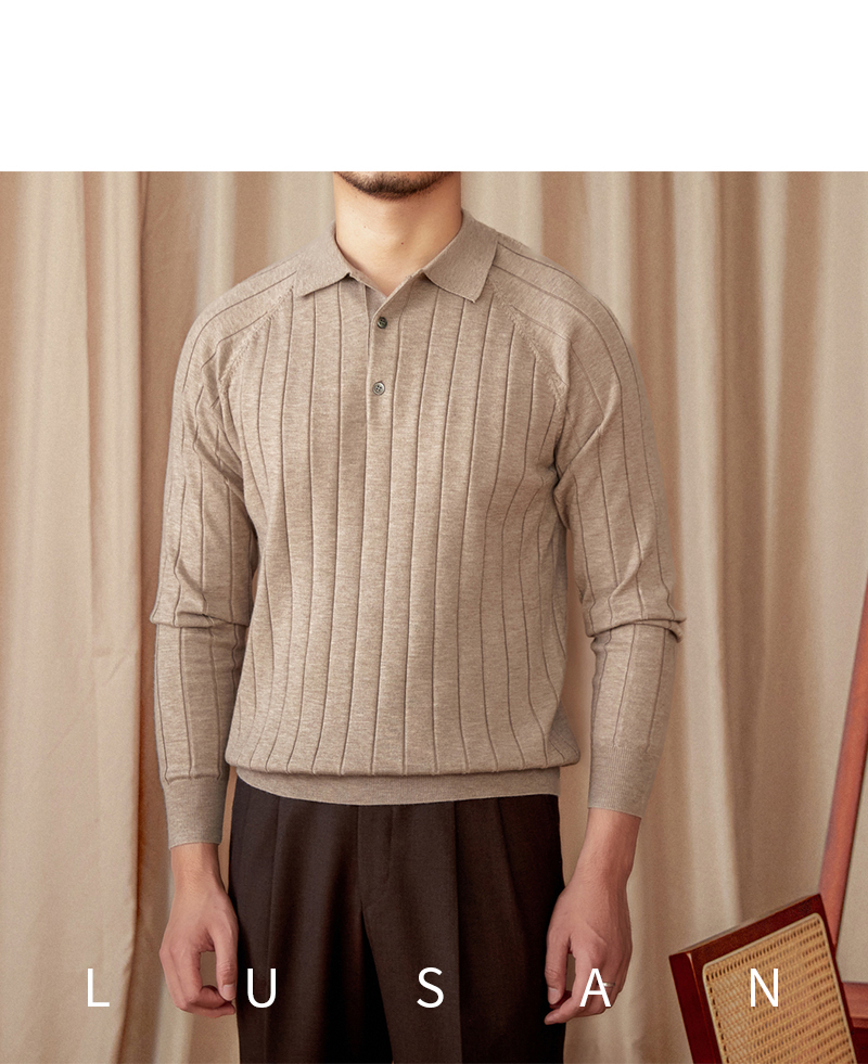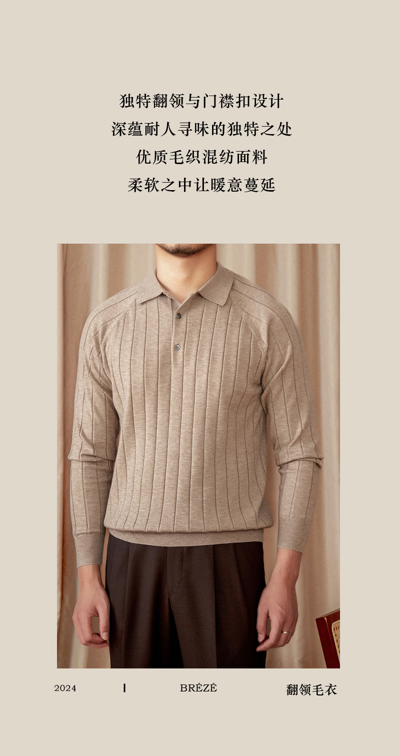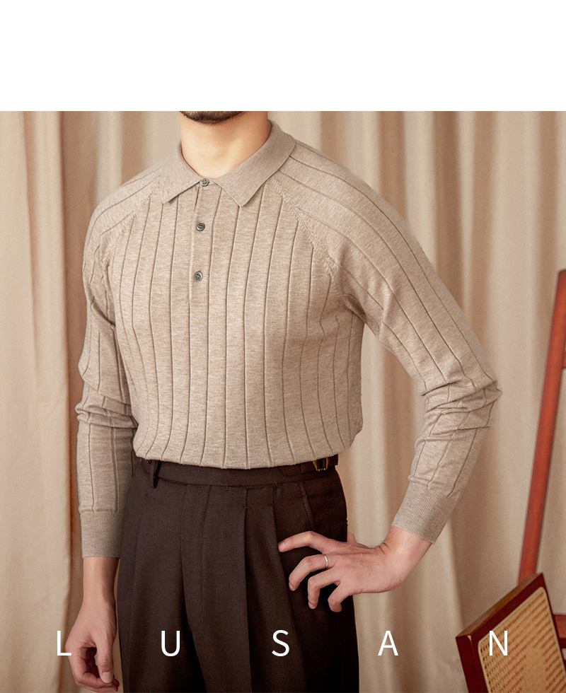 鹿三先生秋冬英倫修身翻領長袖POLO薄款羊毛+桑蠶絲打底針織衫男