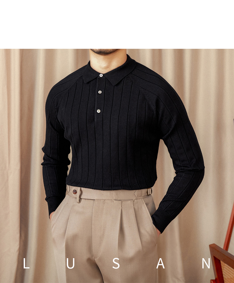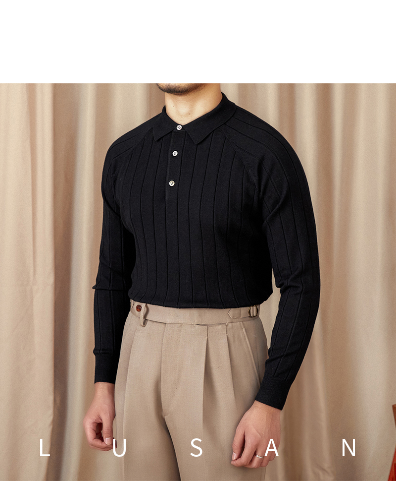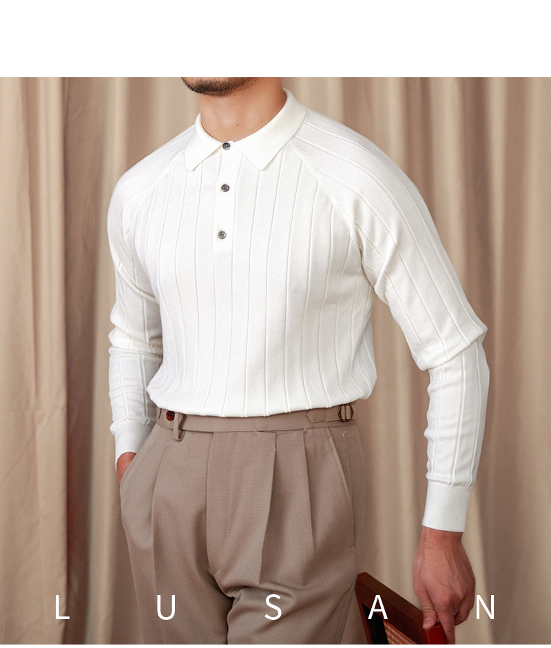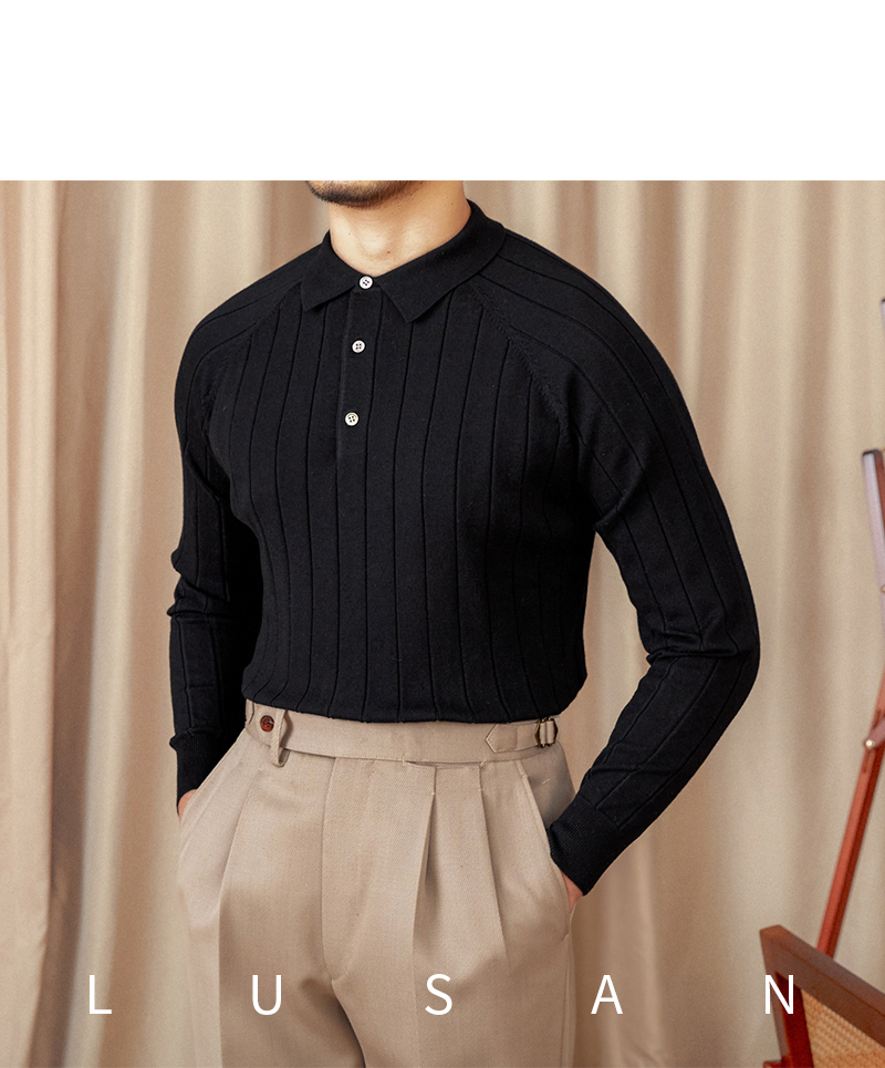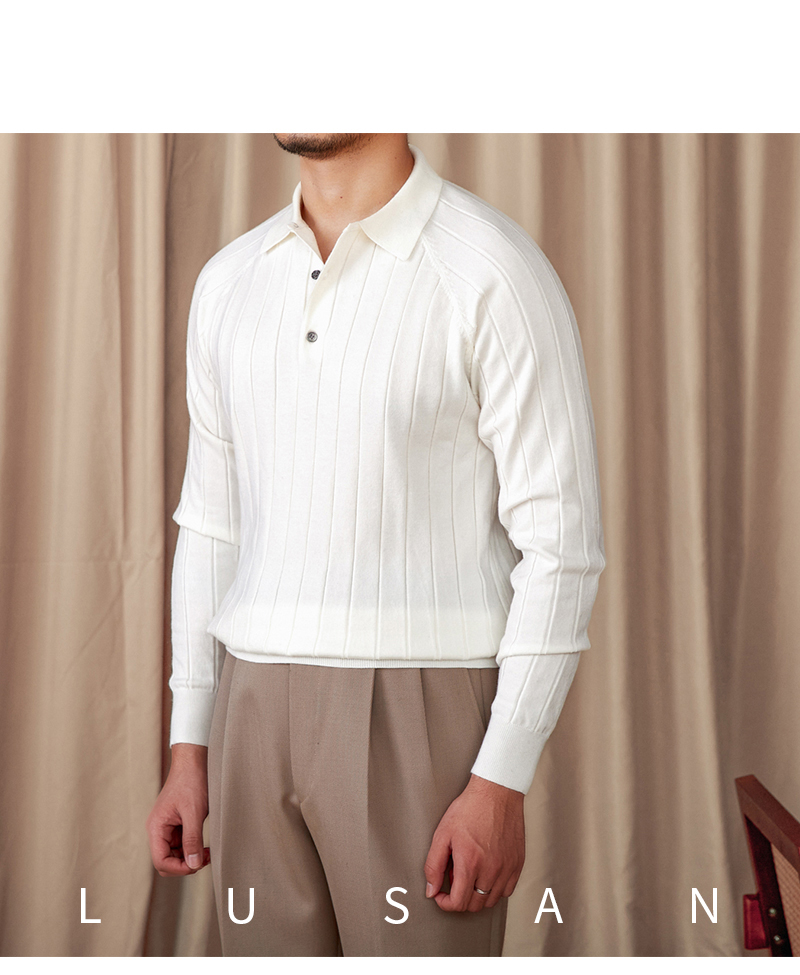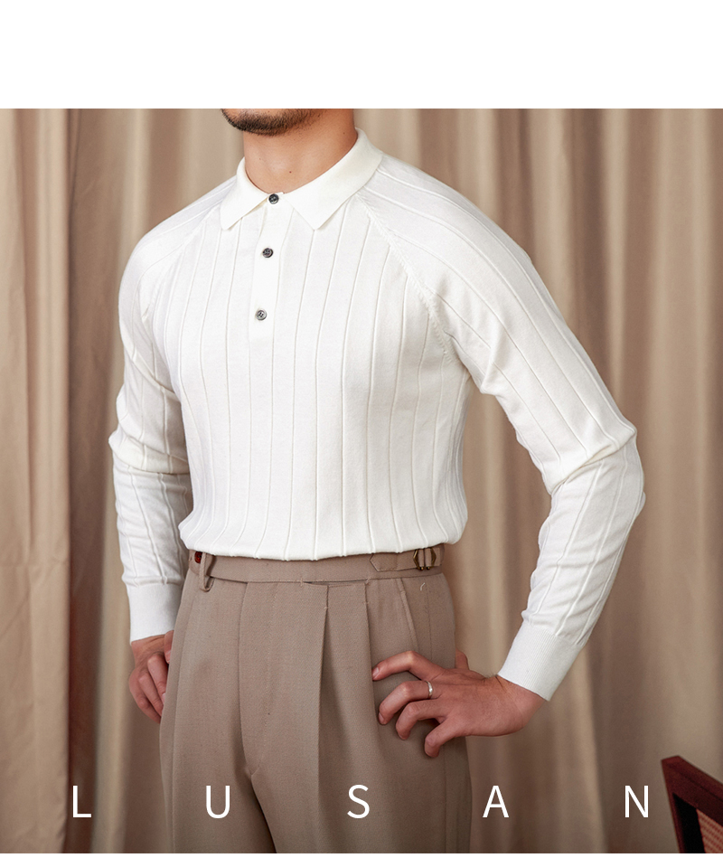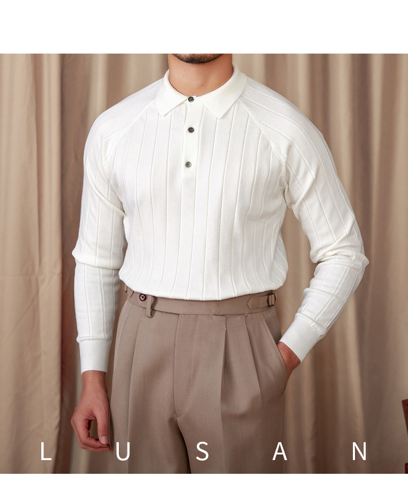 鹿三先生秋冬英倫修身翻領長袖POLO薄款羊毛+桑蠶絲打底針織衫男