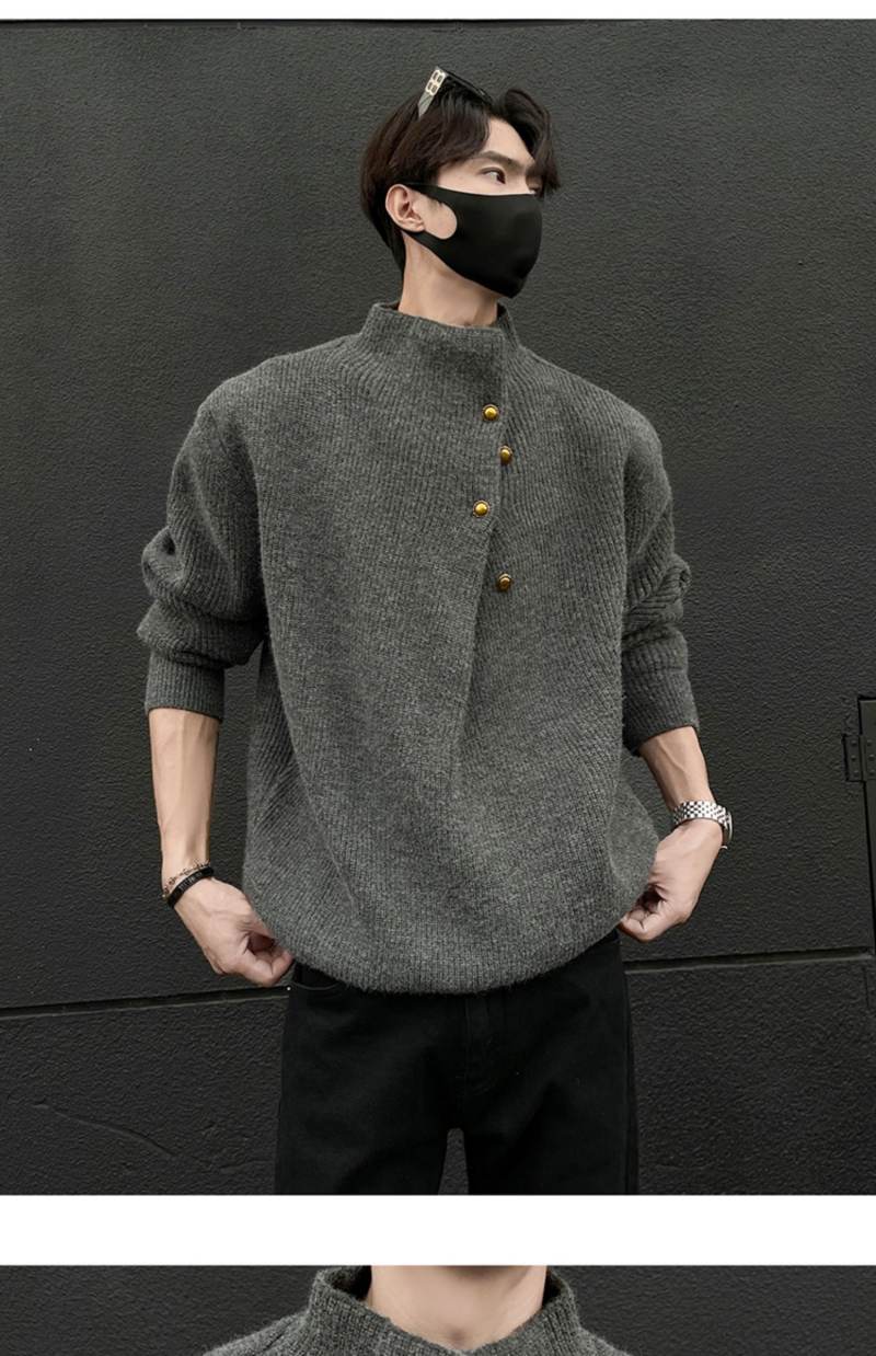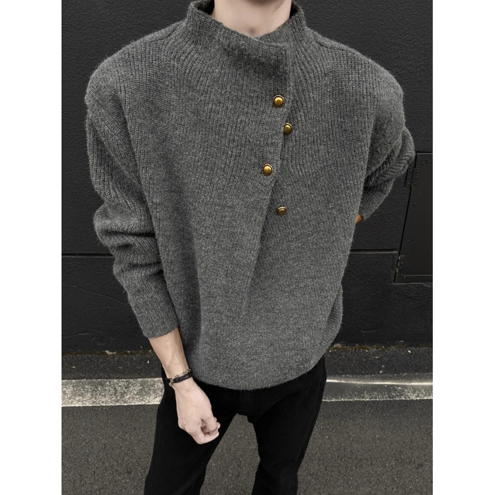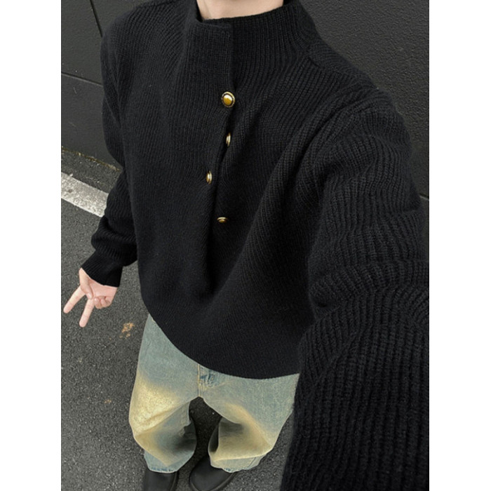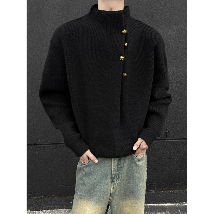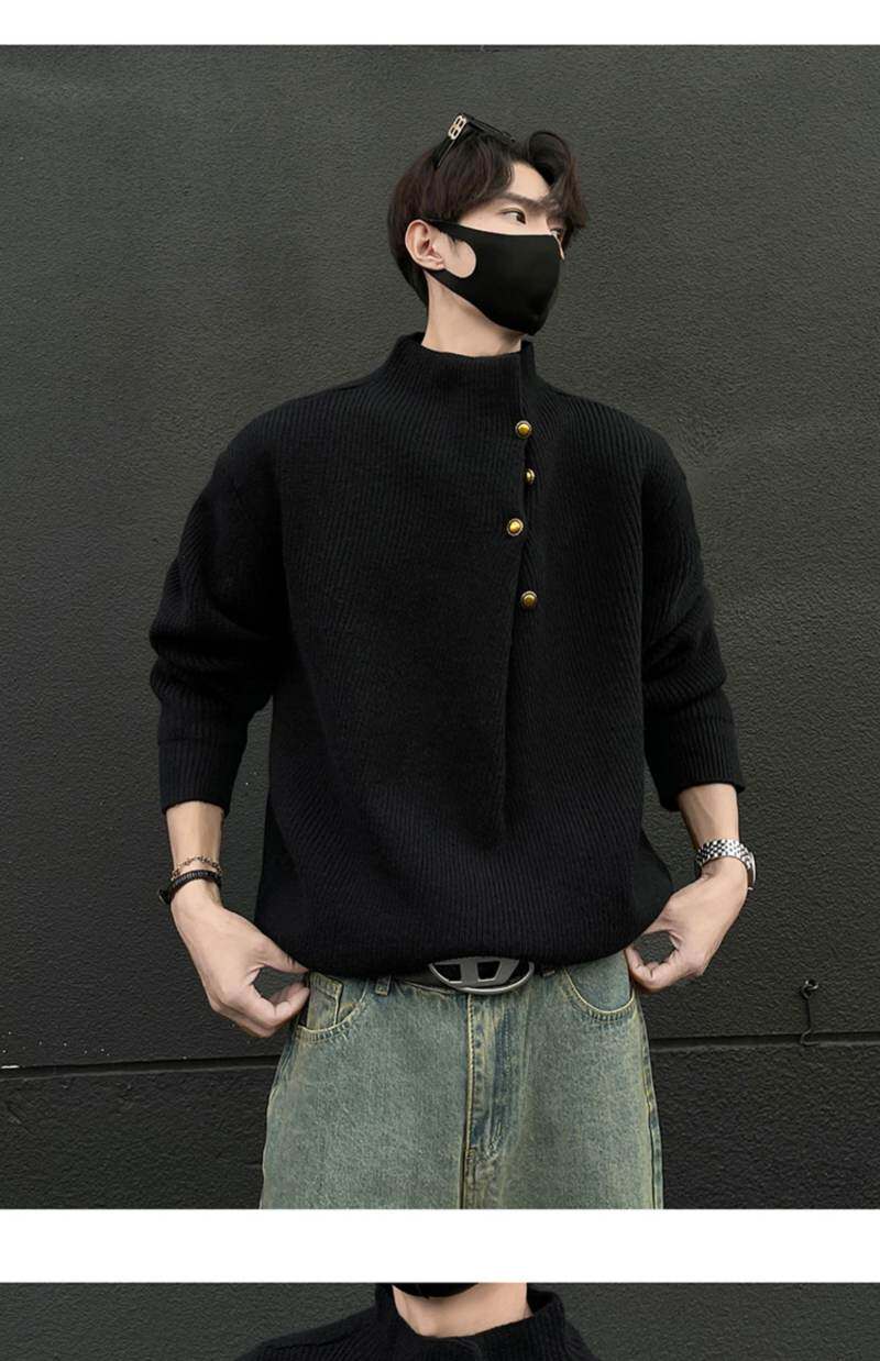 美式不規則紐釦半高領毛衣男冬季cleanfit休閒內搭針織衫寬松上衣