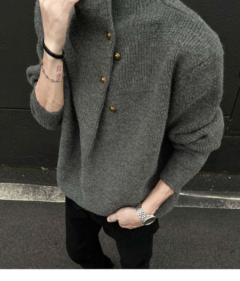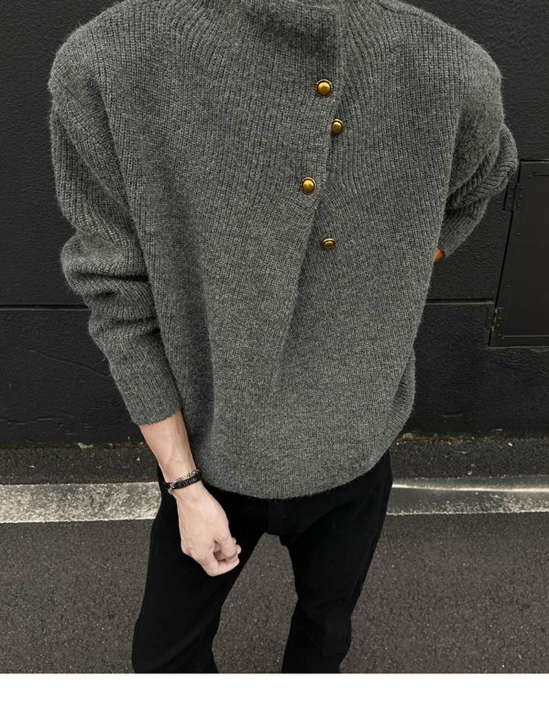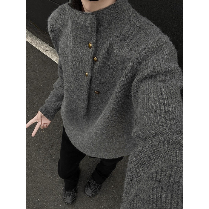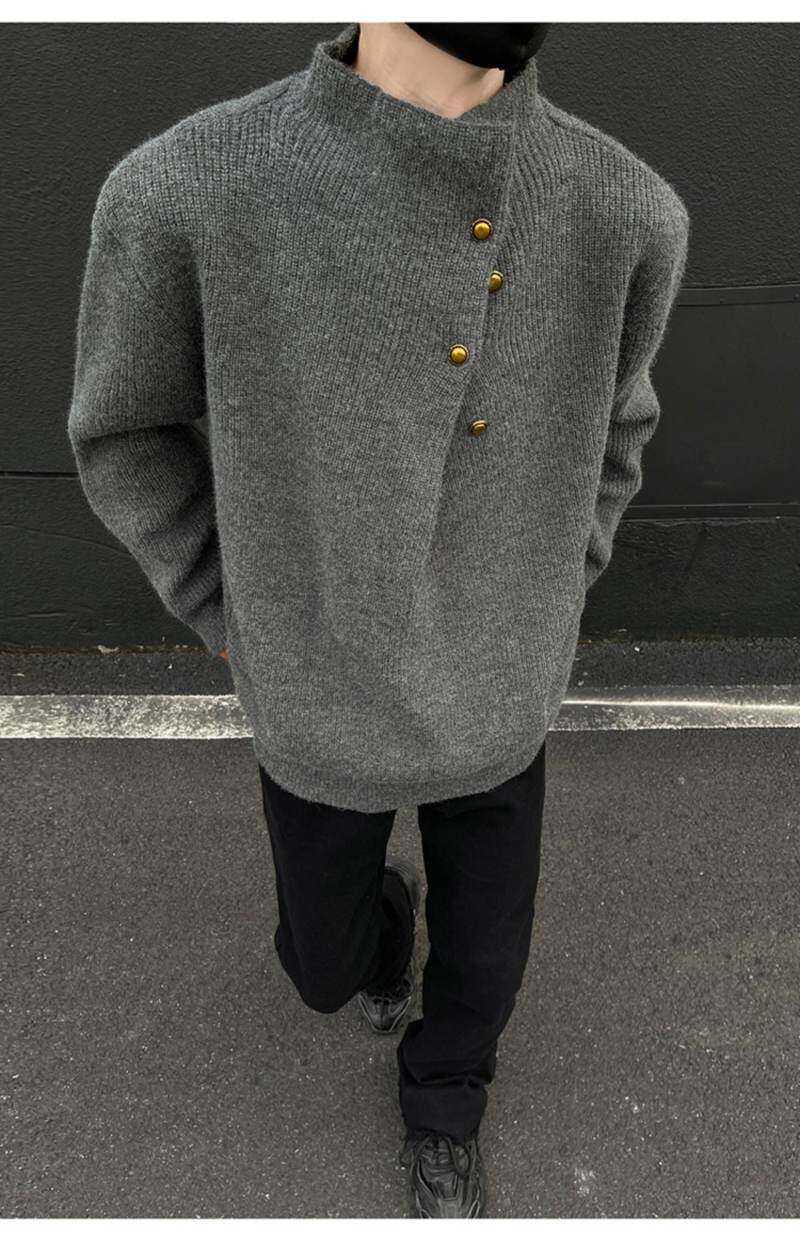 美式不規則紐釦半高領毛衣男冬季cleanfit休閒內搭針織衫寬松上衣