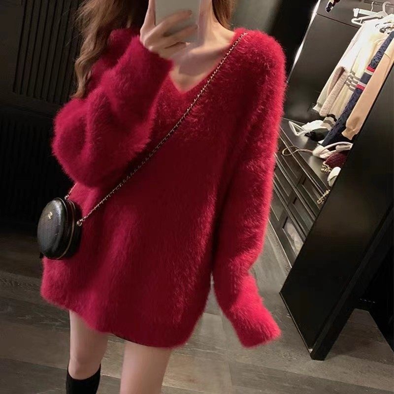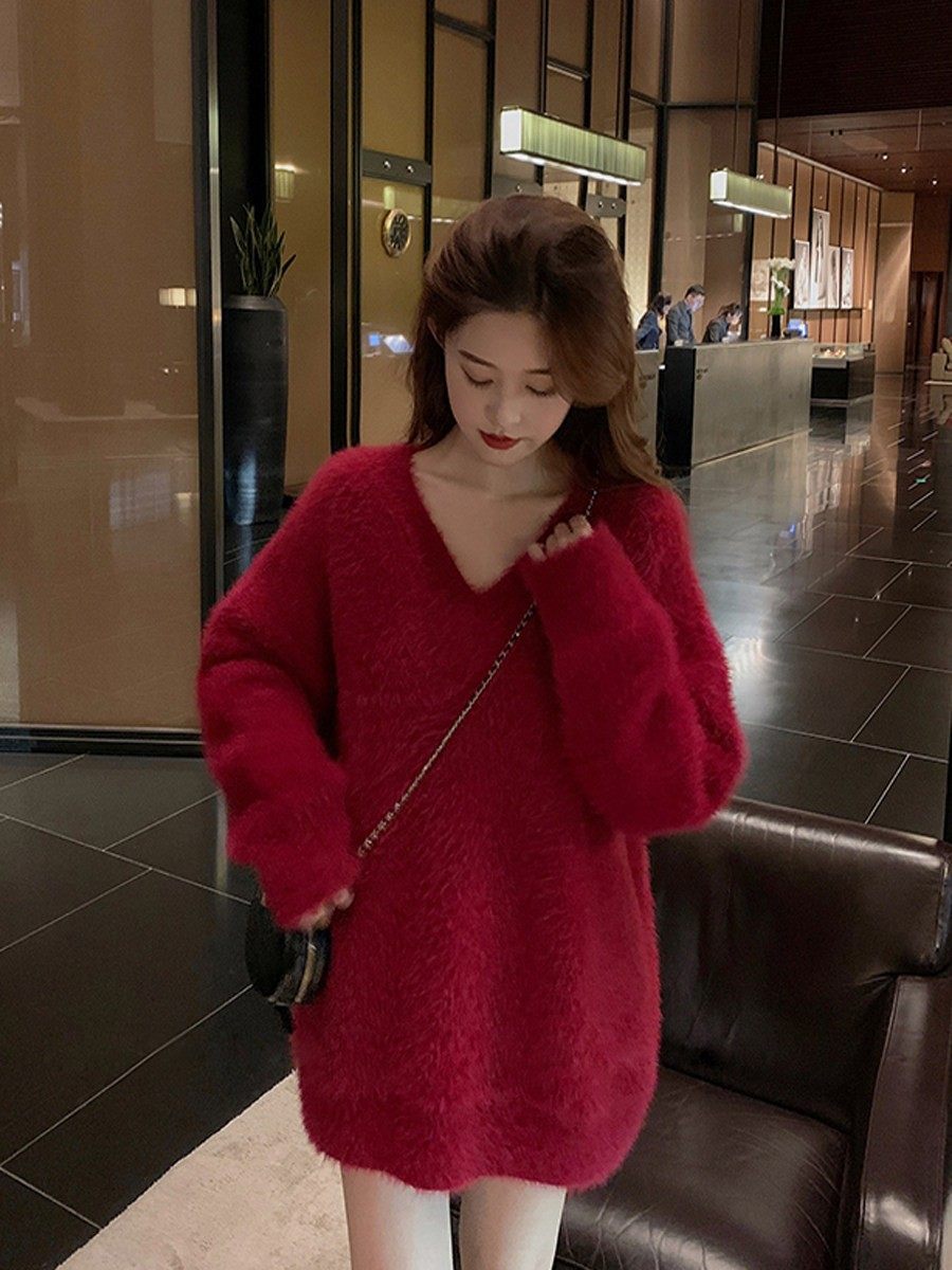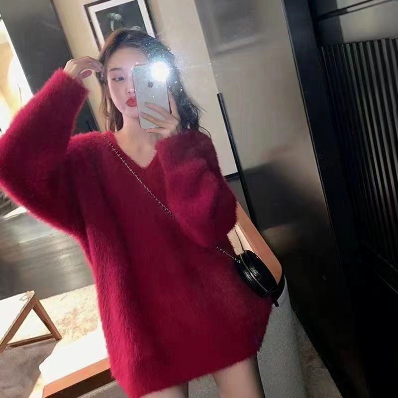 慵嬾風毛衣女中長款秋冬外穿白色水貂絨高級感內搭V領針織上衣潮