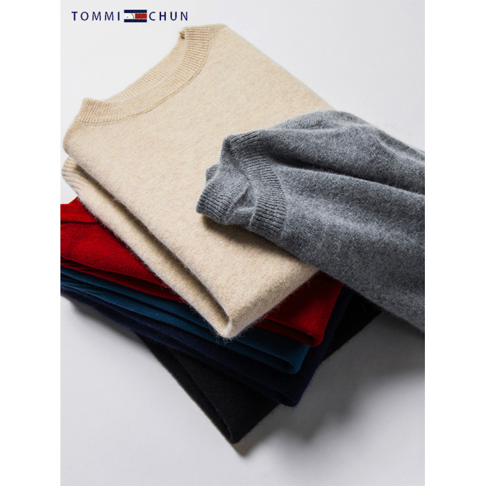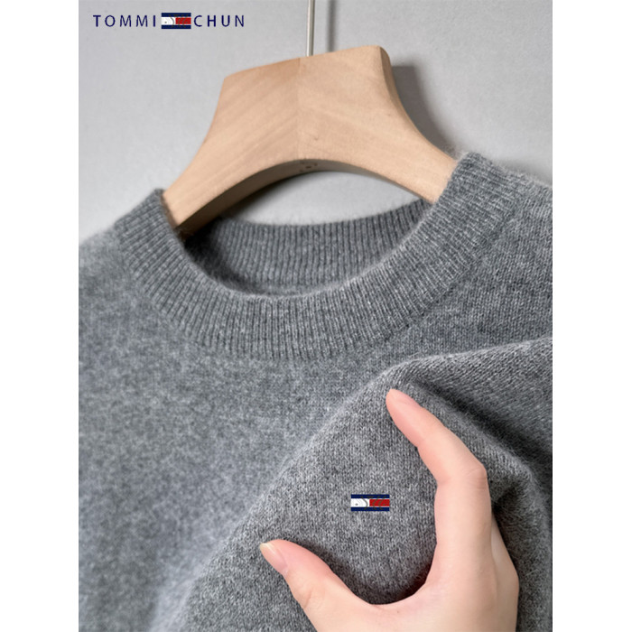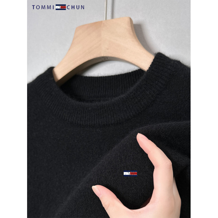 2025冬季湯米羊毛衫男士毛衣圓領加厚純色時尚休閒打底套頭針織衫