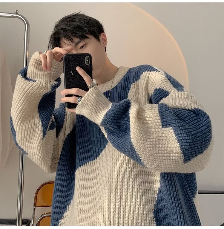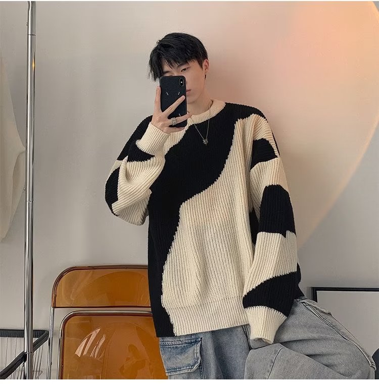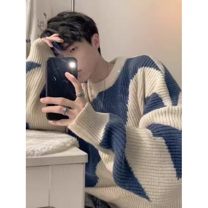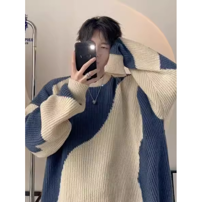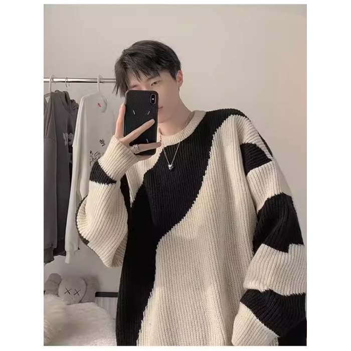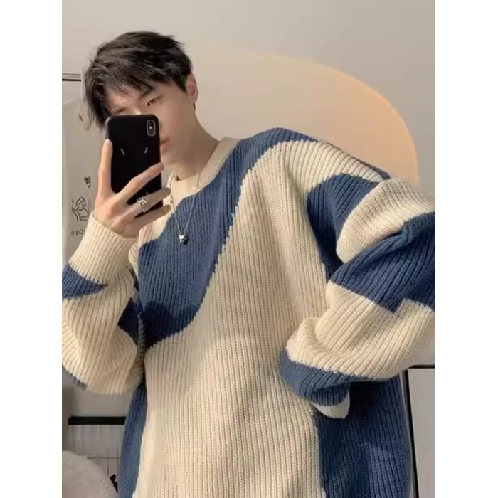 美式高街條紋撞色毛衣男冬季潮牌慵懶風寬松高級感痞帥內搭針織衫