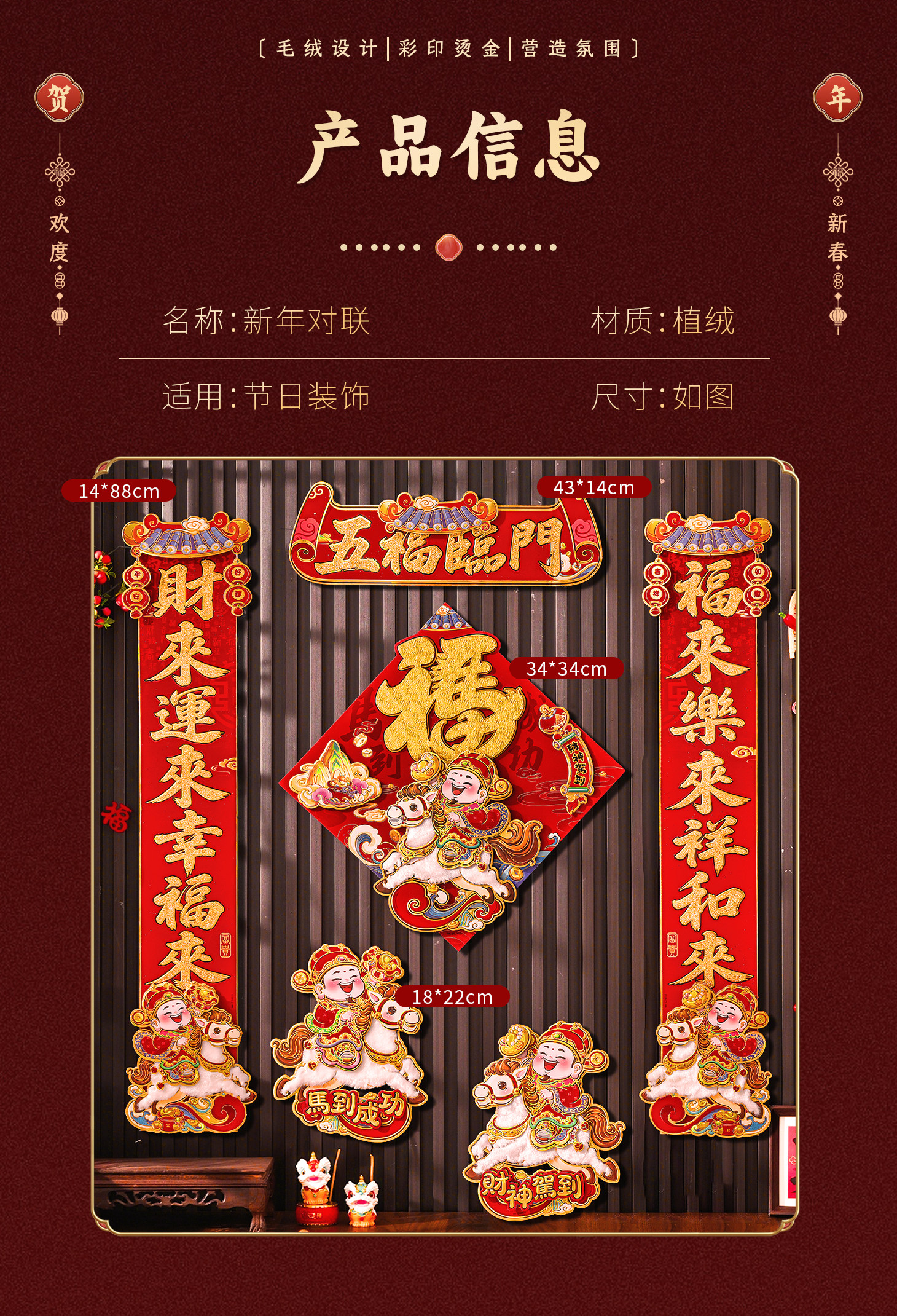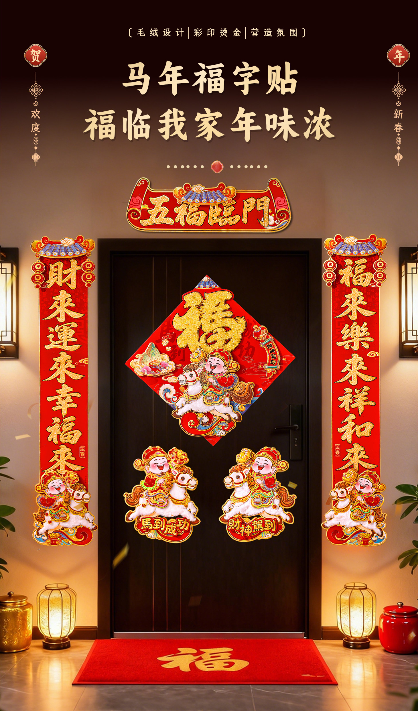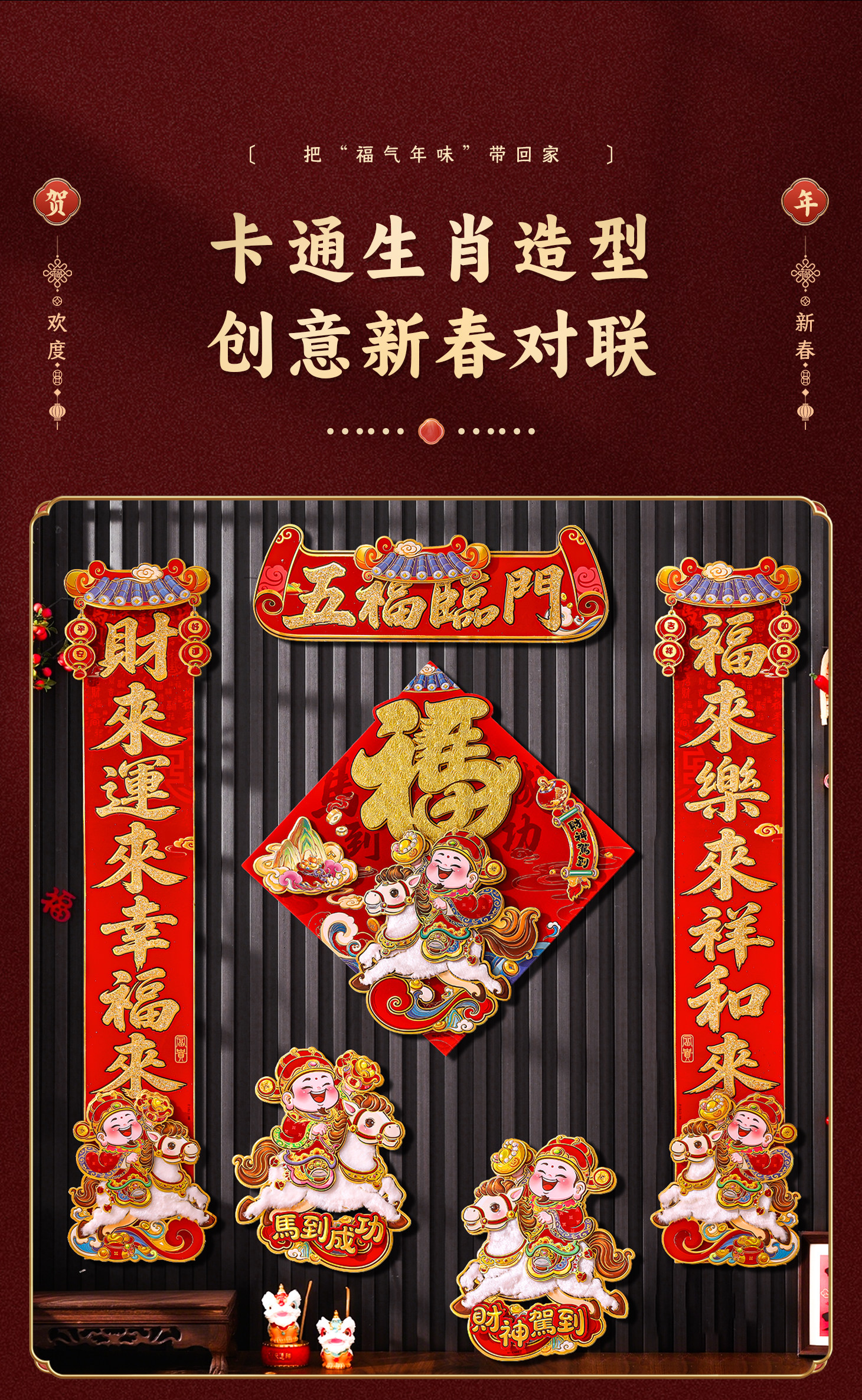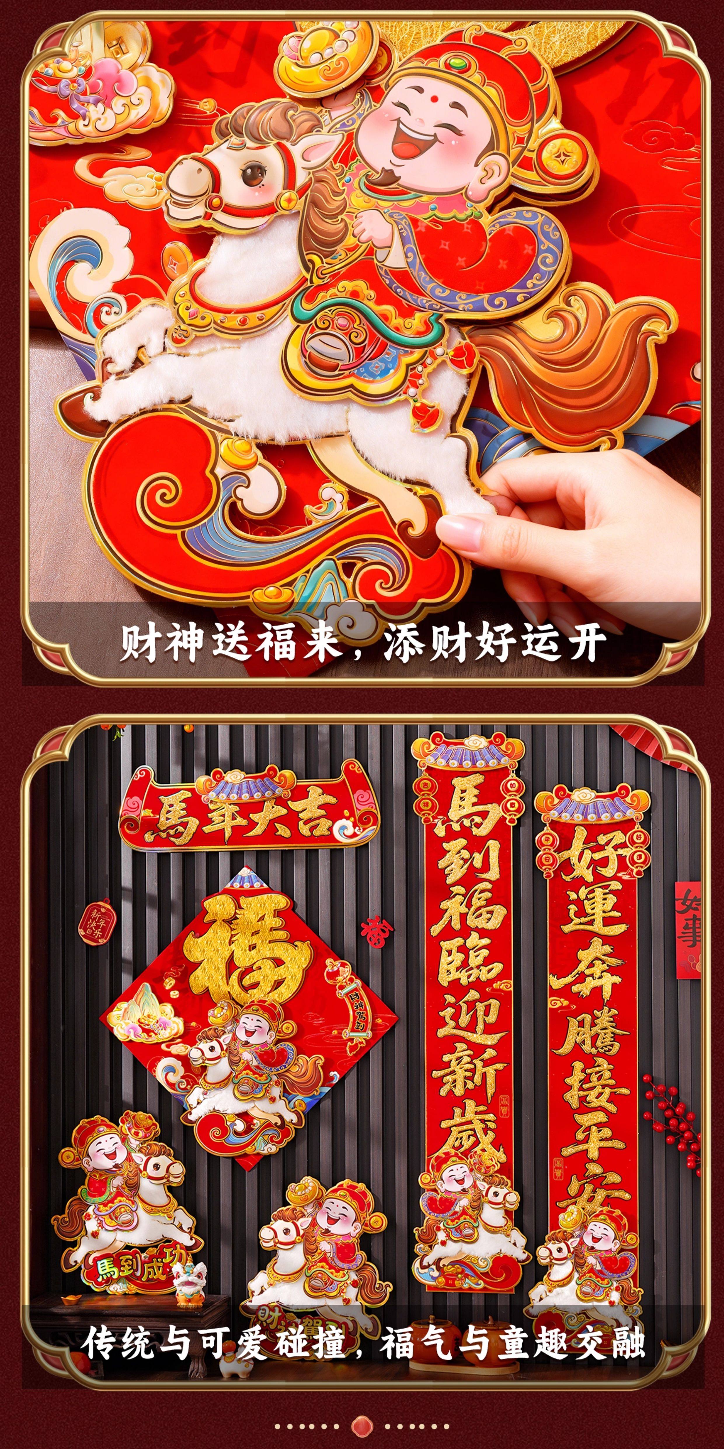 對聯2026馬年植絨春聯過年卡通福字立體毛絨馬上發財家用門貼布置
