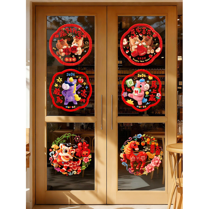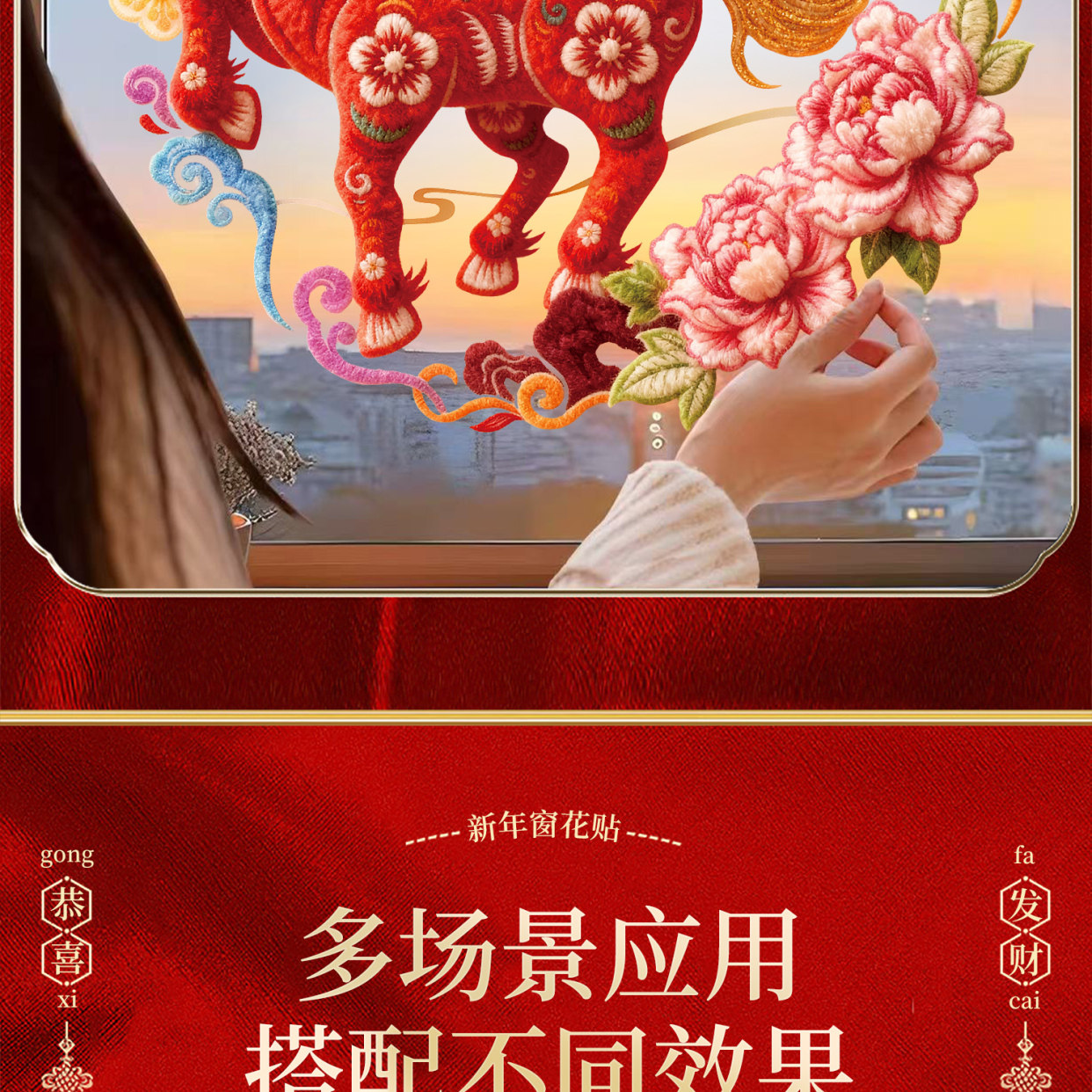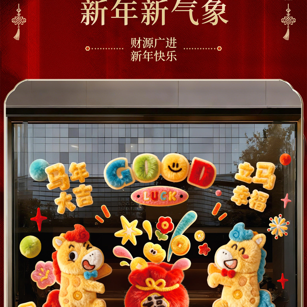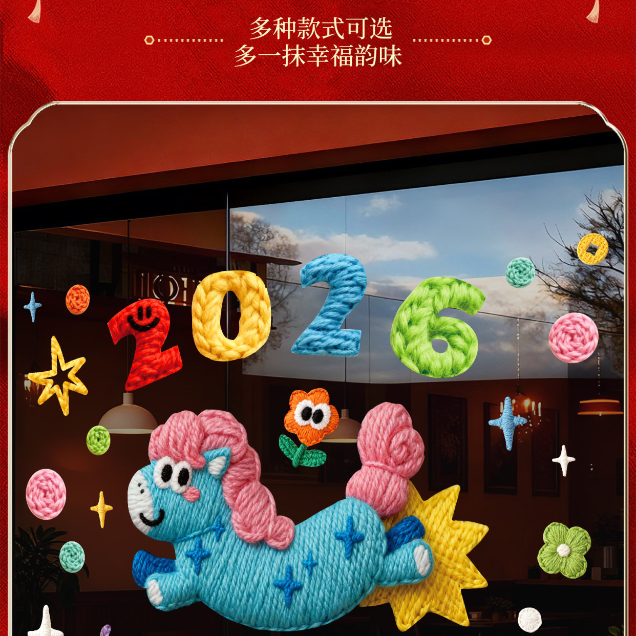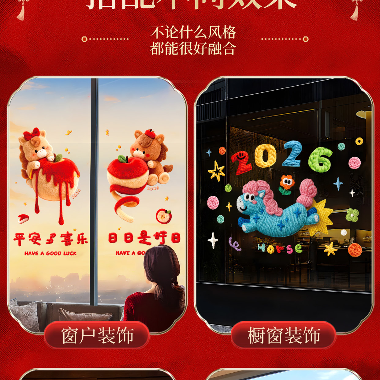 2026新款馬年窗花玻璃門貼紙春節過年櫥窗靜電貼新年場景裝飾