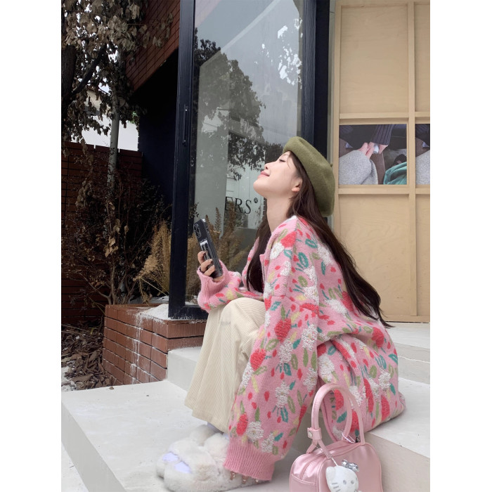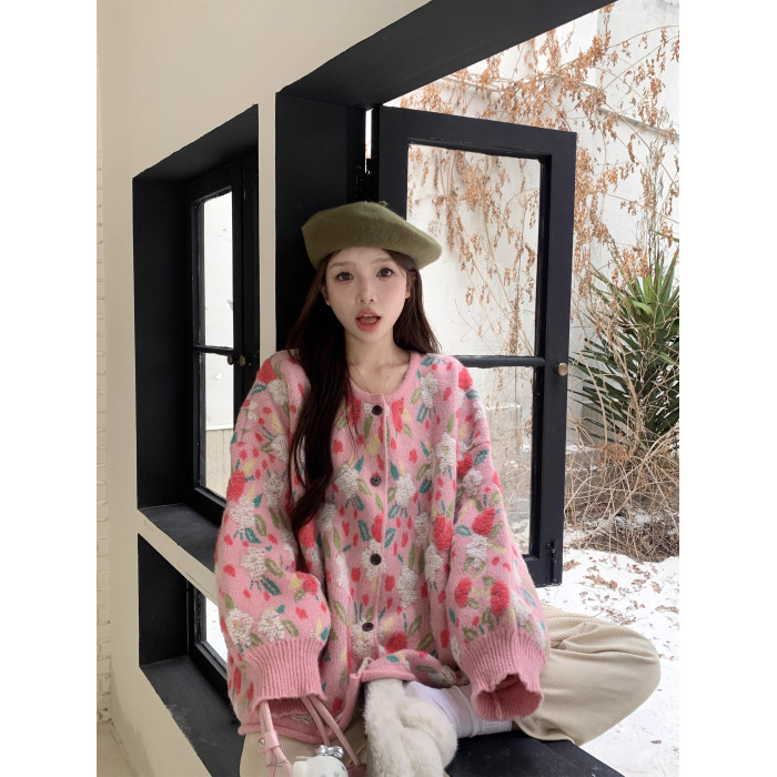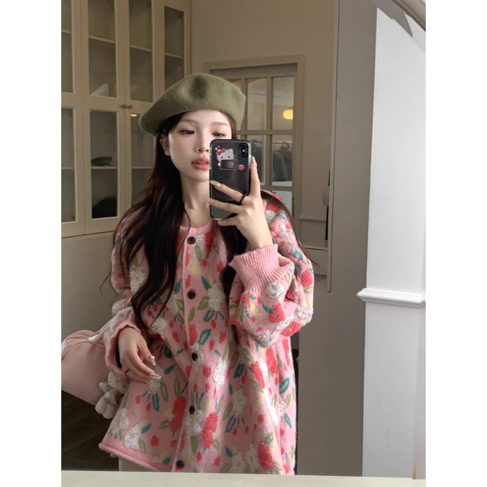 粉色絨花朵毛衣外套女裝秋季長袖針織開衫復古慵嬾風寬鬆上衣外搭