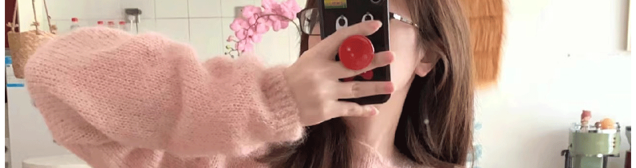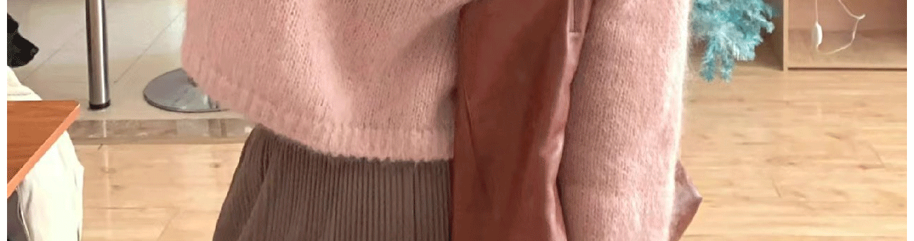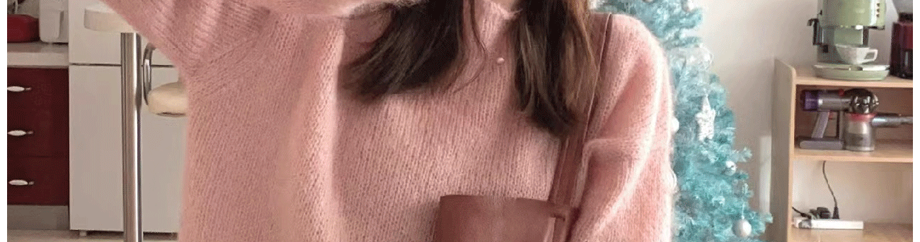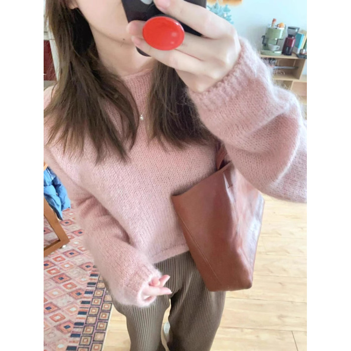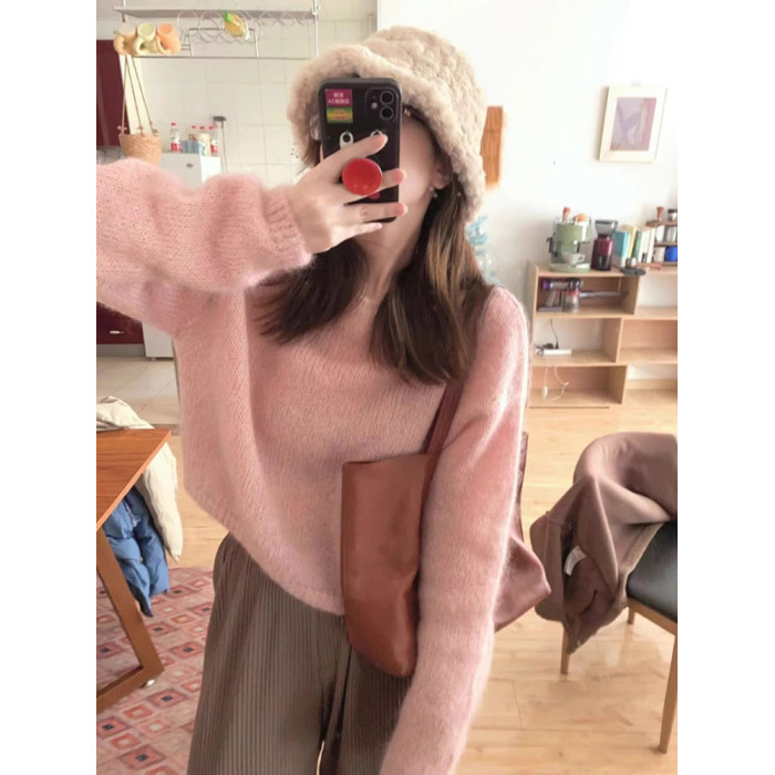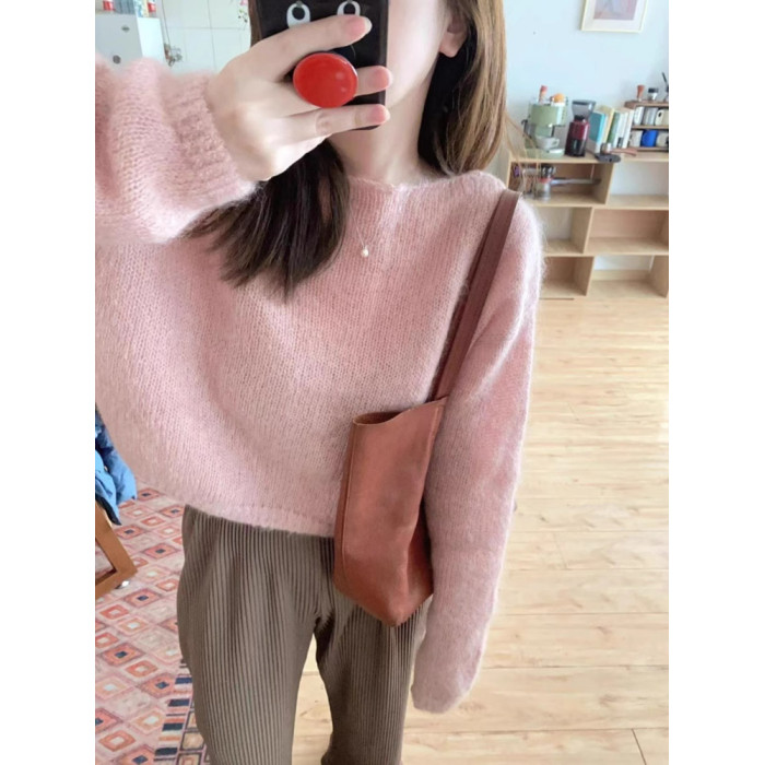 溫柔氛圍感粉色馬海毛針織衫女秋冬嬭fufu慵嬾風寬鬆毛衣短款上衣