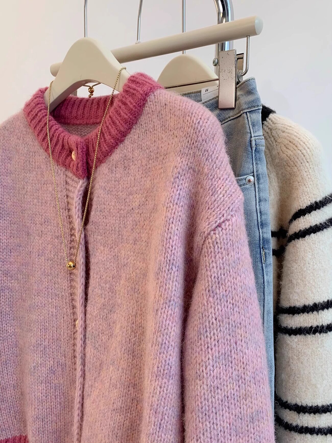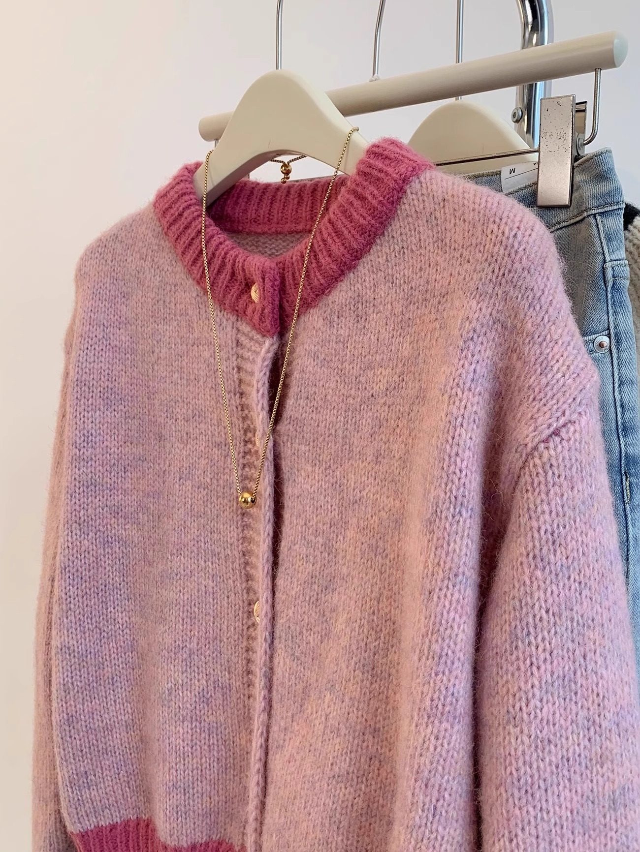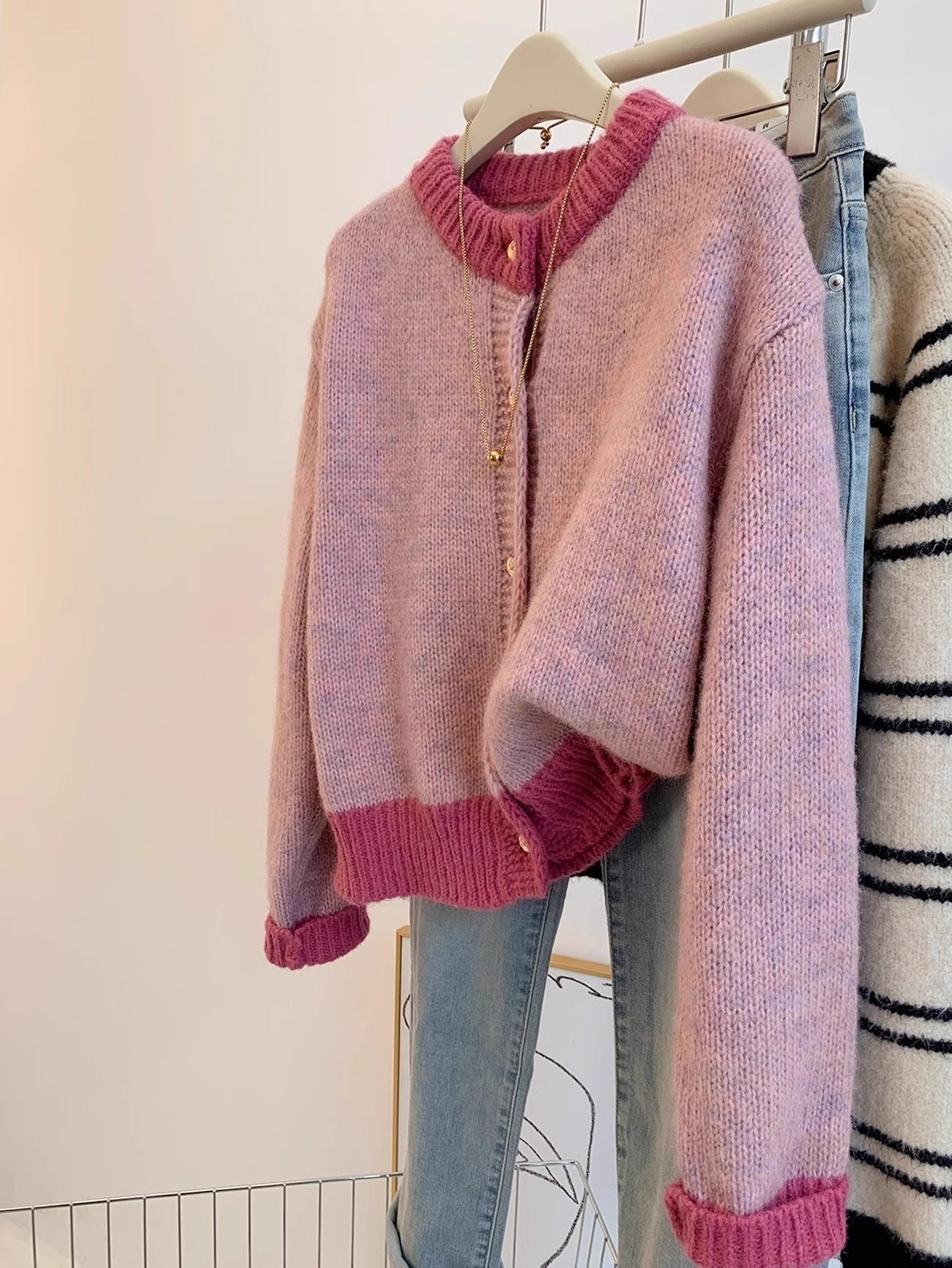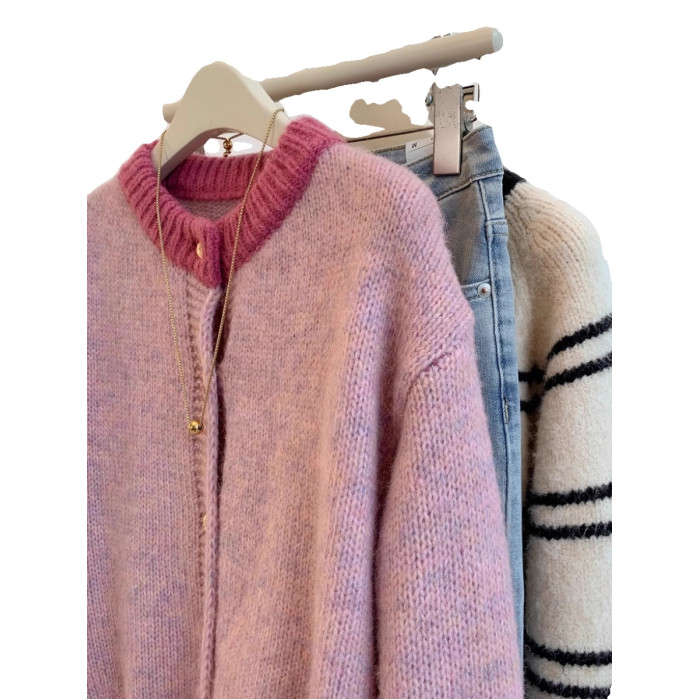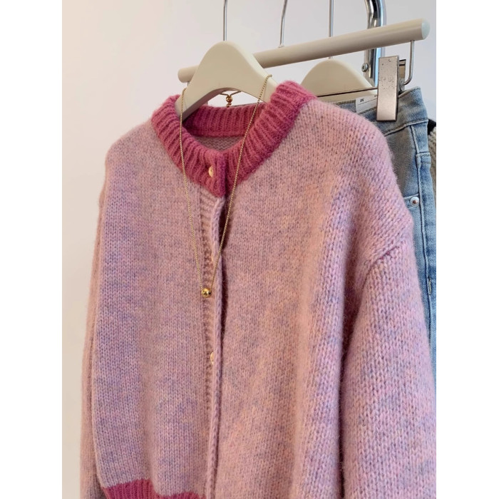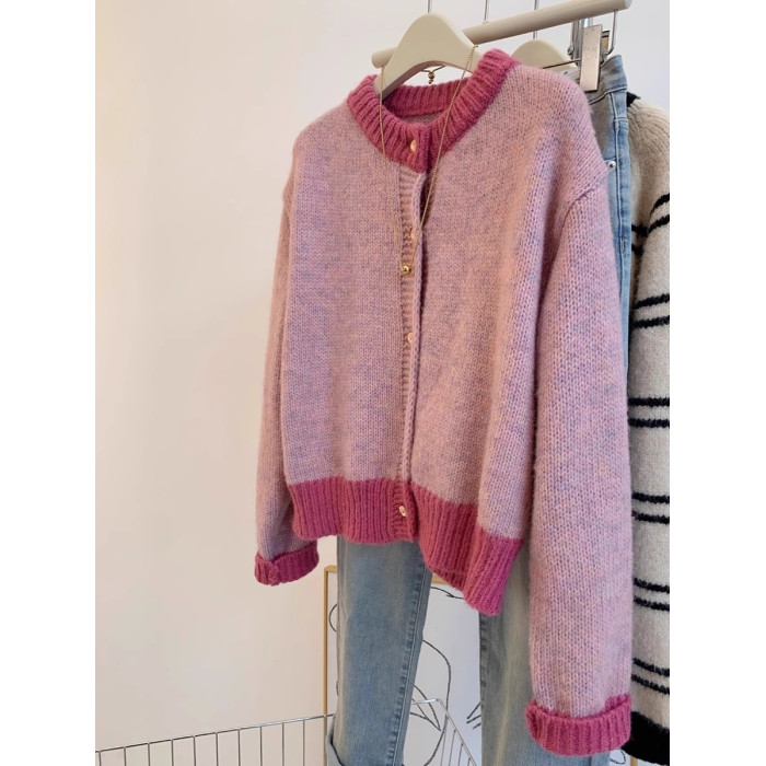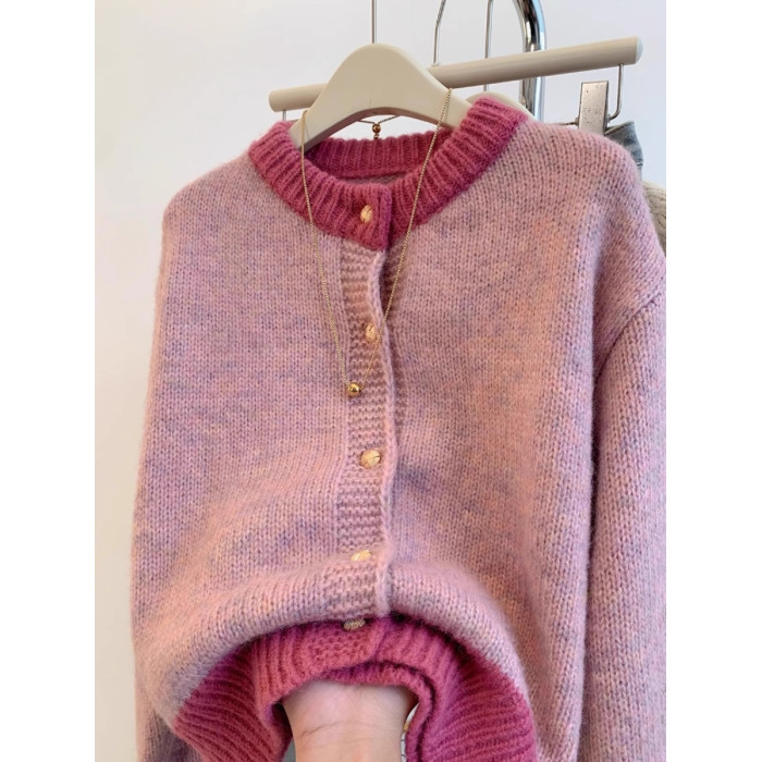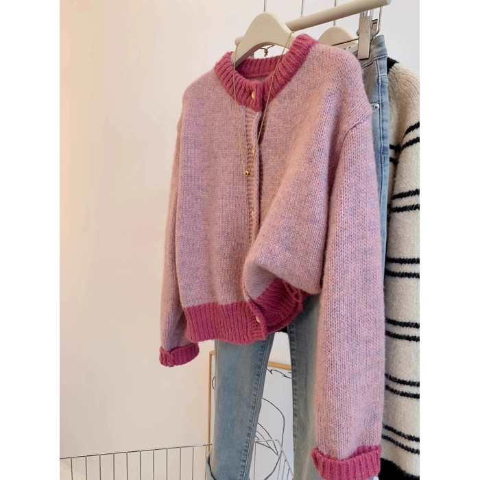 小香風粉色短款毛衣外套女秋冬春裝加厚慵嬾風小個子針織開衫上衣