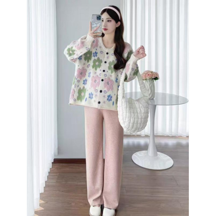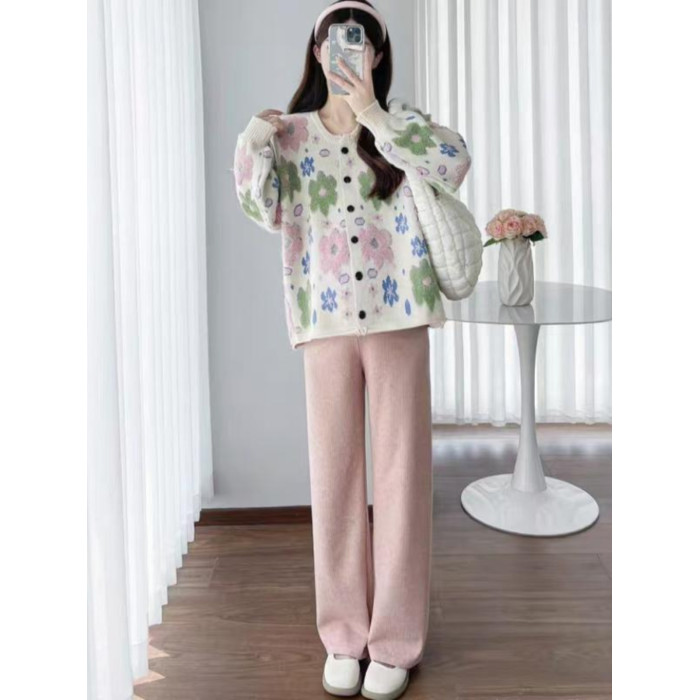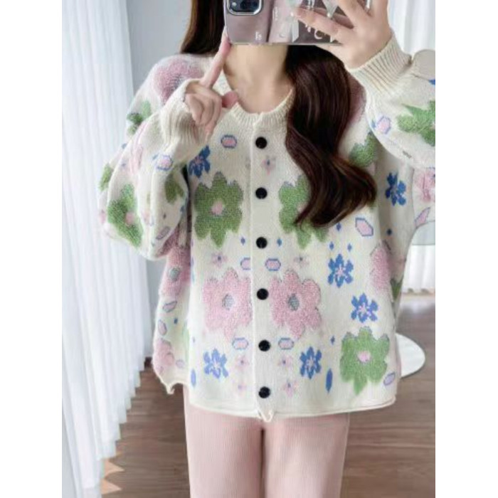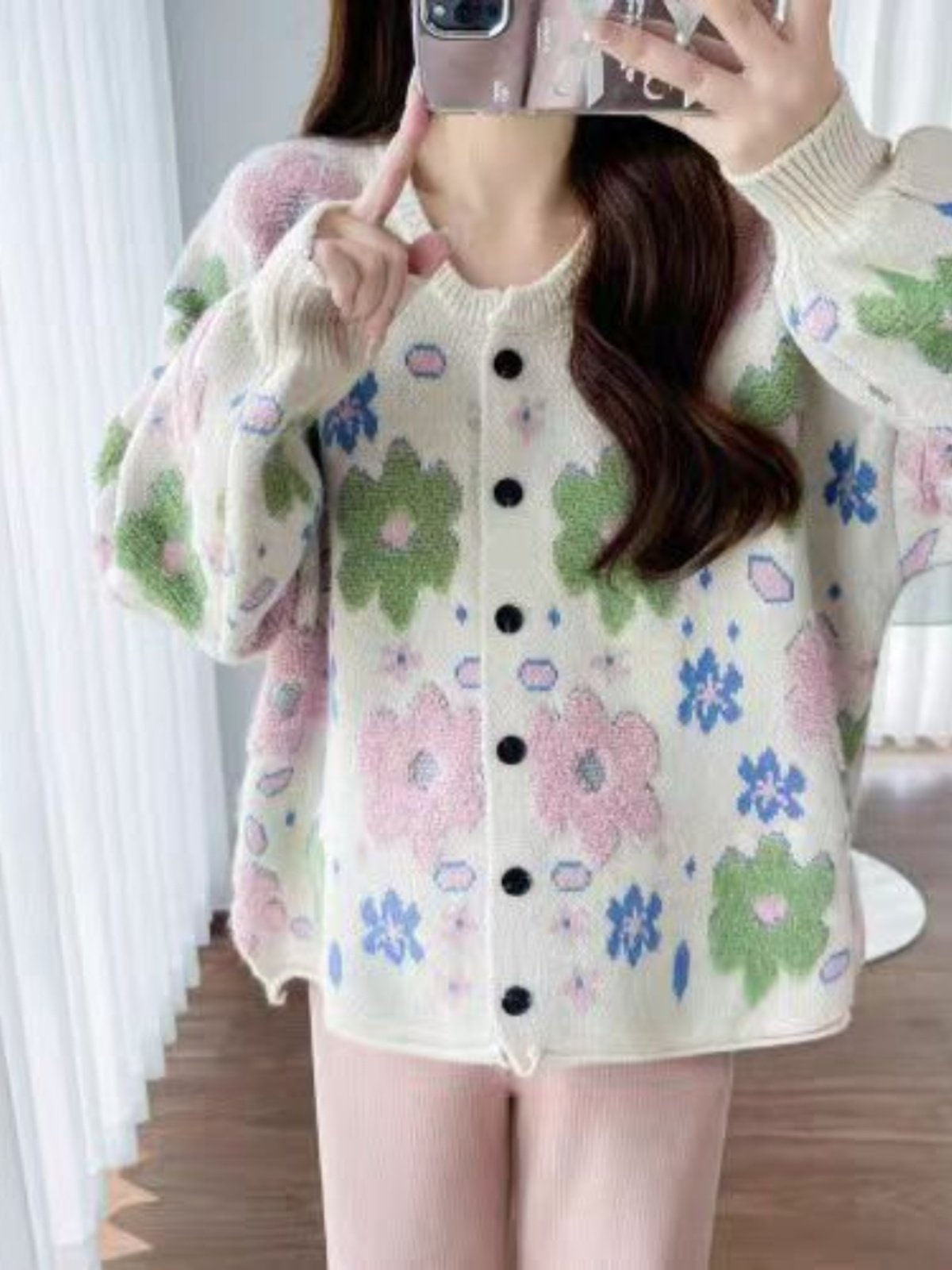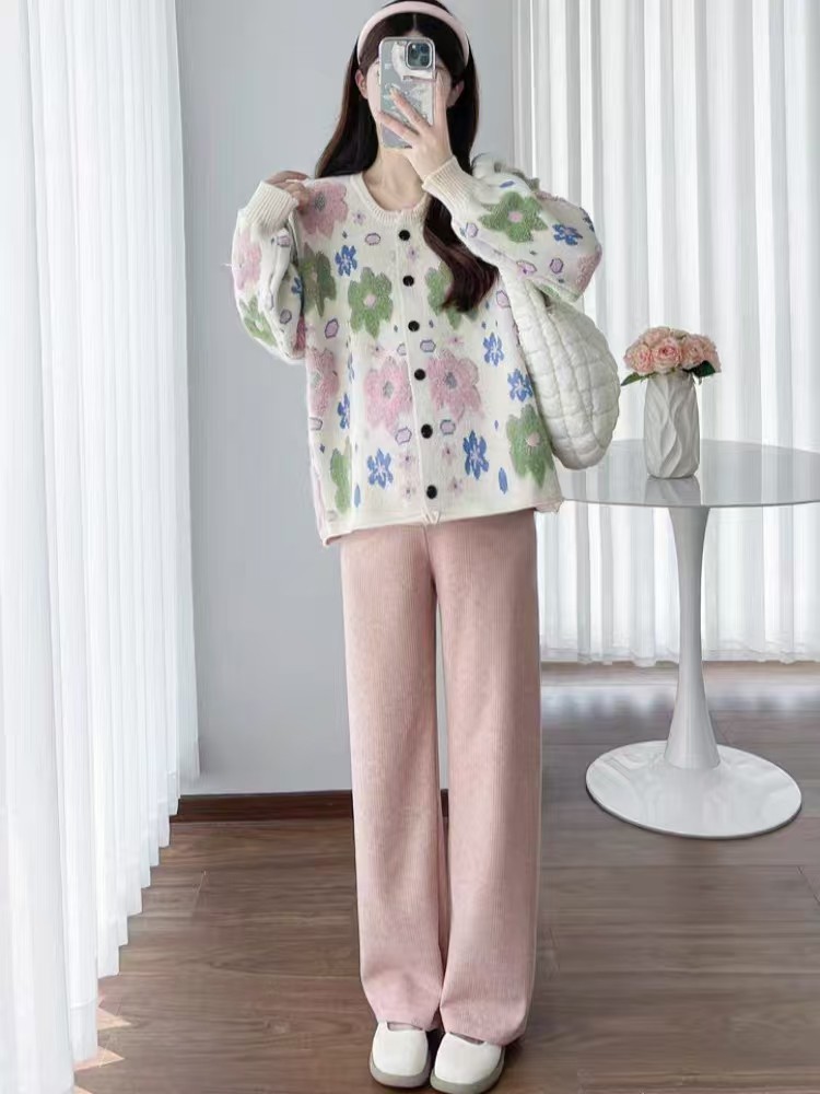 植絨花朵粉色毛衣開衫女春秋小個子寬鬆慵嬾風設計感軟糯針織外套
