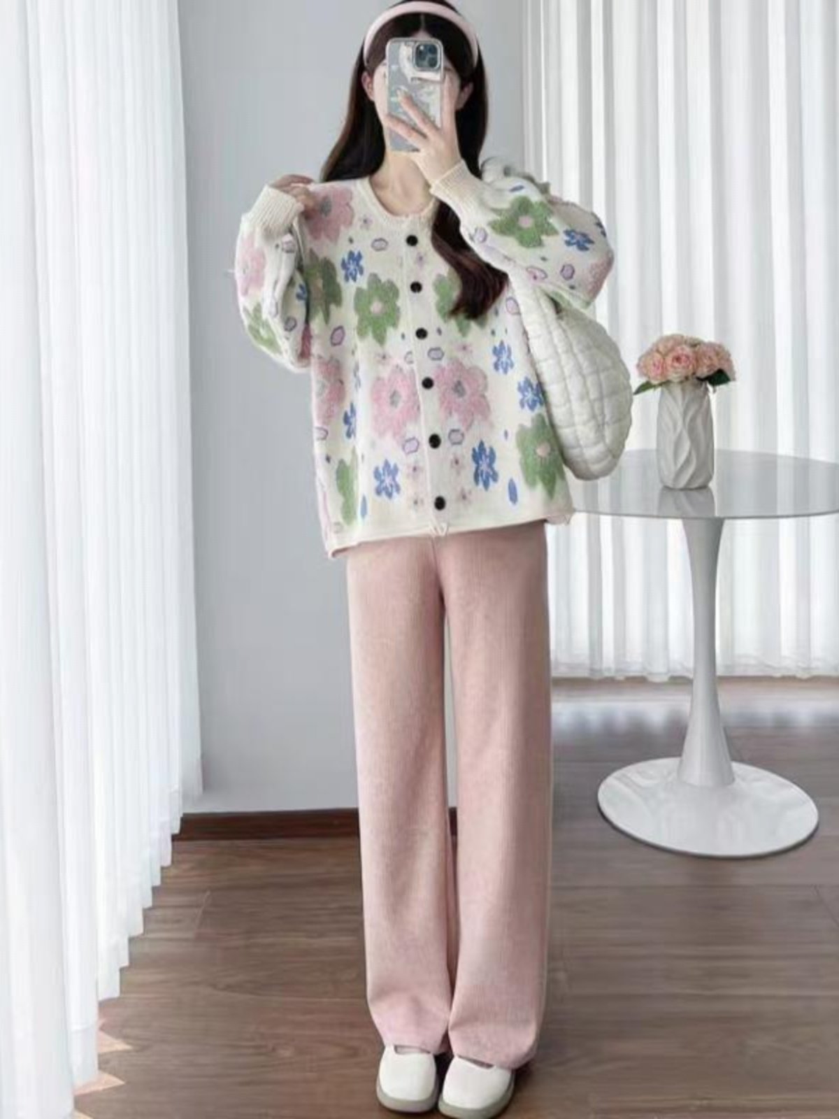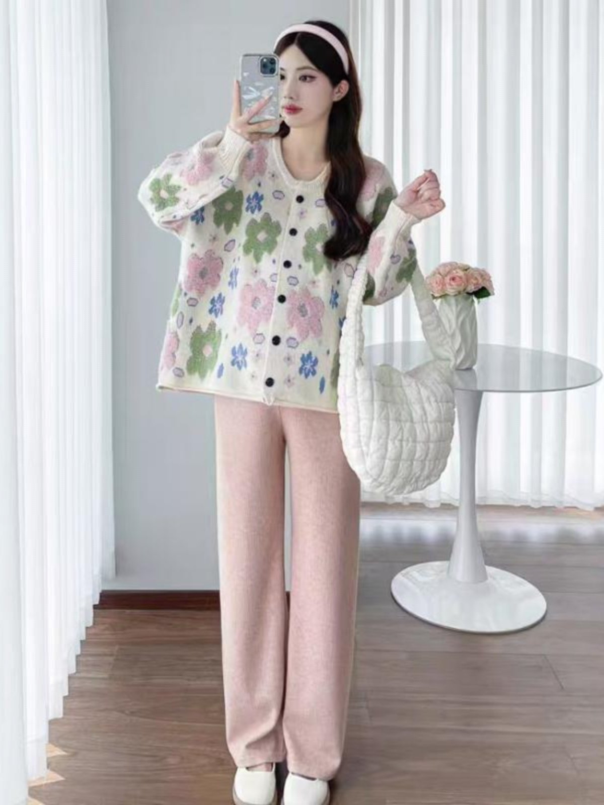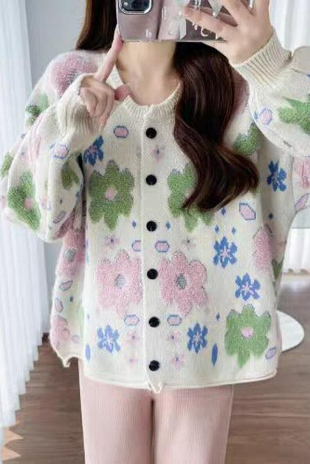 植絨花朵粉色毛衣開衫女春秋小個子寬鬆慵嬾風設計感軟糯針織外套