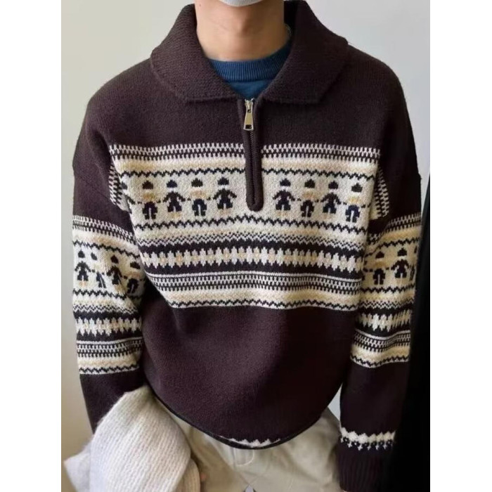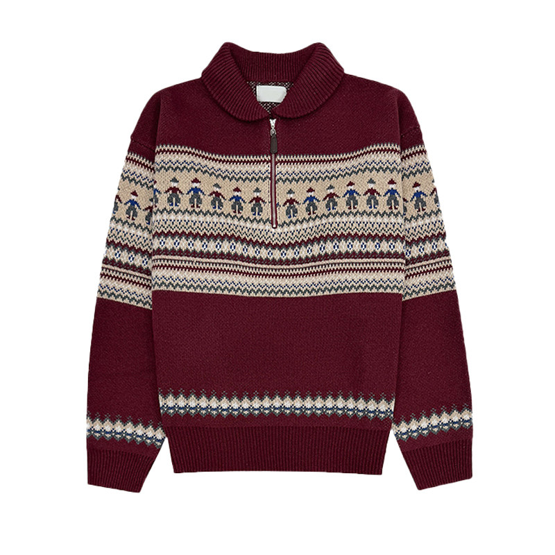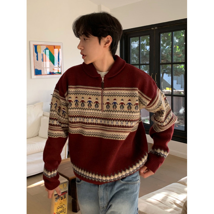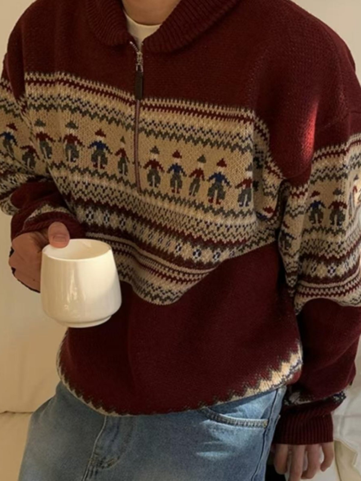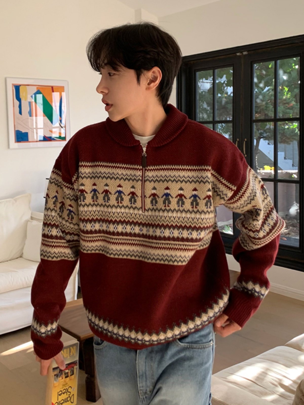 美式復古費爾島半拉鍊繙領毛衣男女寬鬆聖誕新年紅色針織開衫外套