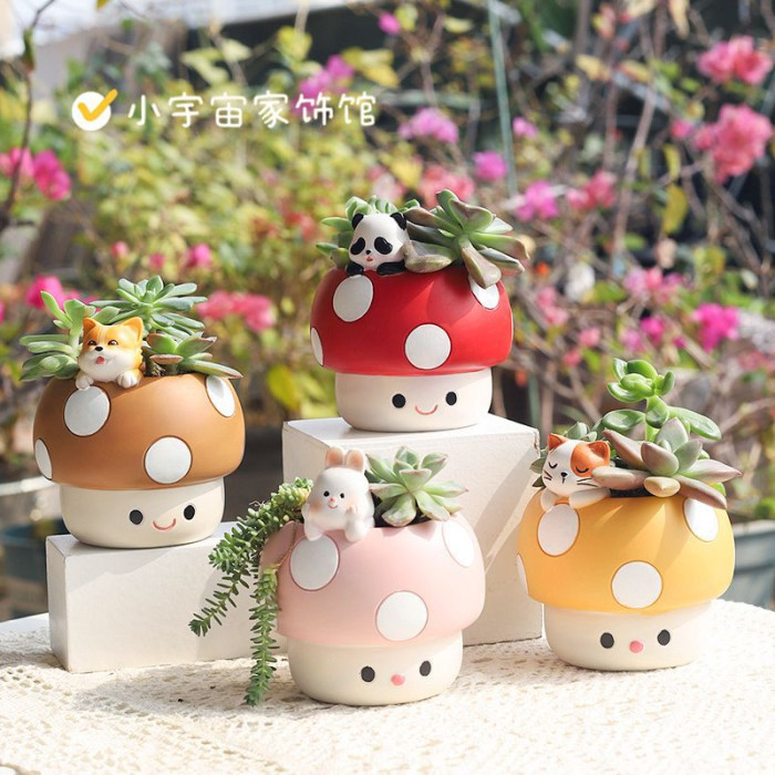 卡通蘑菇小兔柯基趣味園藝樹脂花盆創意工位桌面多肉盆栽裝飾花盆