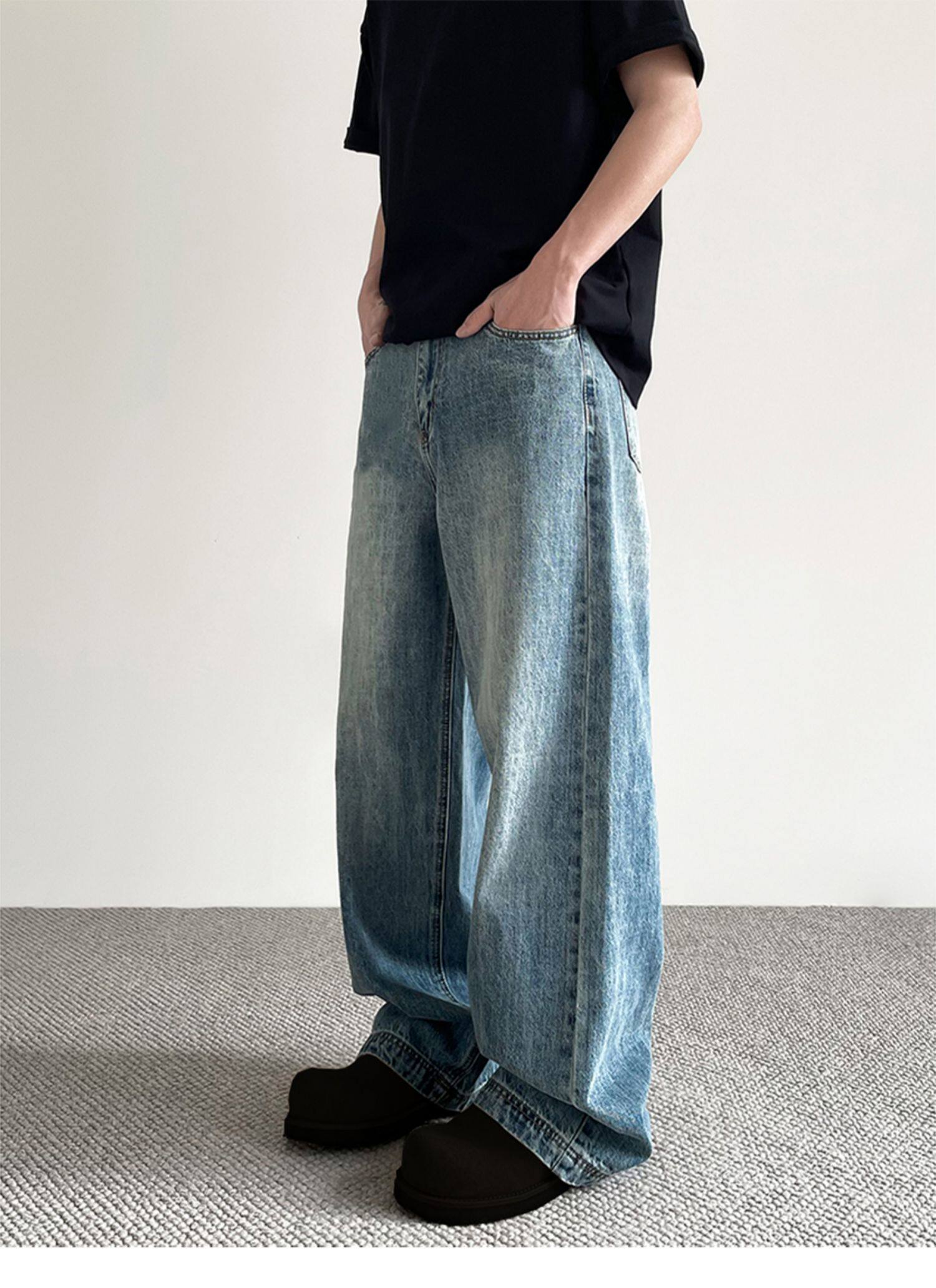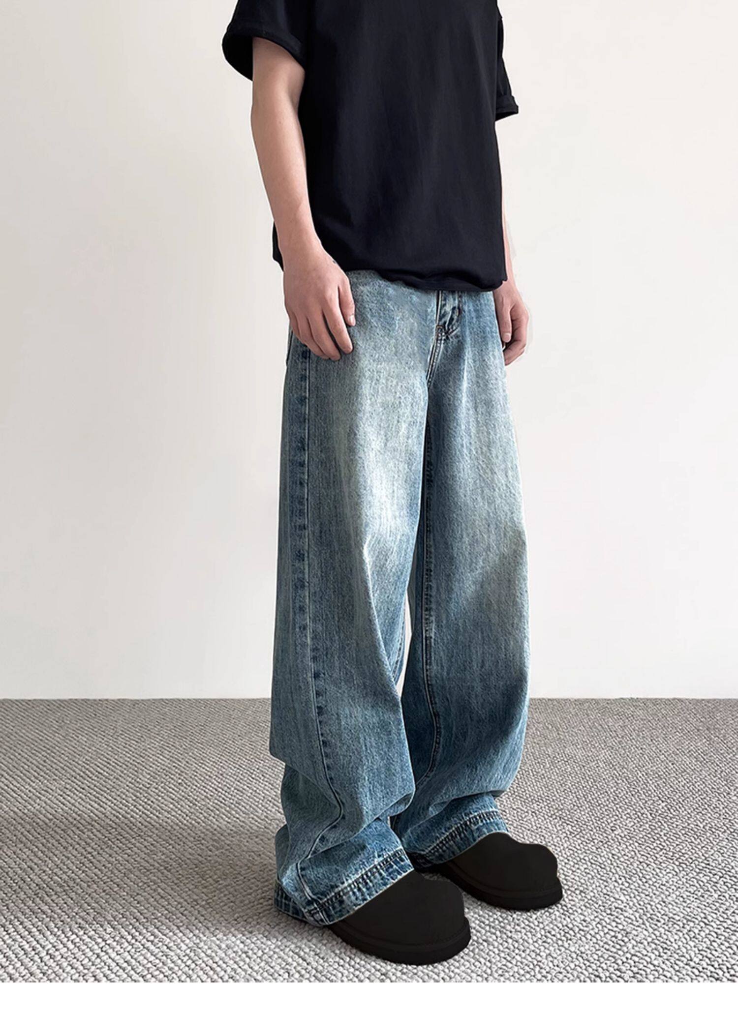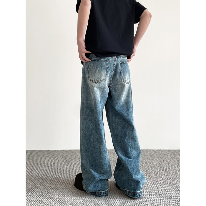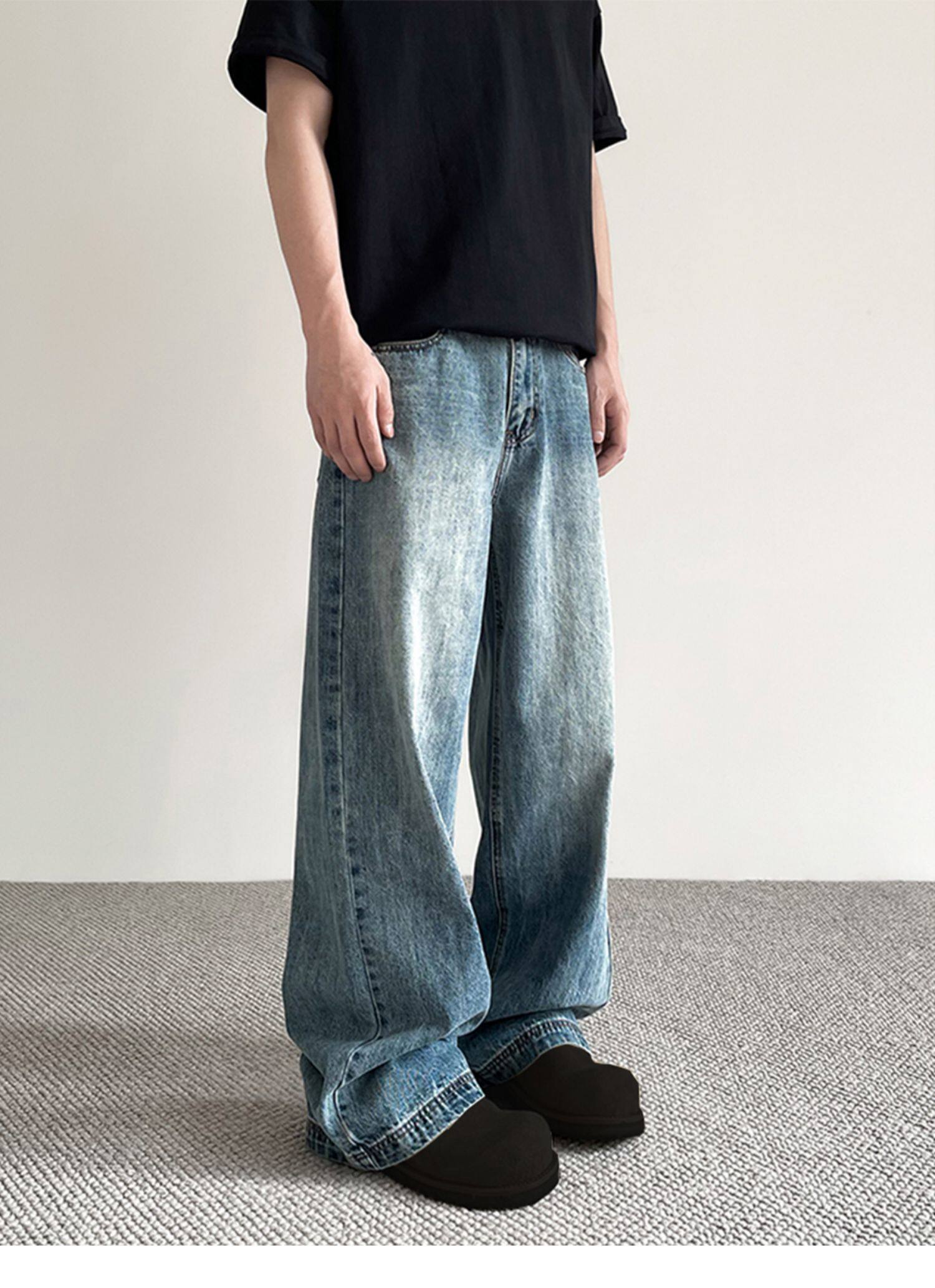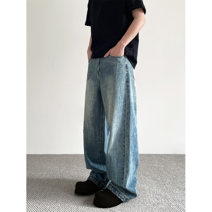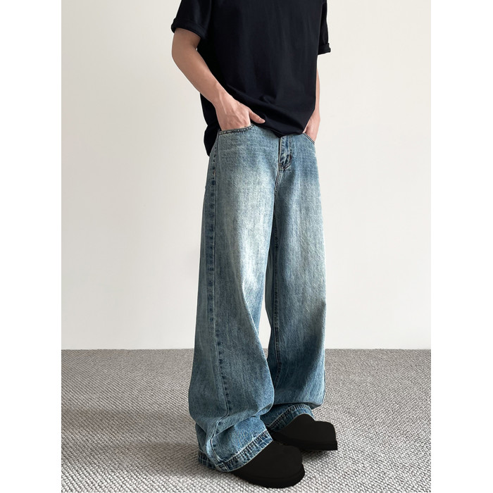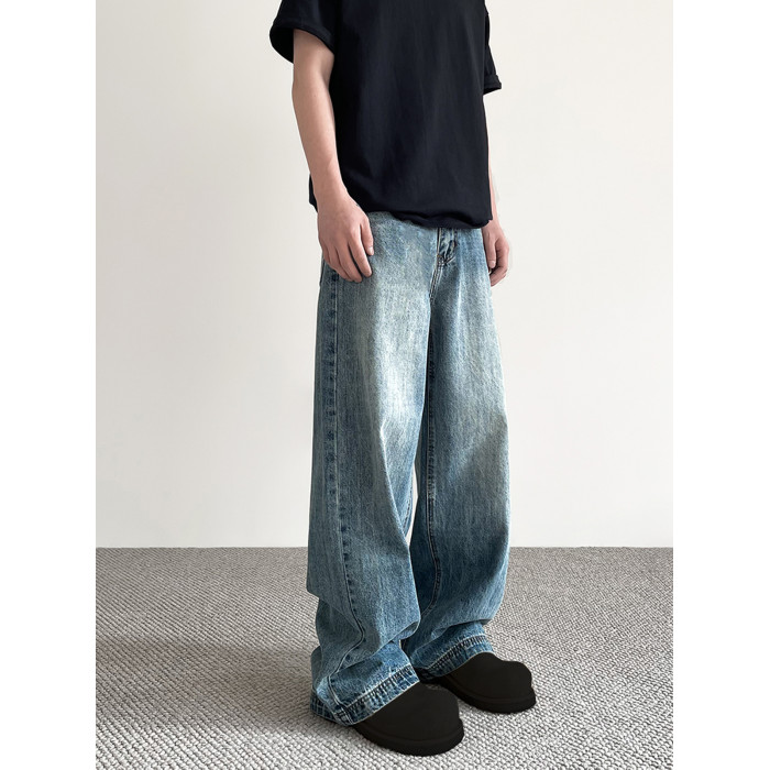 美式cleanfit做舊藍色牛仔褲男女潮牌高街寬鬆直筒百搭濶腿長褲子