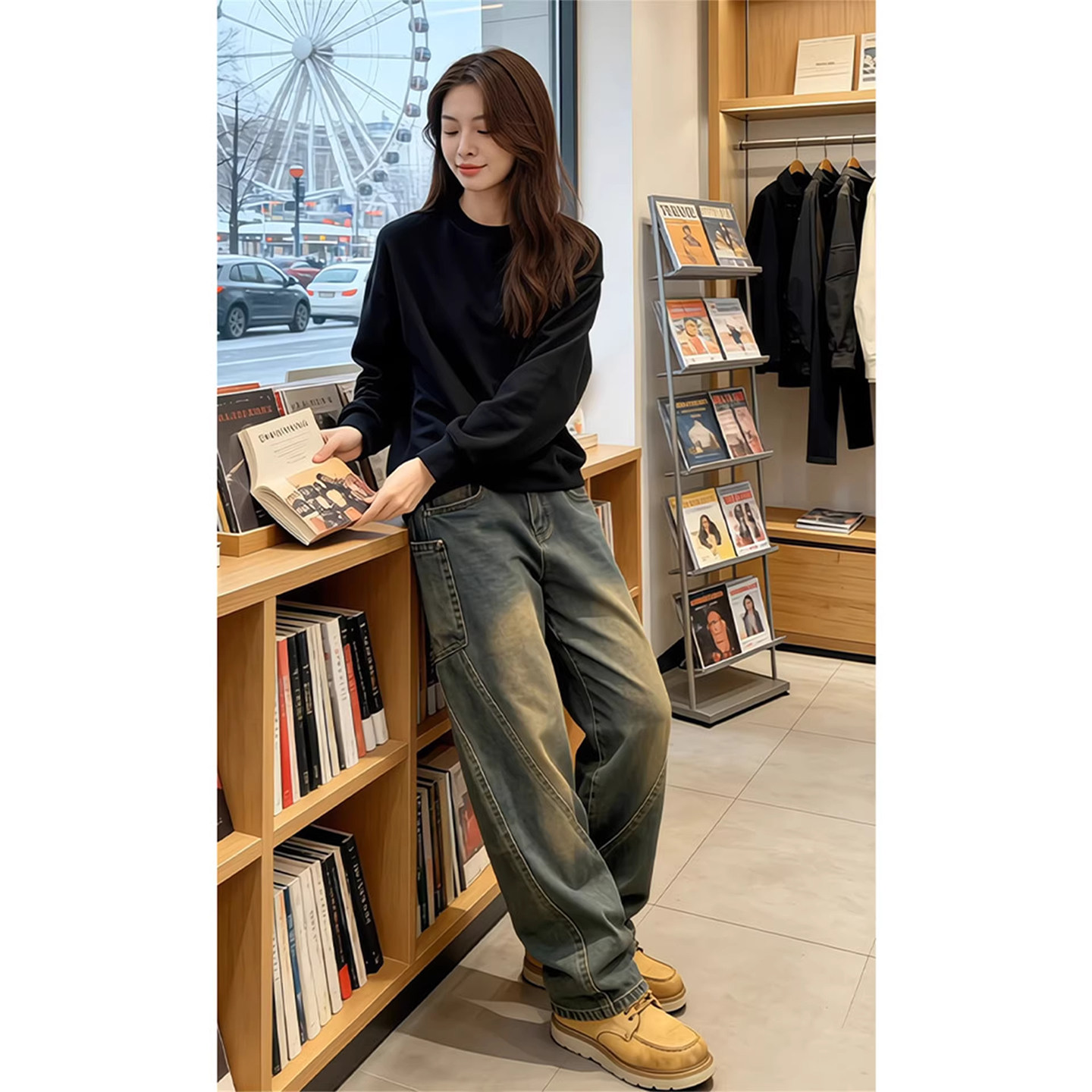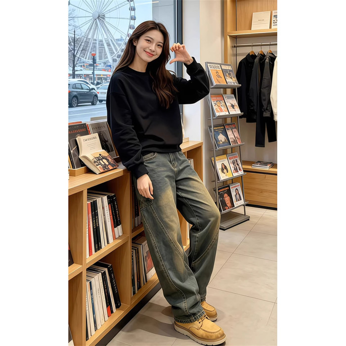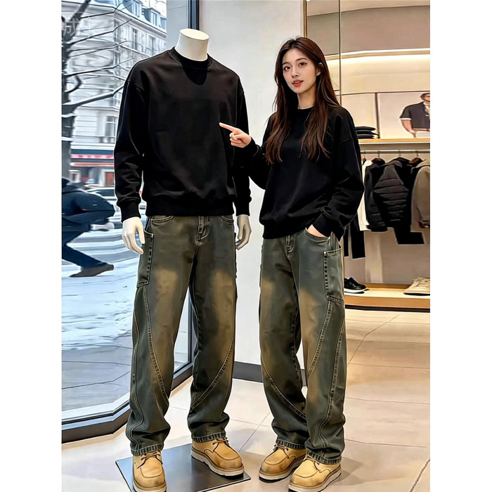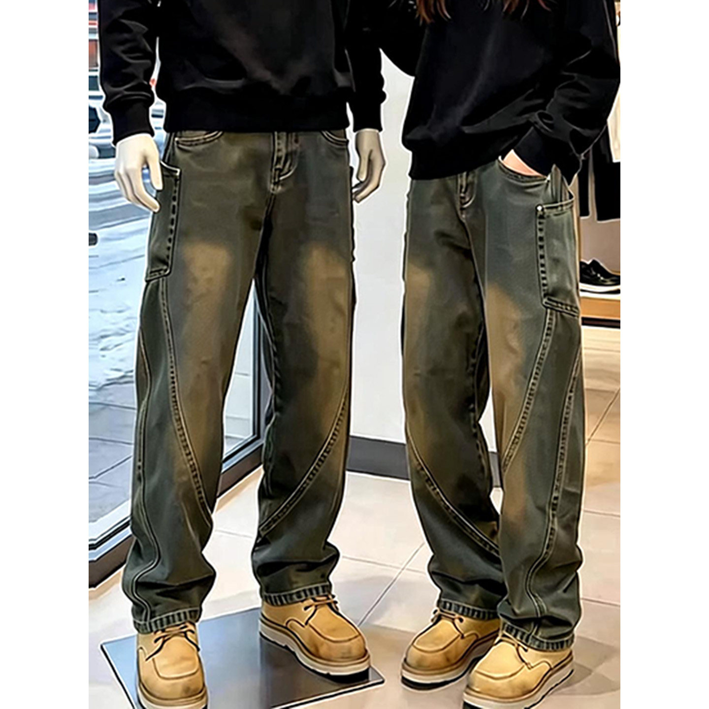 泥黃色彎刀牛仔褲男款秋冬水洗做舊工裝褲子cleanfit直筒微喇褲
