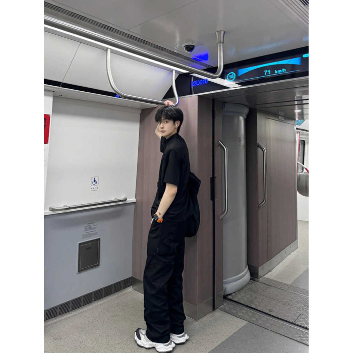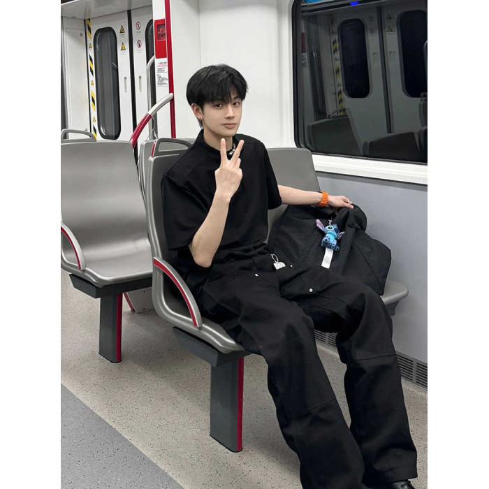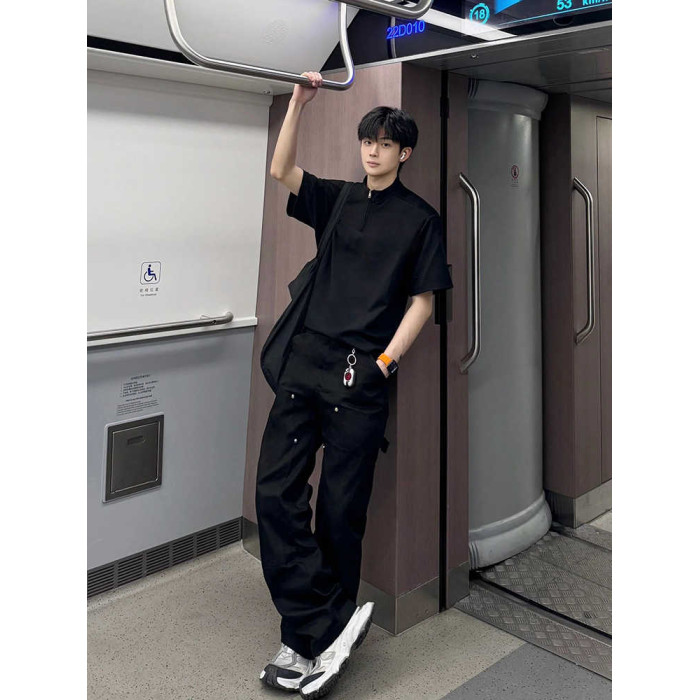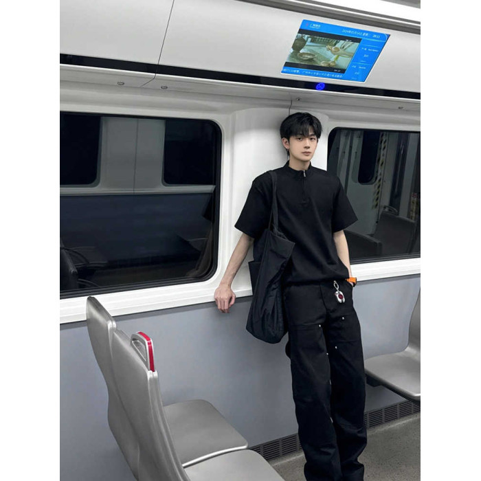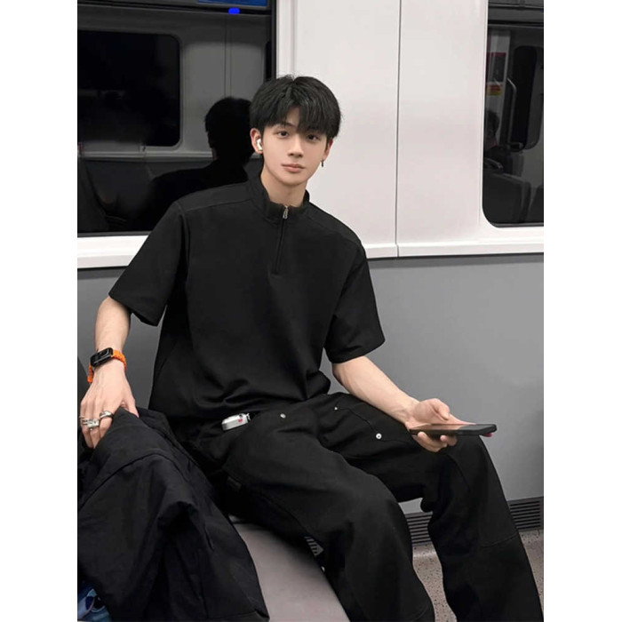 黑色半拉鍊短袖男夏季新款美式潮牌男式t恤重磅痞帥五分袖上衣