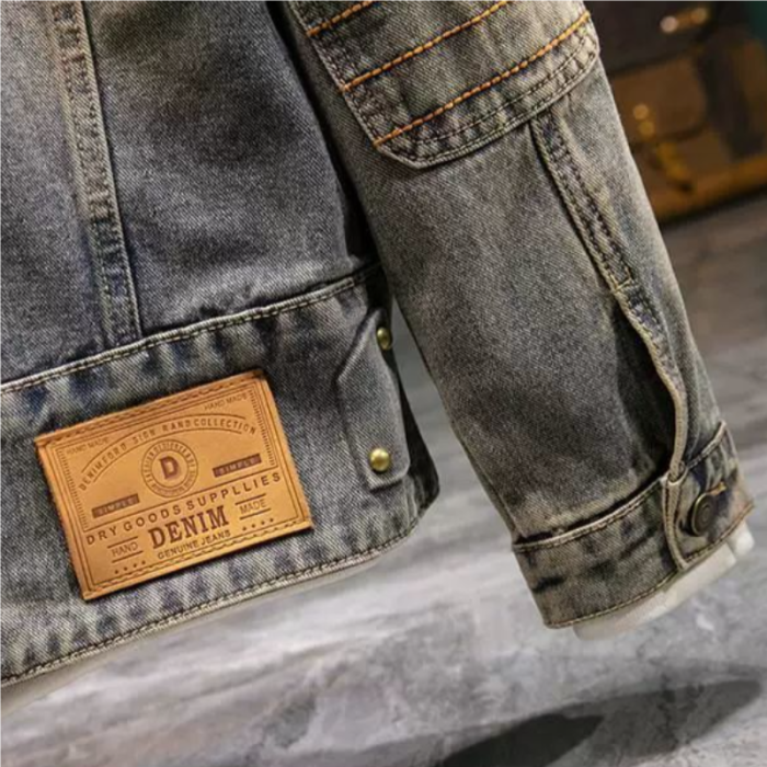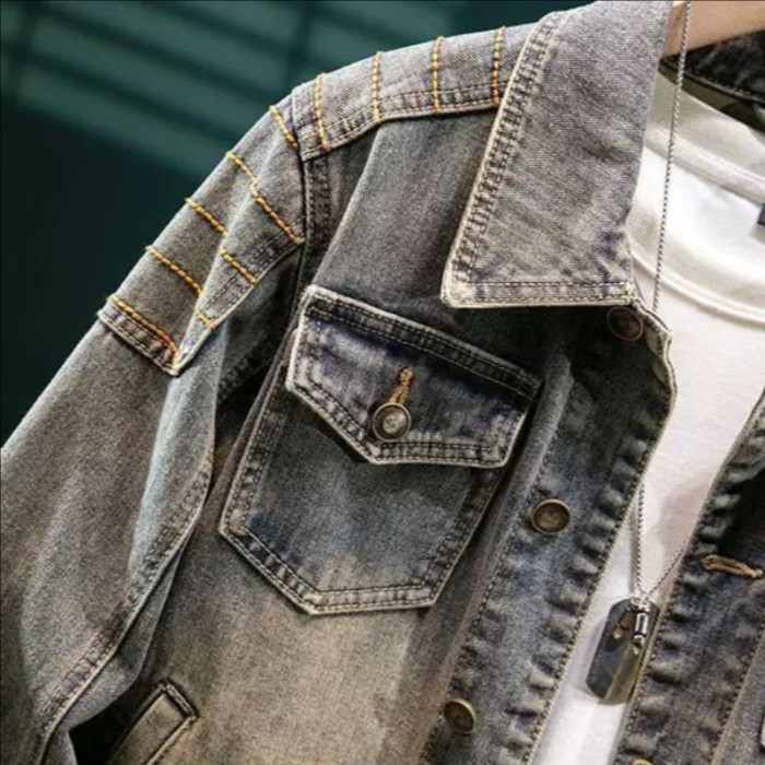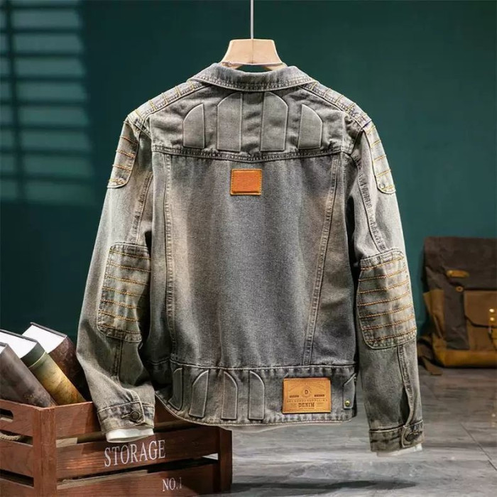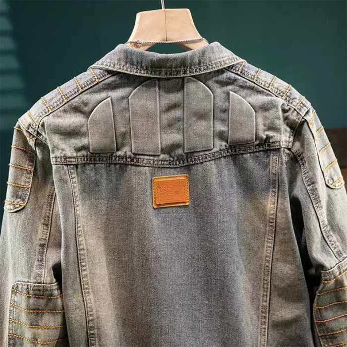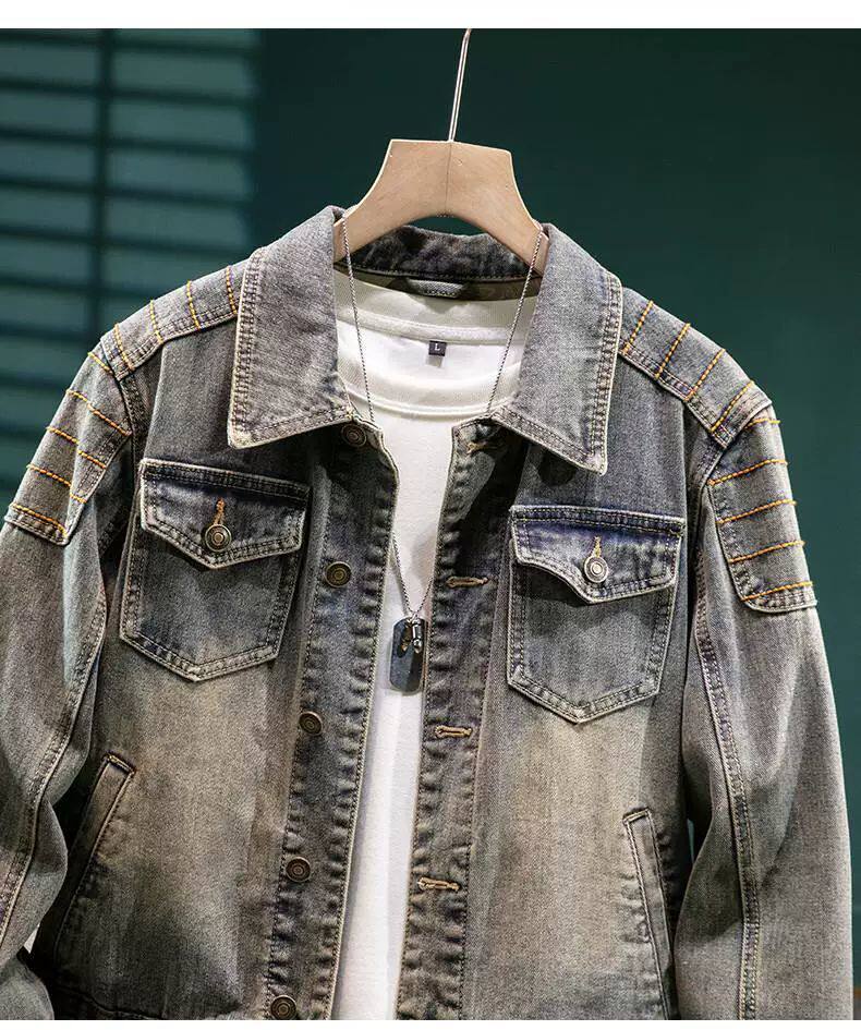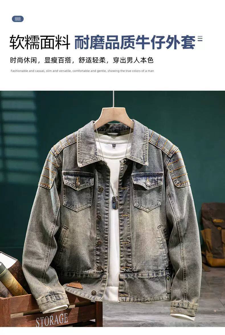 美式復古重磅牛仔外套男款高級設計感壓花修身春秋季厚款機車夾克